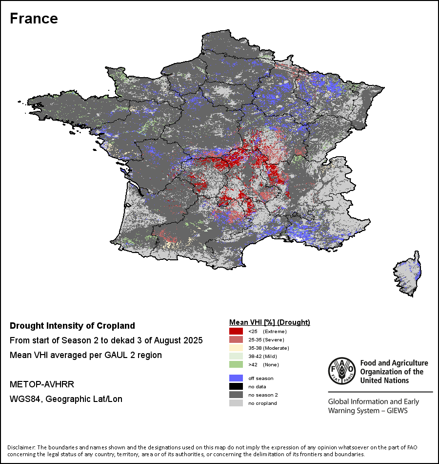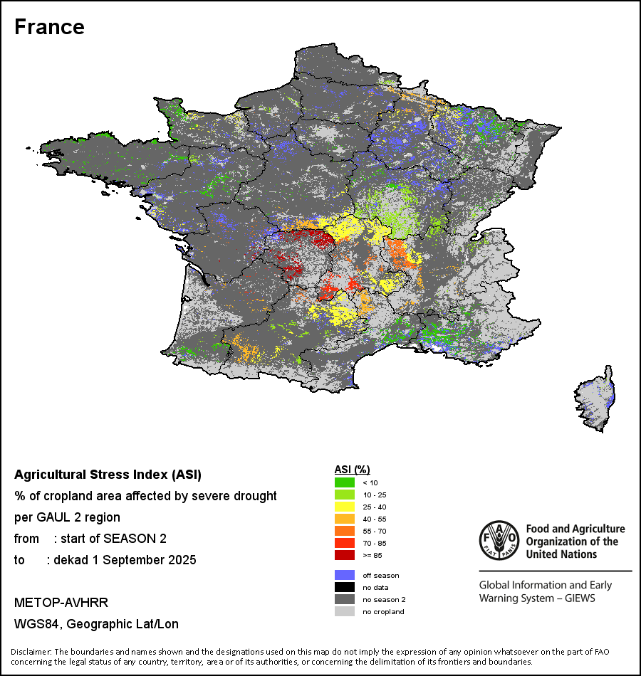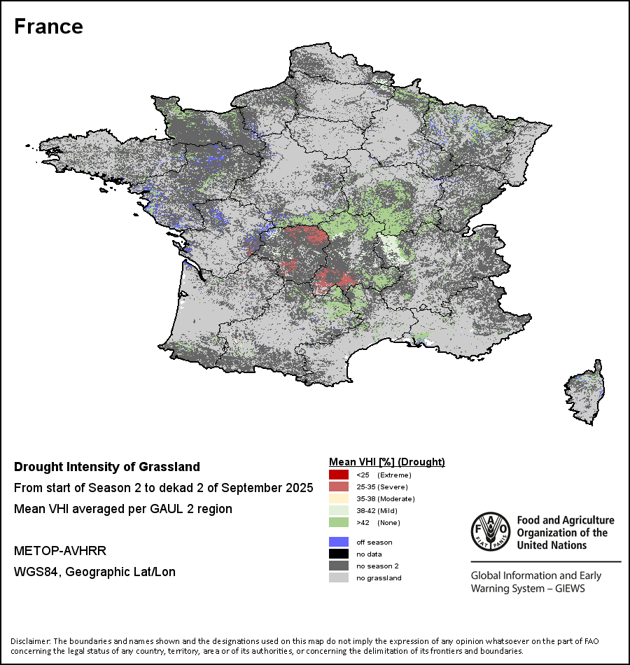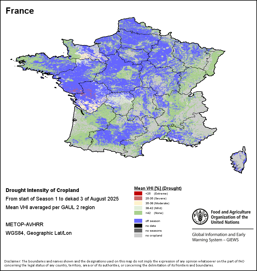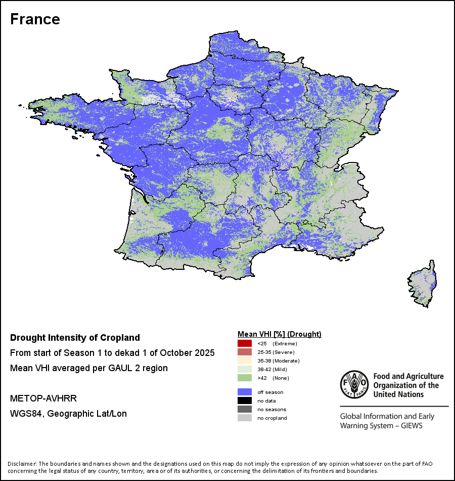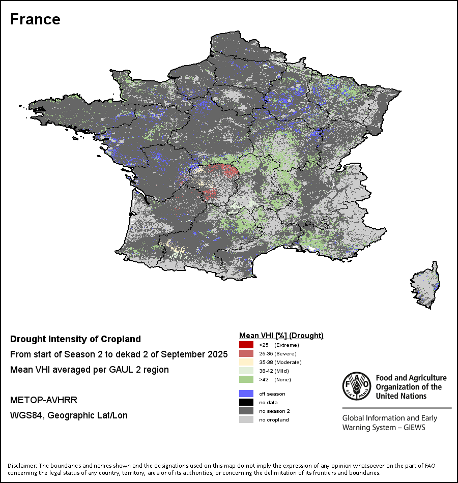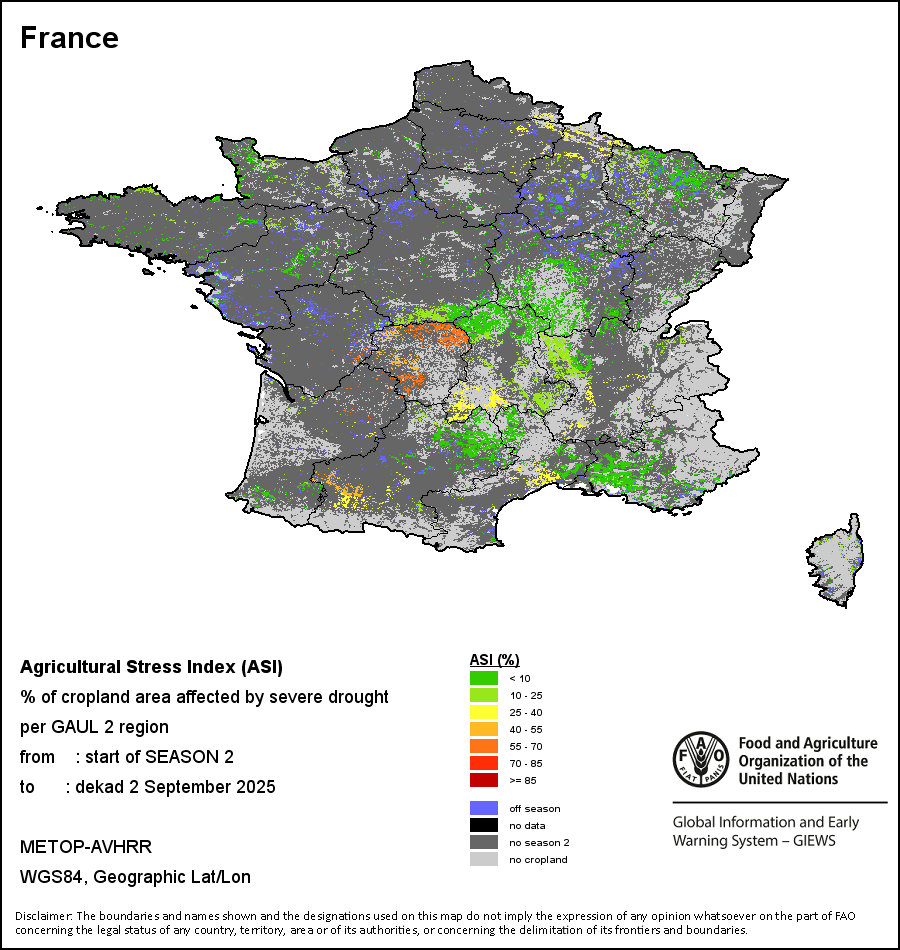 农业干旱依据其强度划分为四类:极端、严重、重度或轻度。干旱的强度通过各全球行政单位分层制度二级区域(GAUL 2)地区累积加权平均植被健康指数计算得出,意味着植被健康状况越差旱情就越严重。