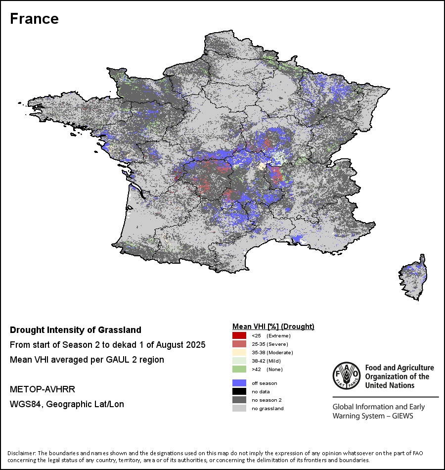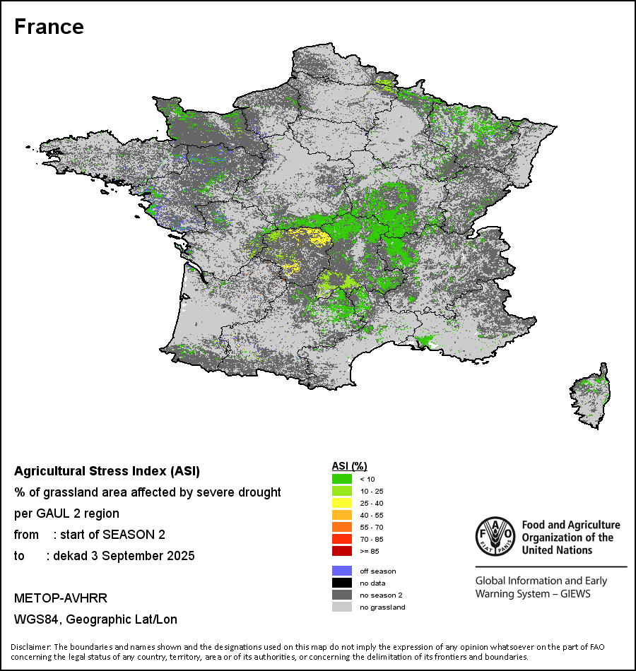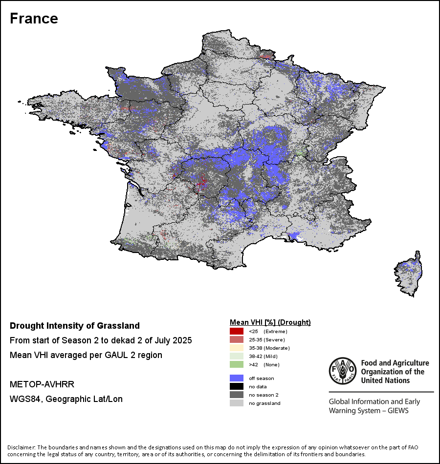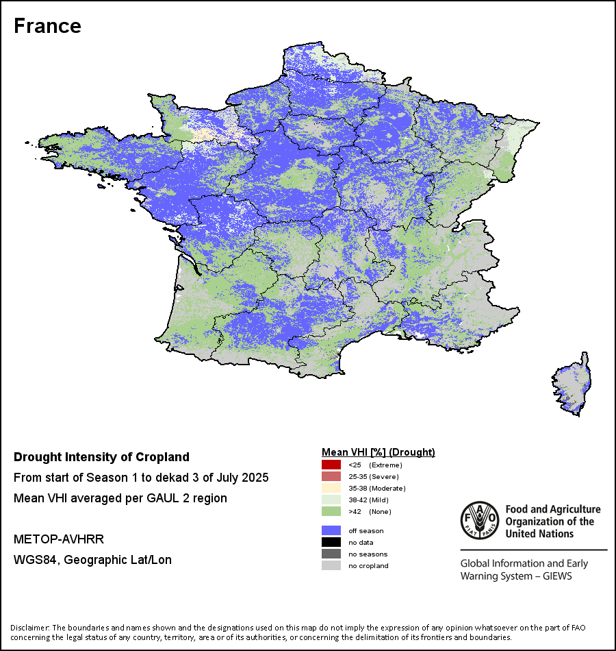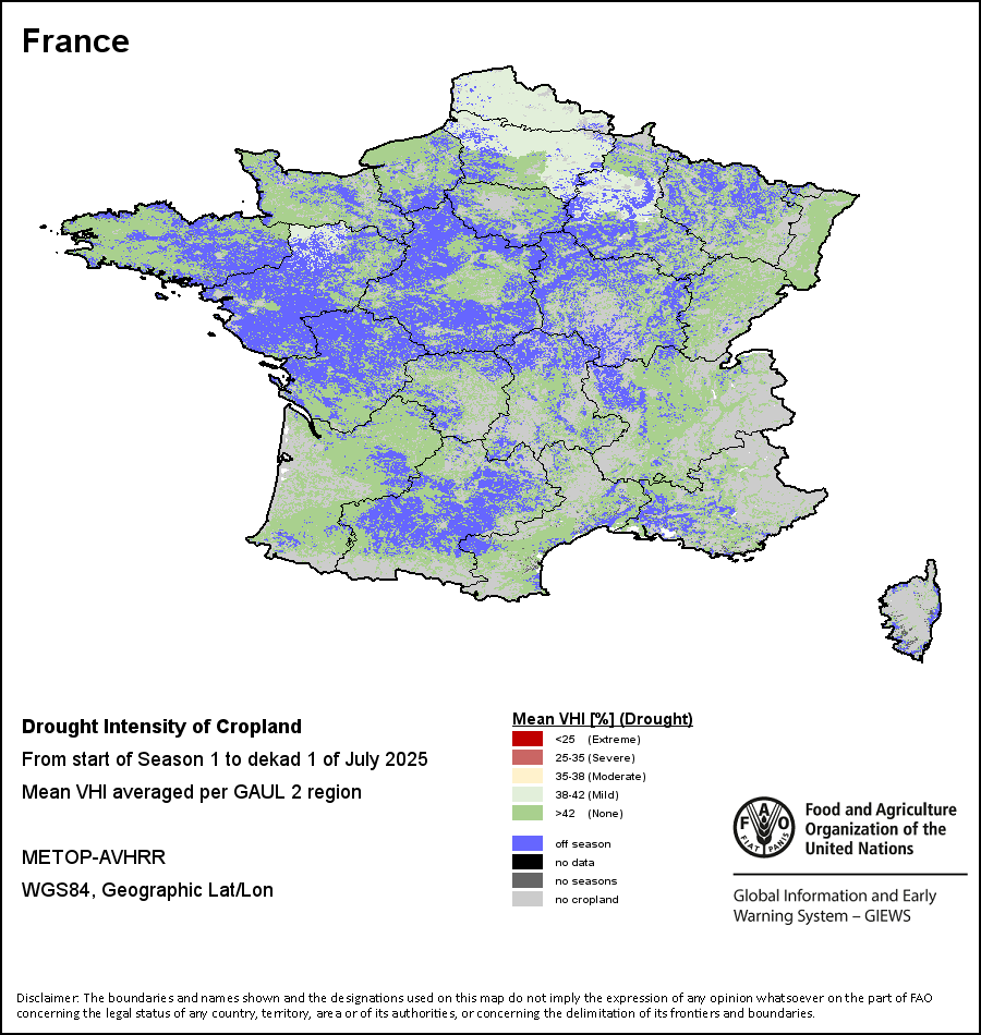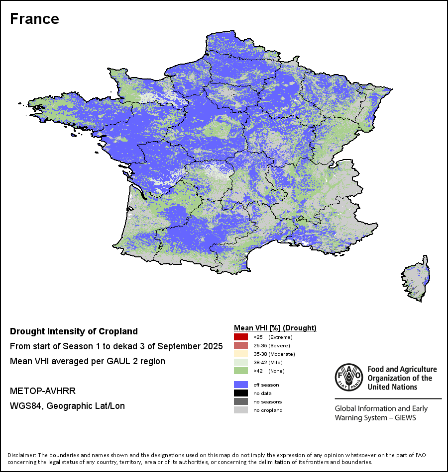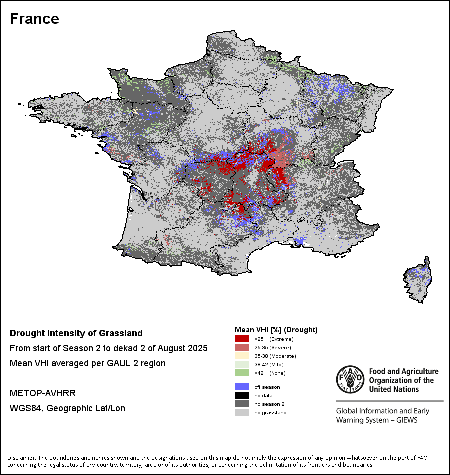 农业干旱依据其强度划分为四类:极端、严重、重度或轻度。干旱的强度通过各全球行政单位分层制度二级区域(GAUL 2)地区累积加权平均植被健康指数计算得出,意味着植被健康状况越差旱情就越严重。