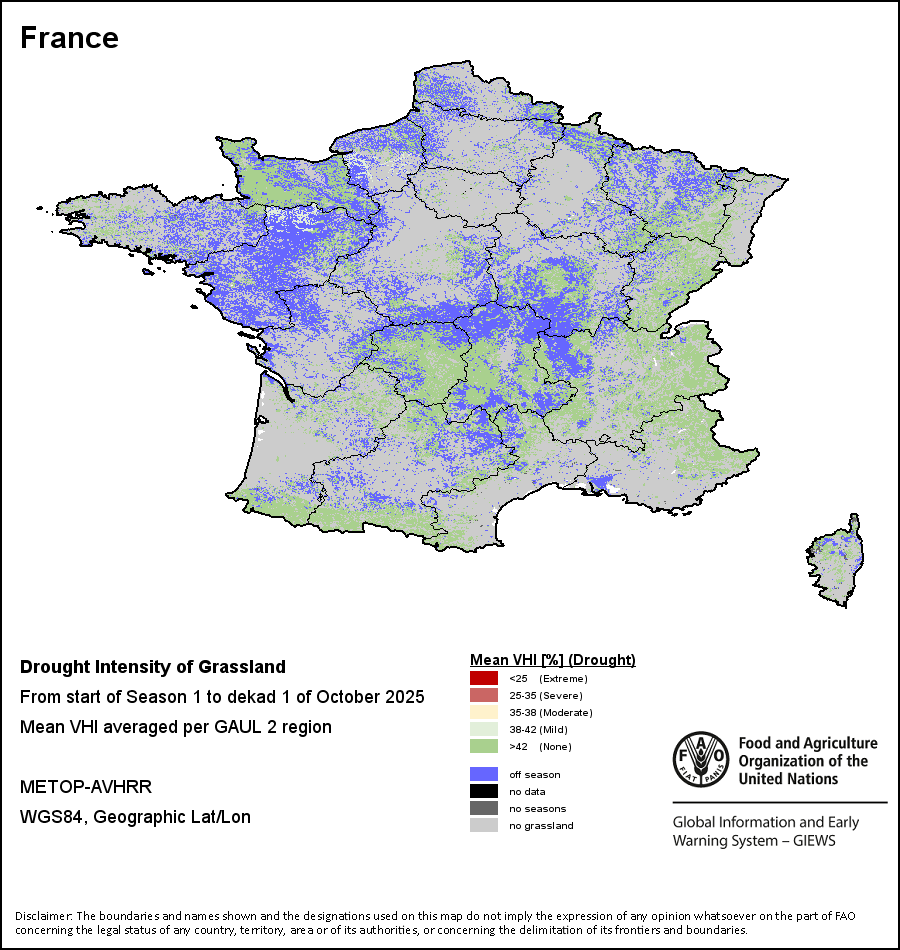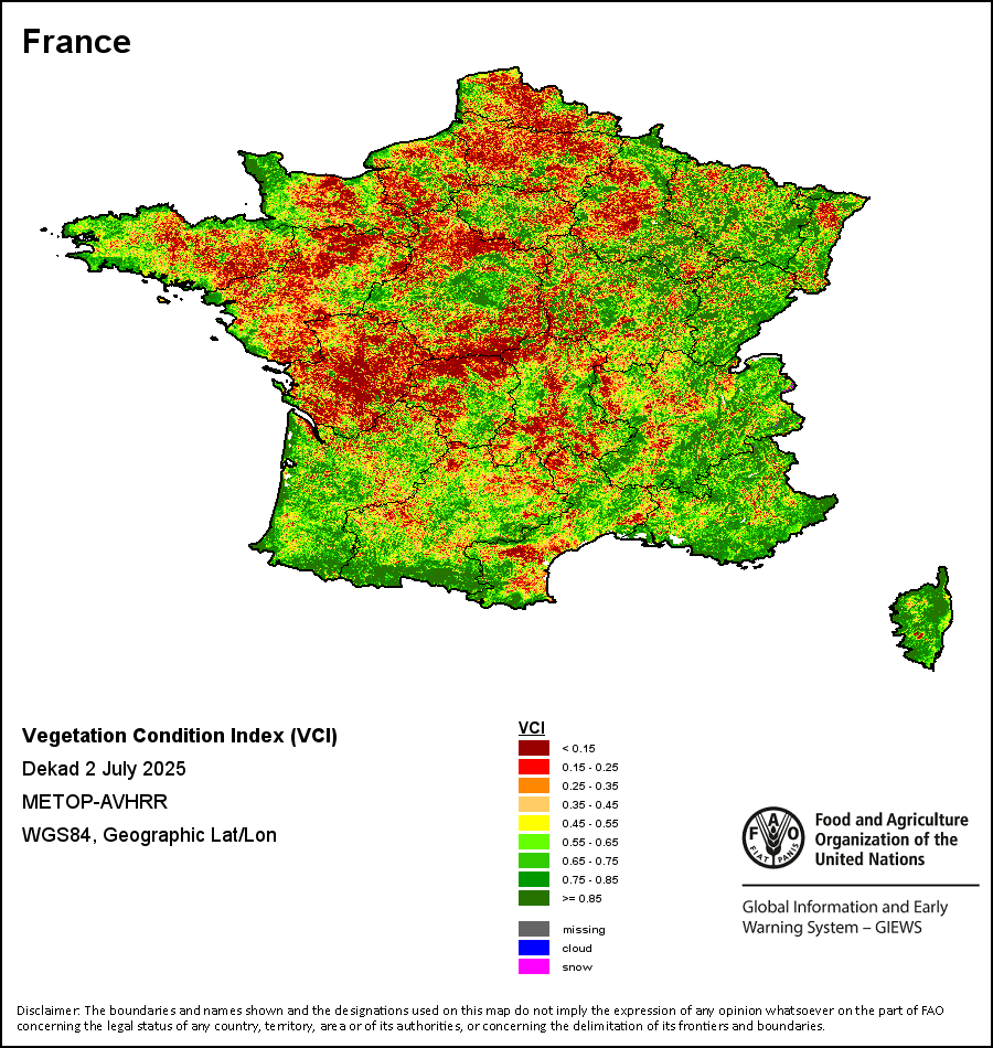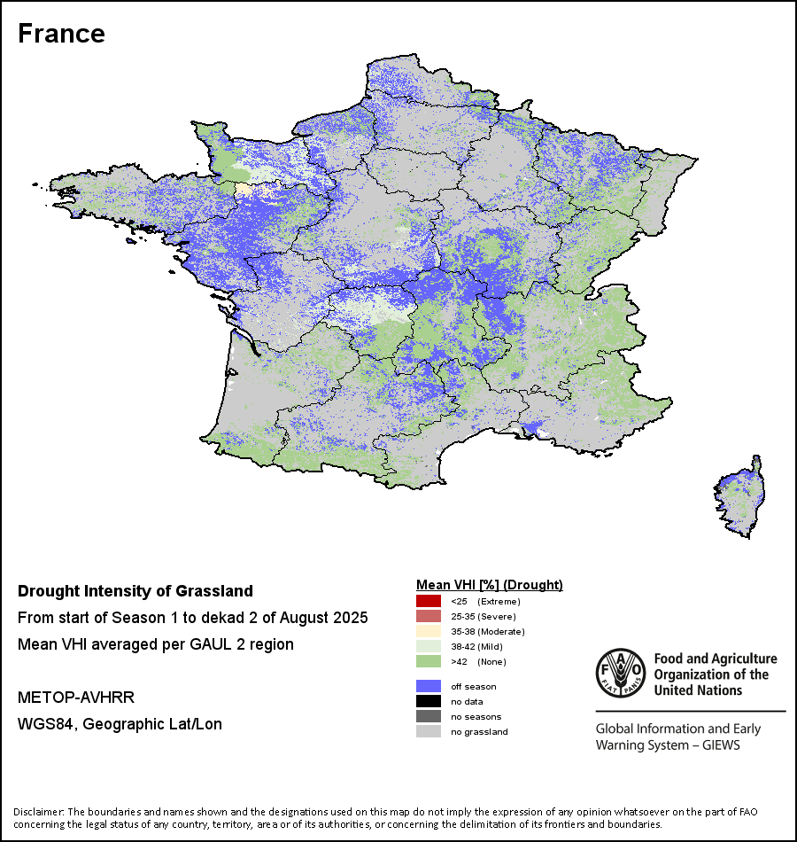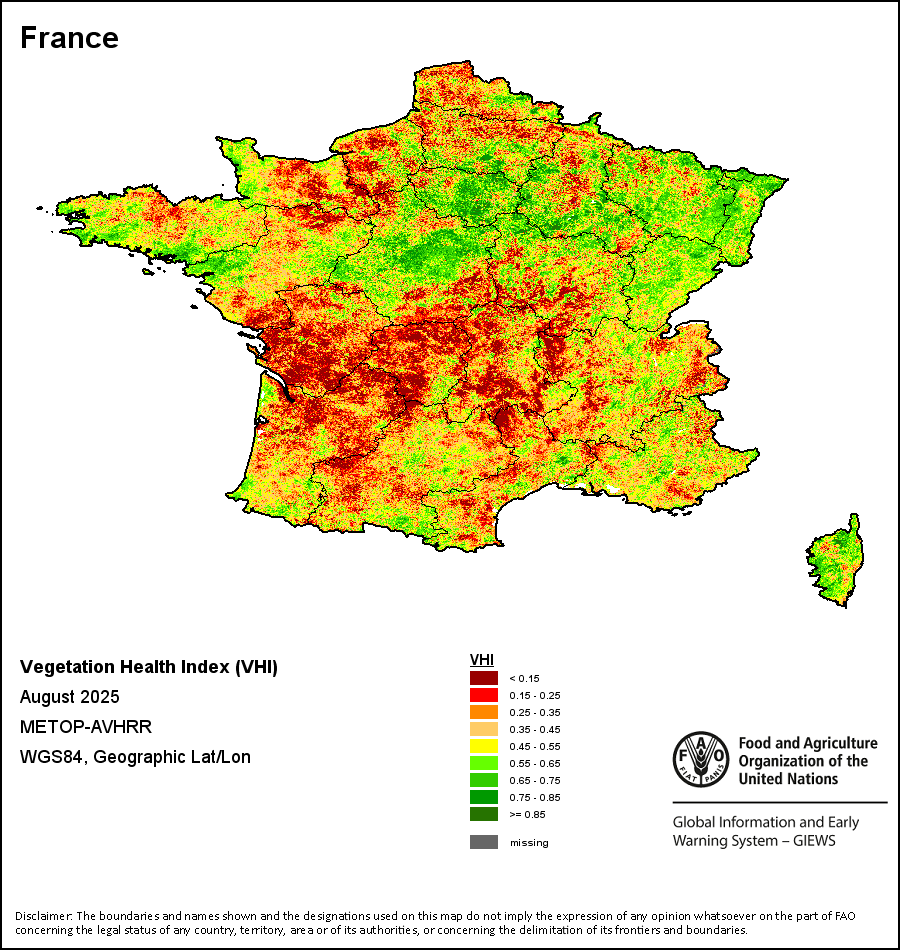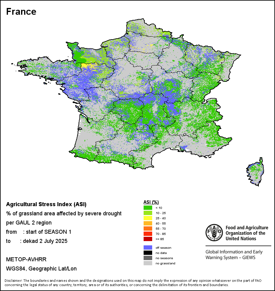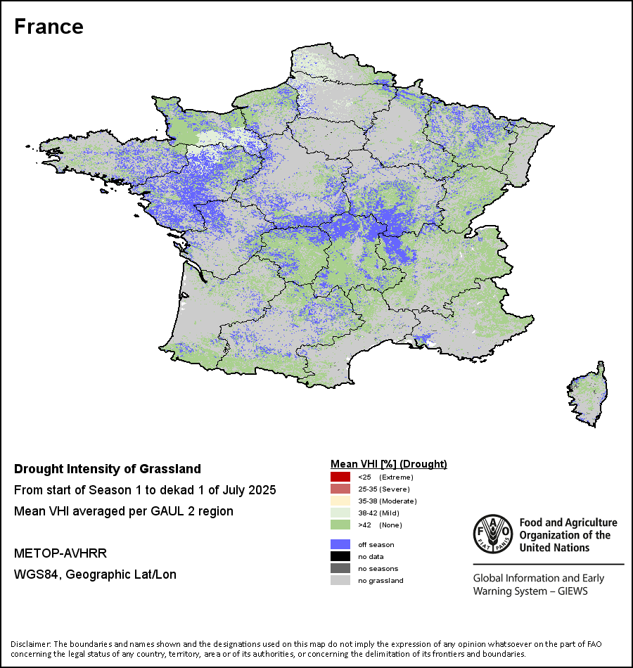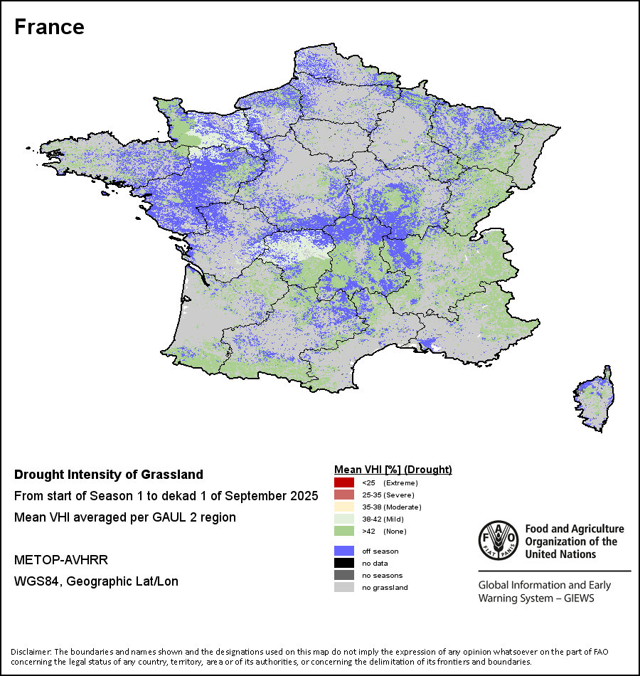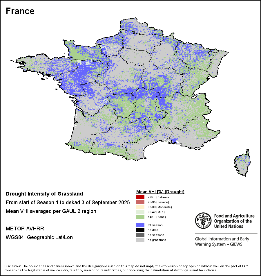 农业干旱依据其强度划分为四类:极端、严重、重度或轻度。干旱的强度通过各全球行政单位分层制度二级区域(GAUL 2)地区累积加权平均植被健康指数计算得出,意味着植被健康状况越差旱情就越严重。