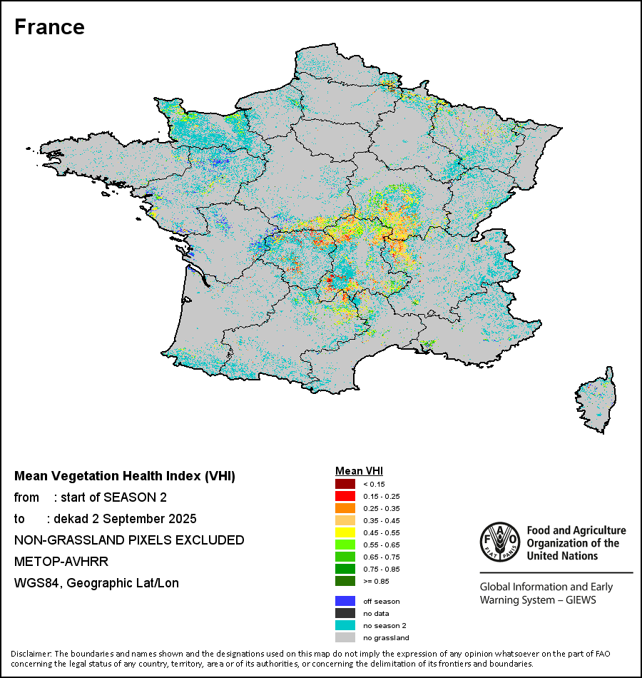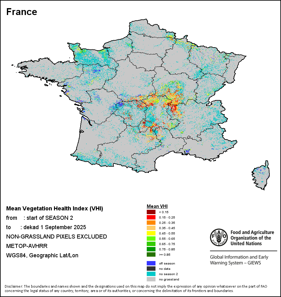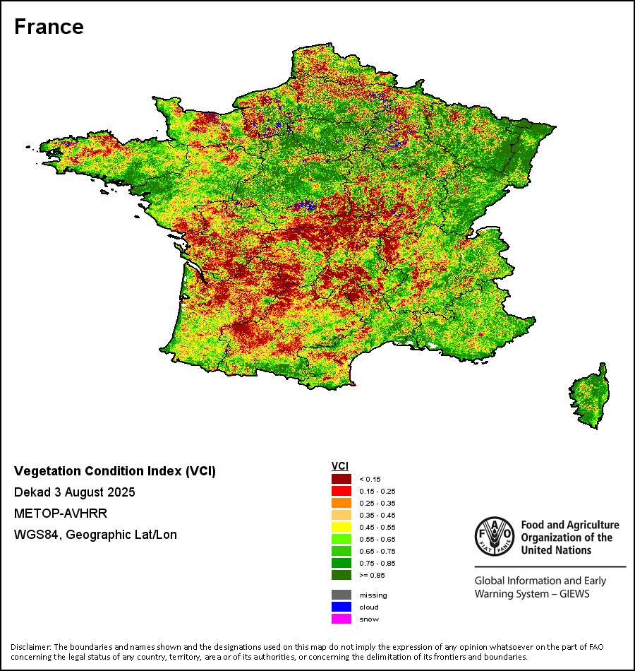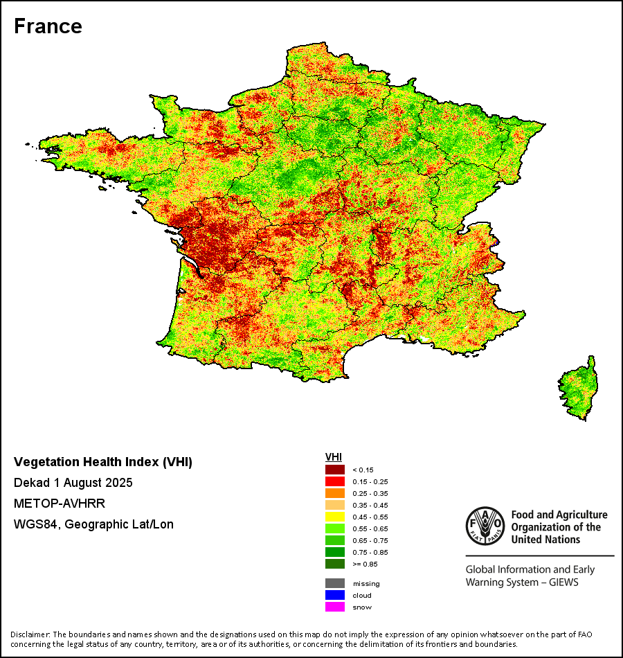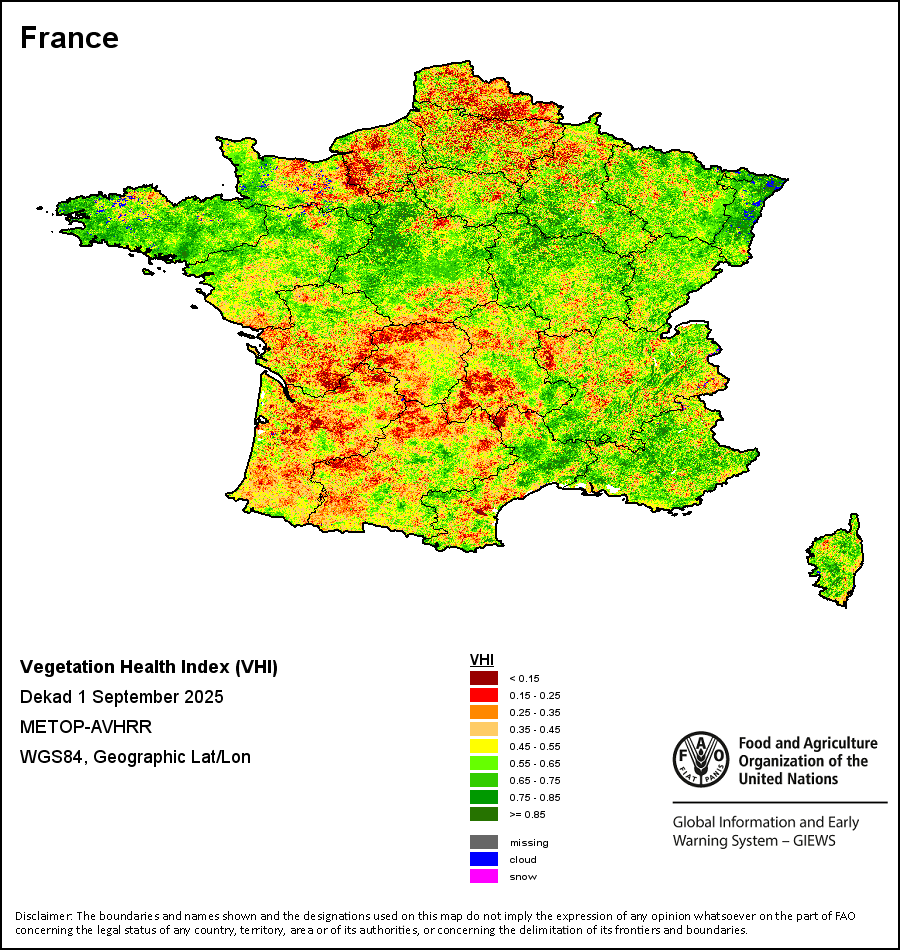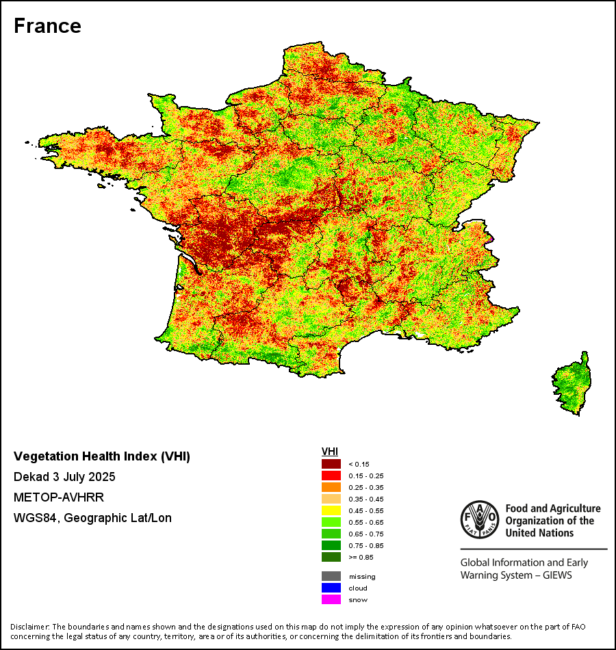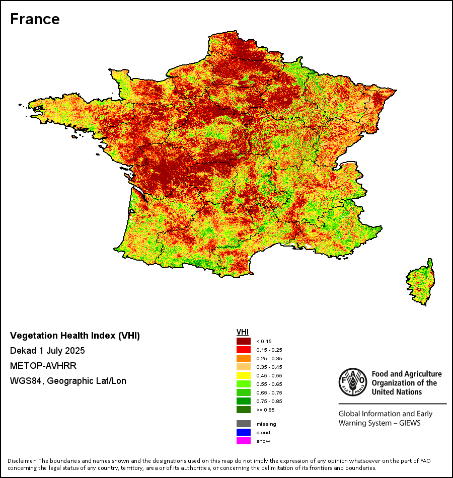 农业干旱依据其强度划分为四类:极端、严重、重度或轻度。干旱的强度通过各全球行政单位分层制度二级区域(GAUL 2)地区累积加权平均植被健康指数计算得出,意味着植被健康状况越差旱情就越严重。