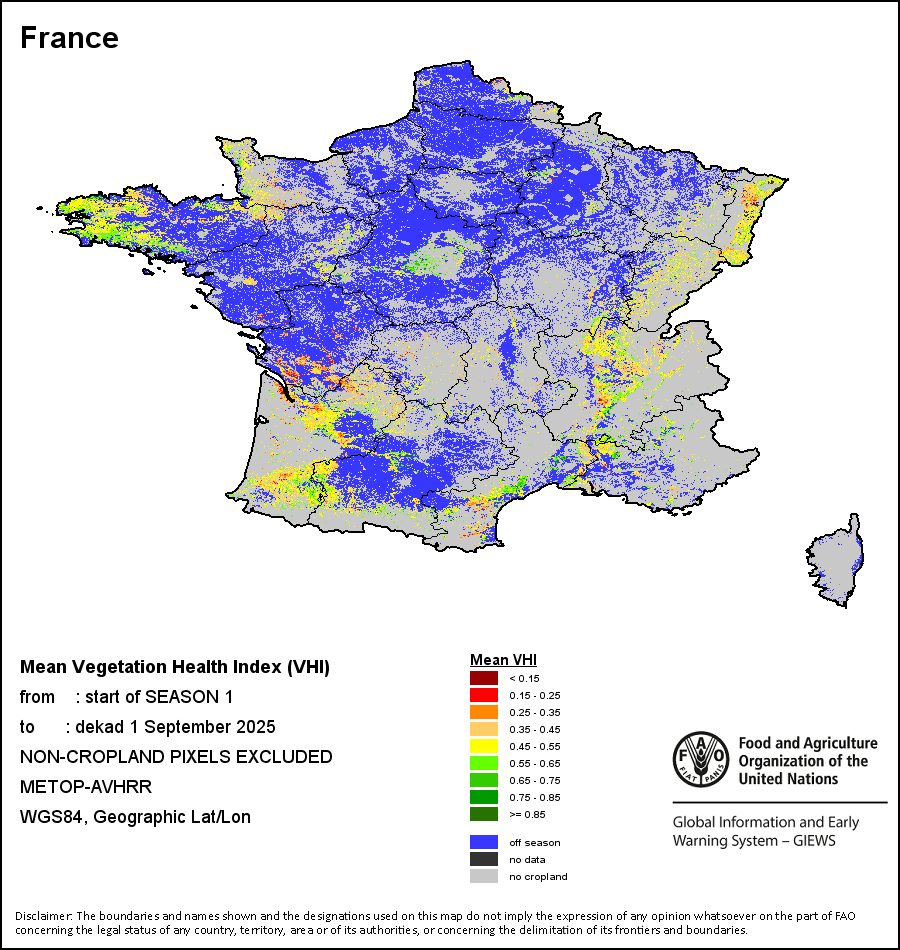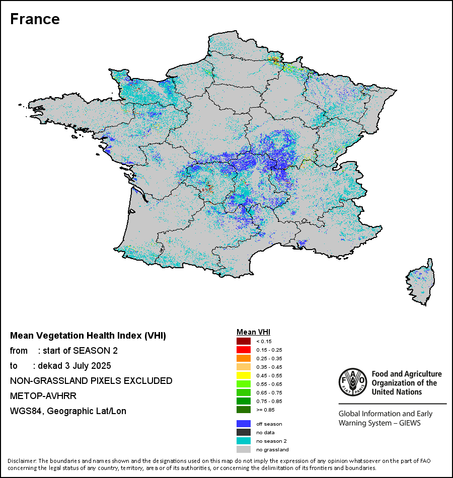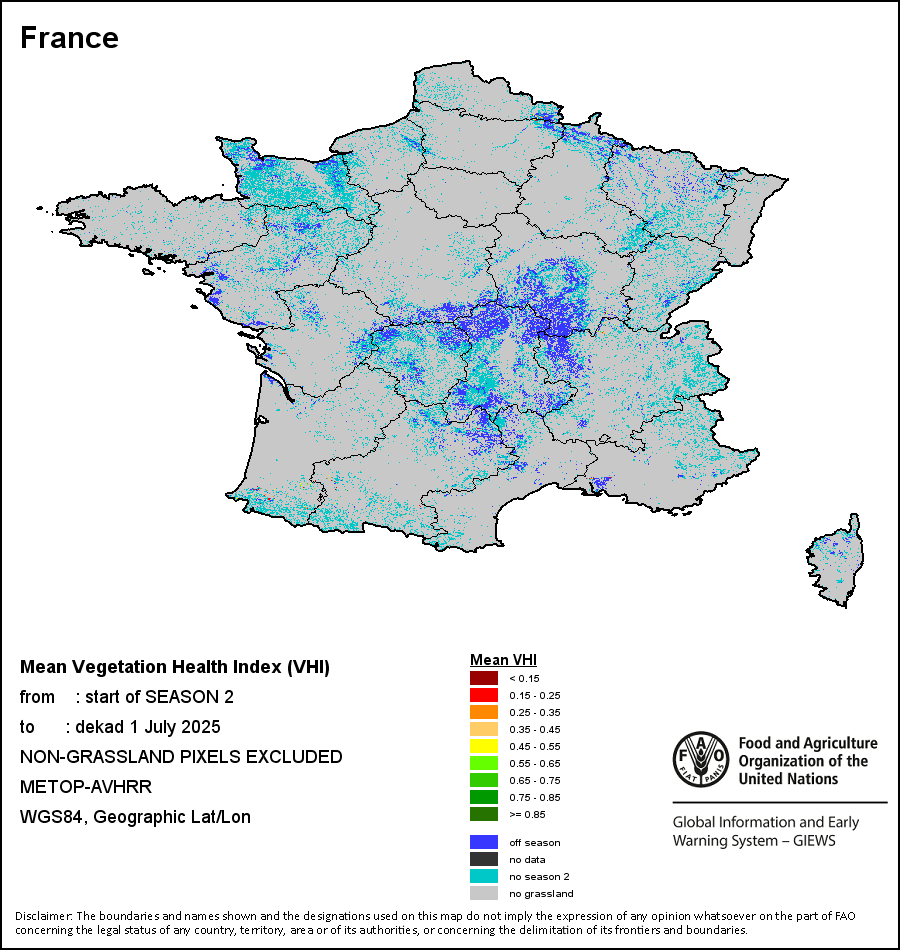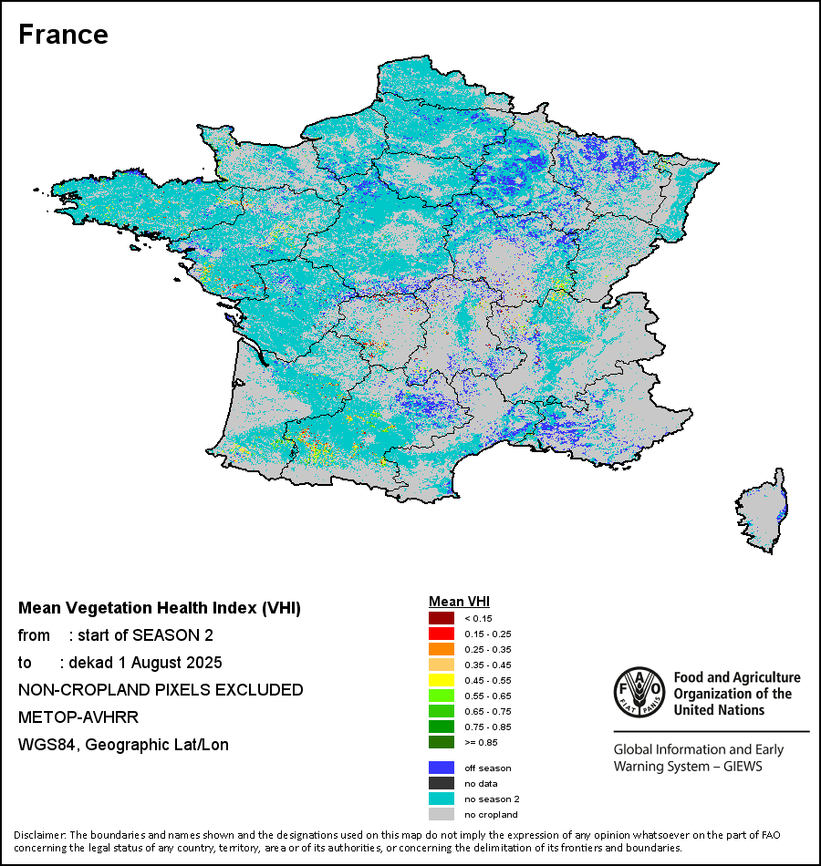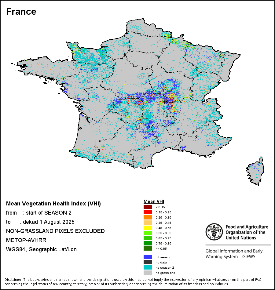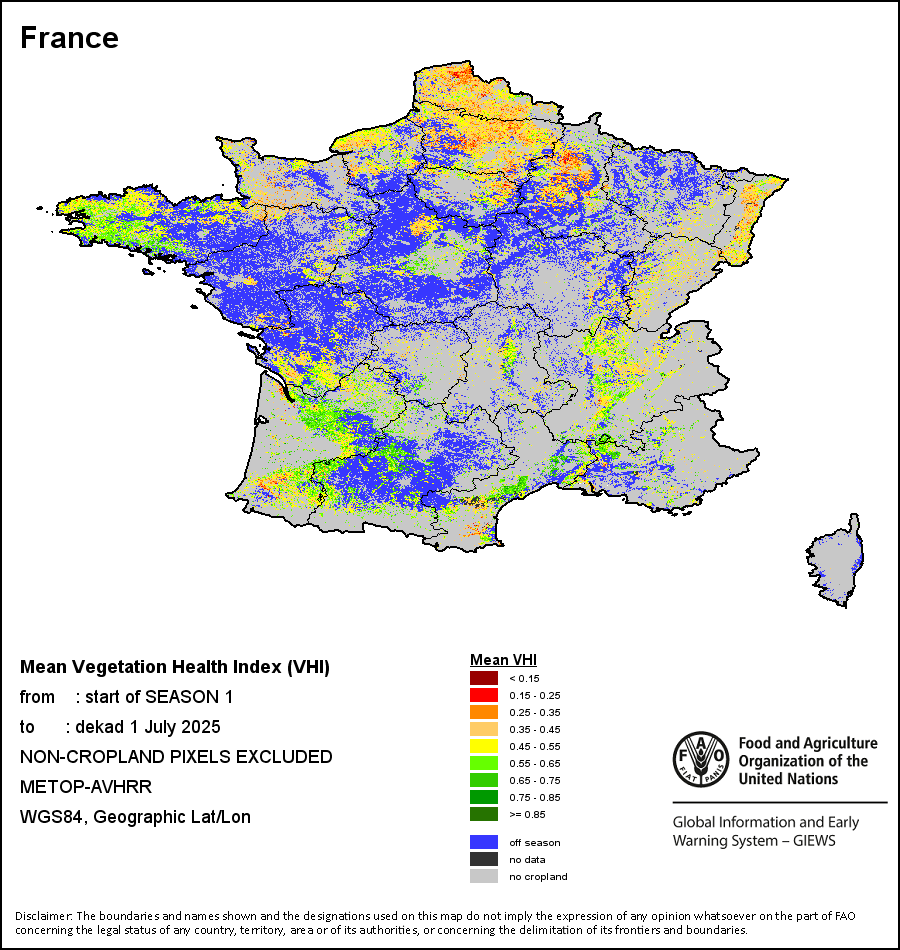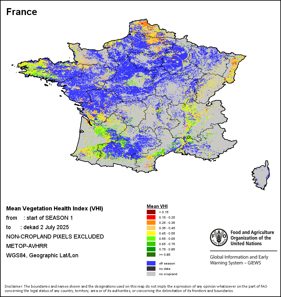 农业干旱依据其强度划分为四类:极端、严重、重度或轻度。干旱的强度通过各全球行政单位分层制度二级区域(GAUL 2)地区累积加权平均植被健康指数计算得出,意味着植被健康状况越差旱情就越严重。