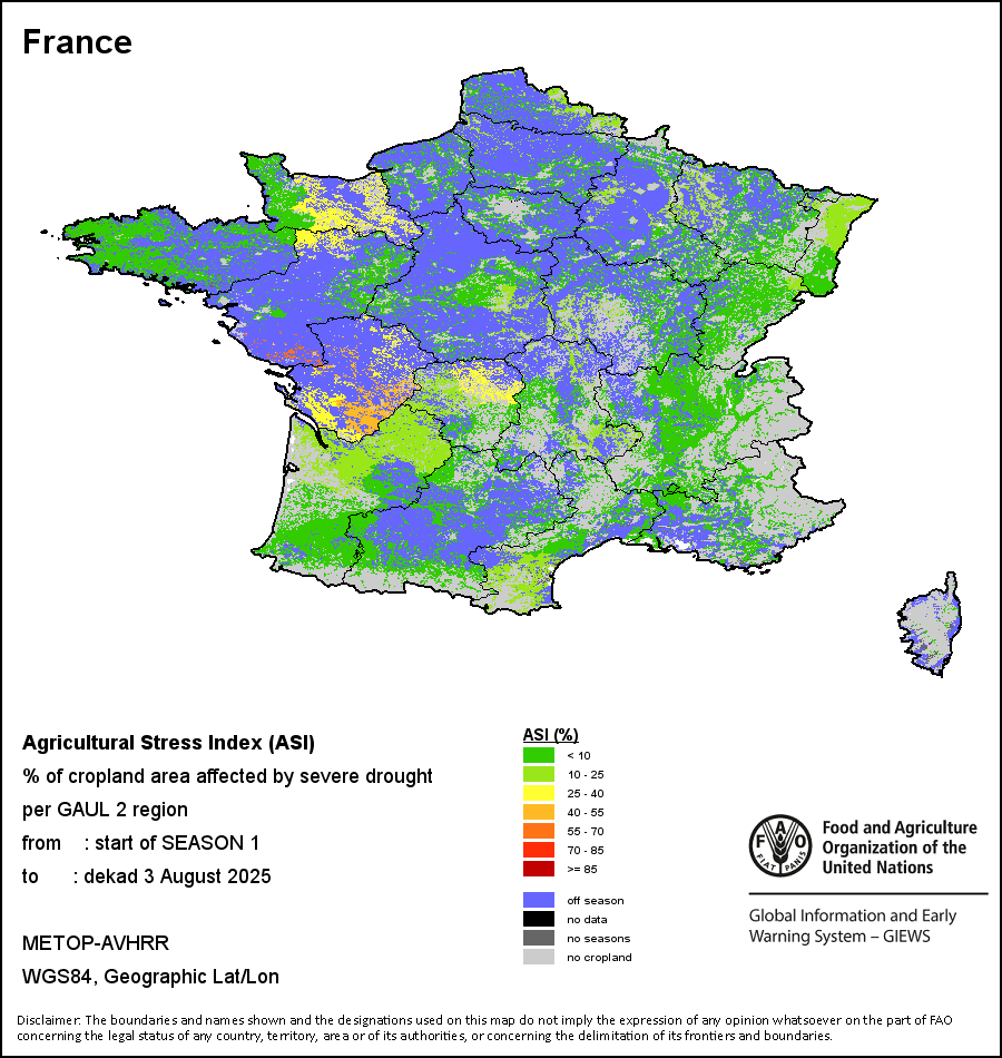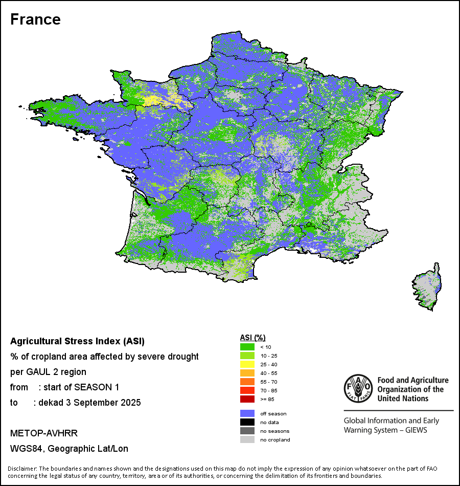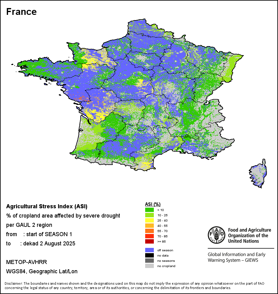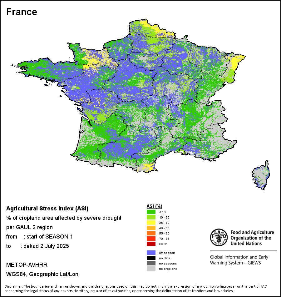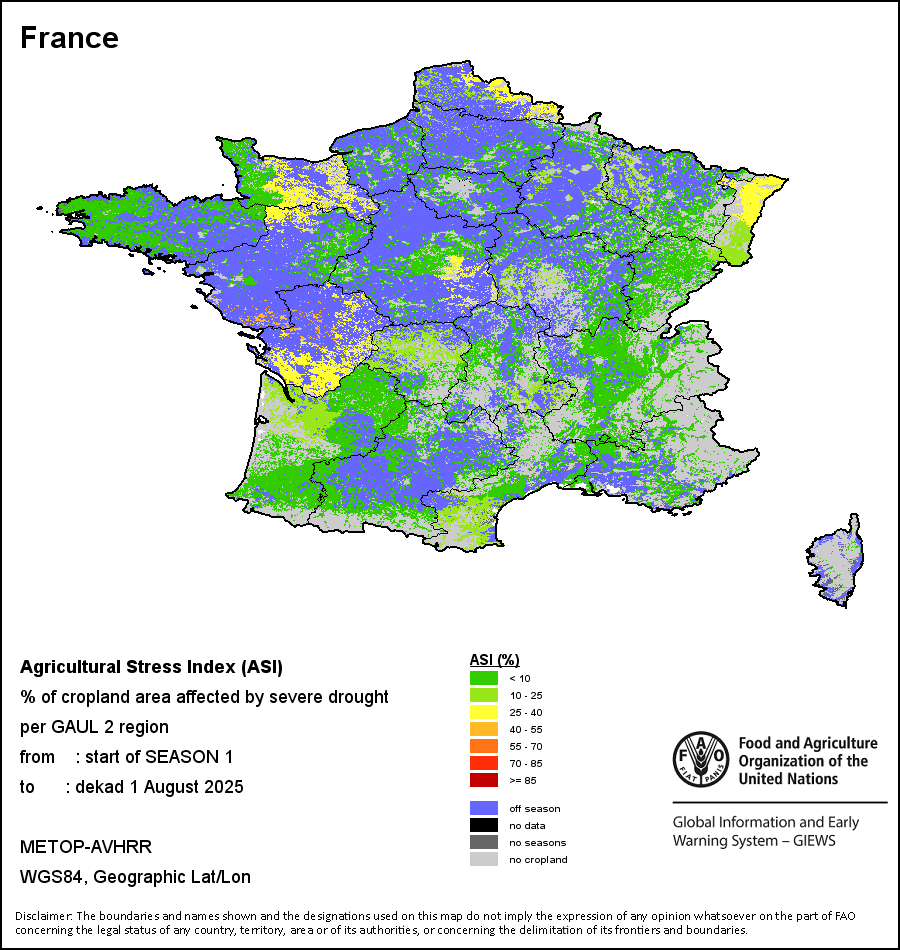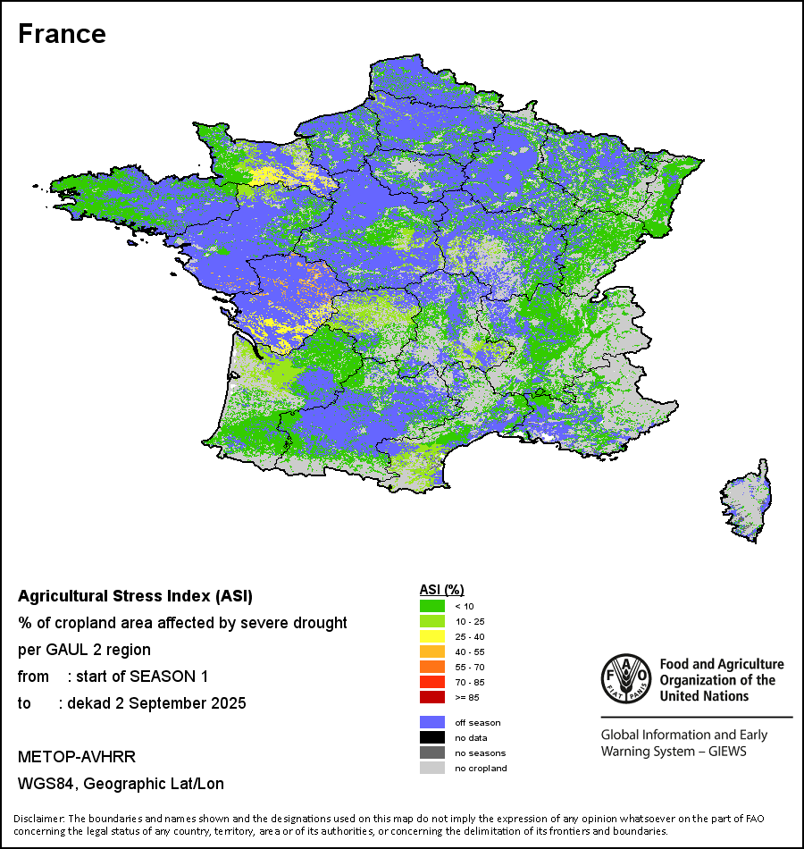 农业干旱胁迫指数(ASI)是一项速览指数,有助于在早期甄别较大可能发生水胁迫(干旱)的耕地。 该指数通过整合植被健康指数(VHI)在评估农业旱情方面具有关键意义的两个维度,即时间和空间维度,而得出。计算农业干旱胁迫指数的第一步是求植被健康指数的时间平均值,对作物周期内旱情的强度和时长进行像素级评估;这项计算包括采用作物系数衡量某种作物在各物候阶段对干旱胁迫的敏感度。第二步是确定旱情的空间广度,方法是计算植被健康指数值低于35%(Kogan前期研究将这一数值确定为评估干旱程度的临界值,1995年)的耕地的像素百分比。然后把各个行政区域根据受影响面积的百分比进行划分,便于对结果进行快速解读。