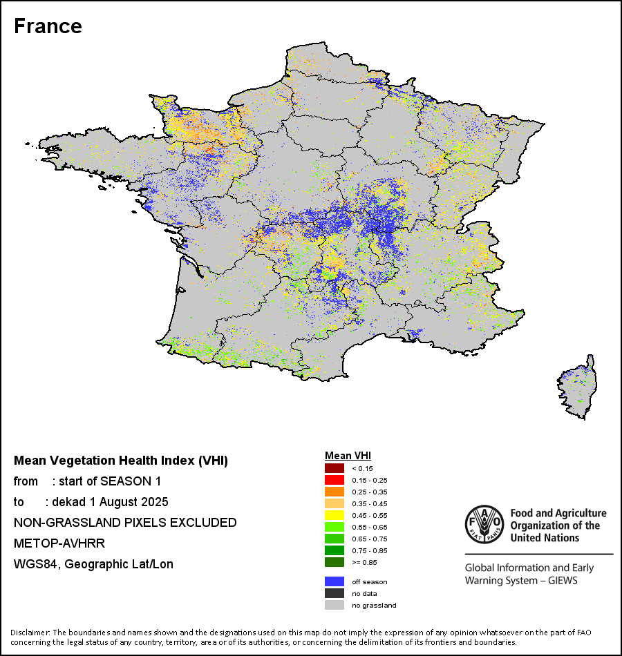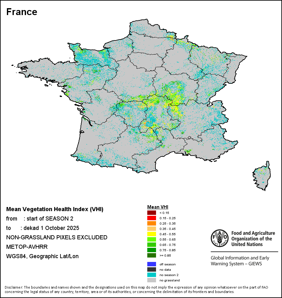 国别地图和图表显示的是最近36个月期间的季节、植被和降水指标。数据按每10天和每月呈现。   更多