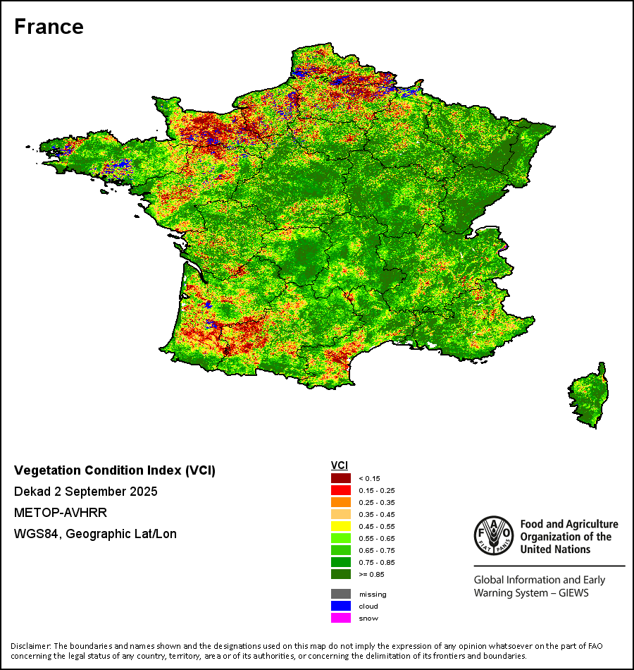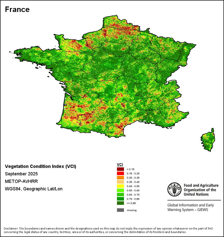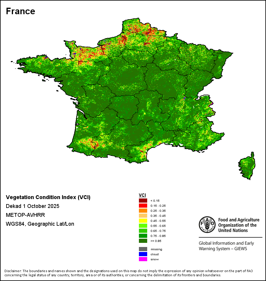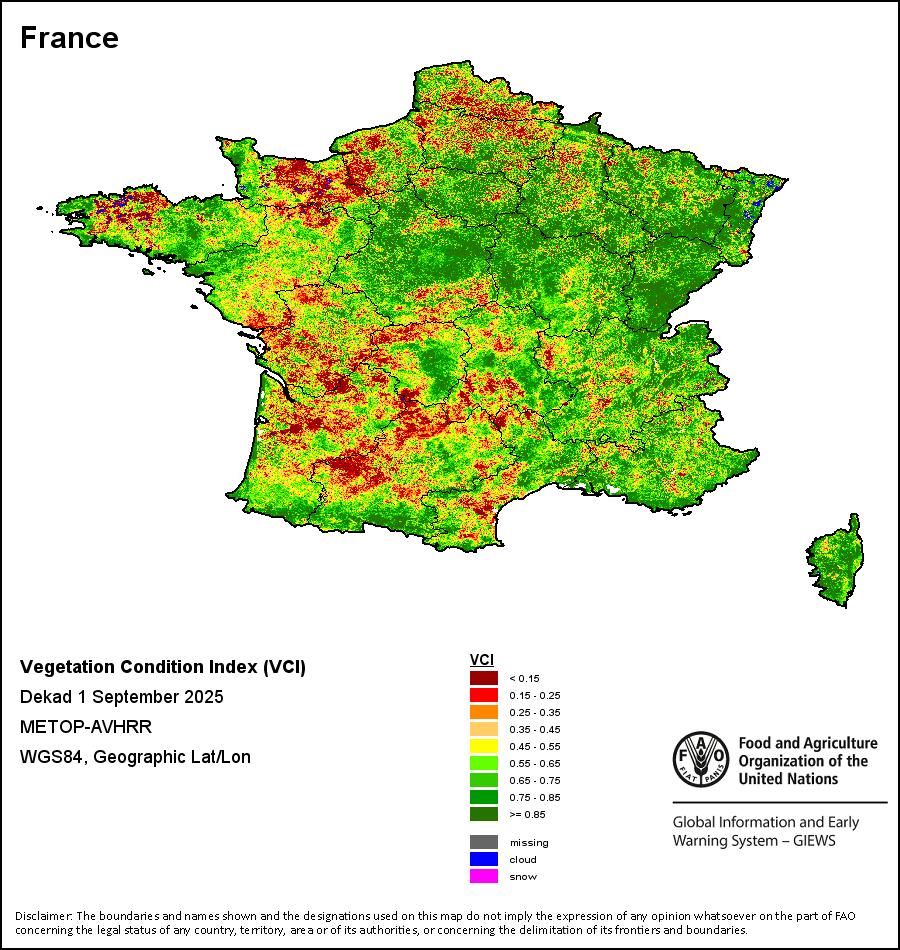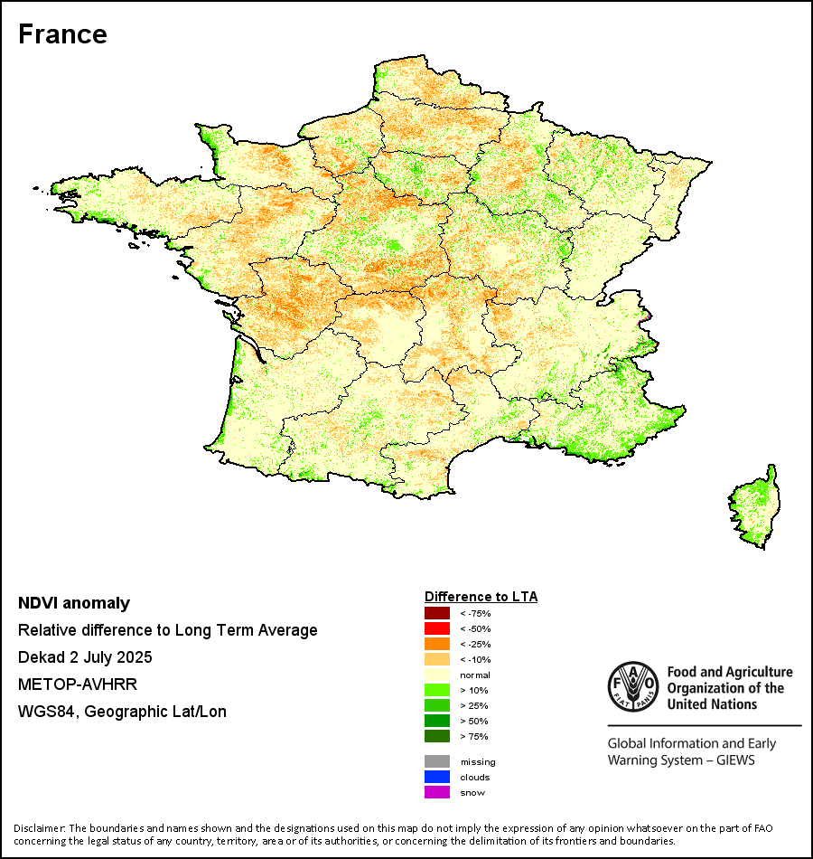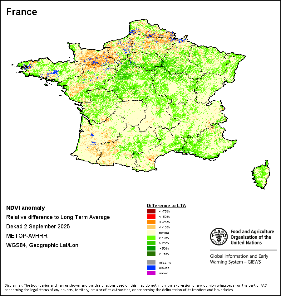 所有三项植被指标都是基于来自METOP-AVHRR遥感卫星分辨率1千米的10天(旬)植被数据(2007年及以后)得出的。1984-2006年期间的1千米分辨率数据得自NOAA-AVHRR16千米分辨率数据集。所有非洲国家的降水量估算(除佛得角和毛里求斯外)均取自NOAA/FEWSNet,其他国家则取自ECMWF。