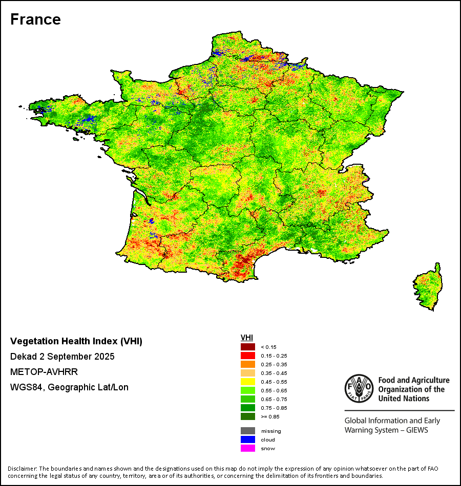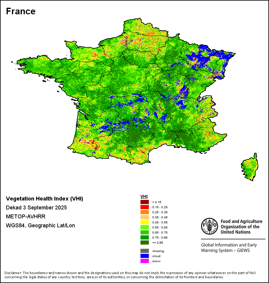 植被健康指数(VHI)根据植被健康状况以及气温对作物状况的影响情况显示干旱的严重程度。 VHI是一项综合指数,是用于计算ASI的基础性指标。它结合了植被状况指数(VCI)和气温状况指数(TCI)。TCI的计算采用了与VCI类似的方程,但它把当前气温与长期最高和最低值联系起来,因为一个假定前提是气温越高就倾向于造成植被状况恶化。比方说,VHI指数下降就意味着植被状况相对较差,而气温越高则意味着植被状况受到胁迫,较长时间延续则成为干旱的指征。VHI映像针对两个主要季节进行计算并分为三种时间模式:旬度、月度和年度。