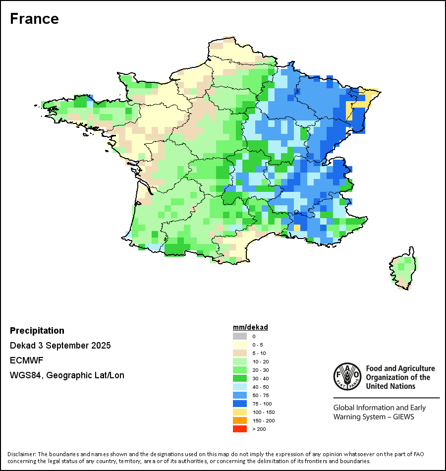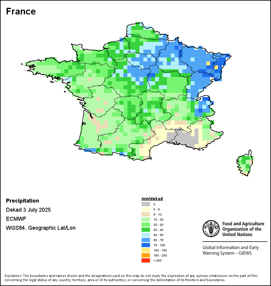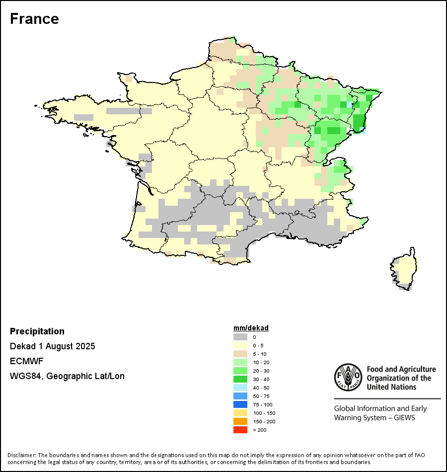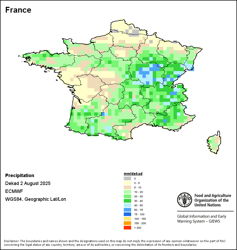该图谱显示了每一旬(十天)的累积降水量。 所有非洲国家的降水量估算(除佛得角和毛里求斯外)均取自NOAA/FEWSNet,其他国家则取自ECMWF。