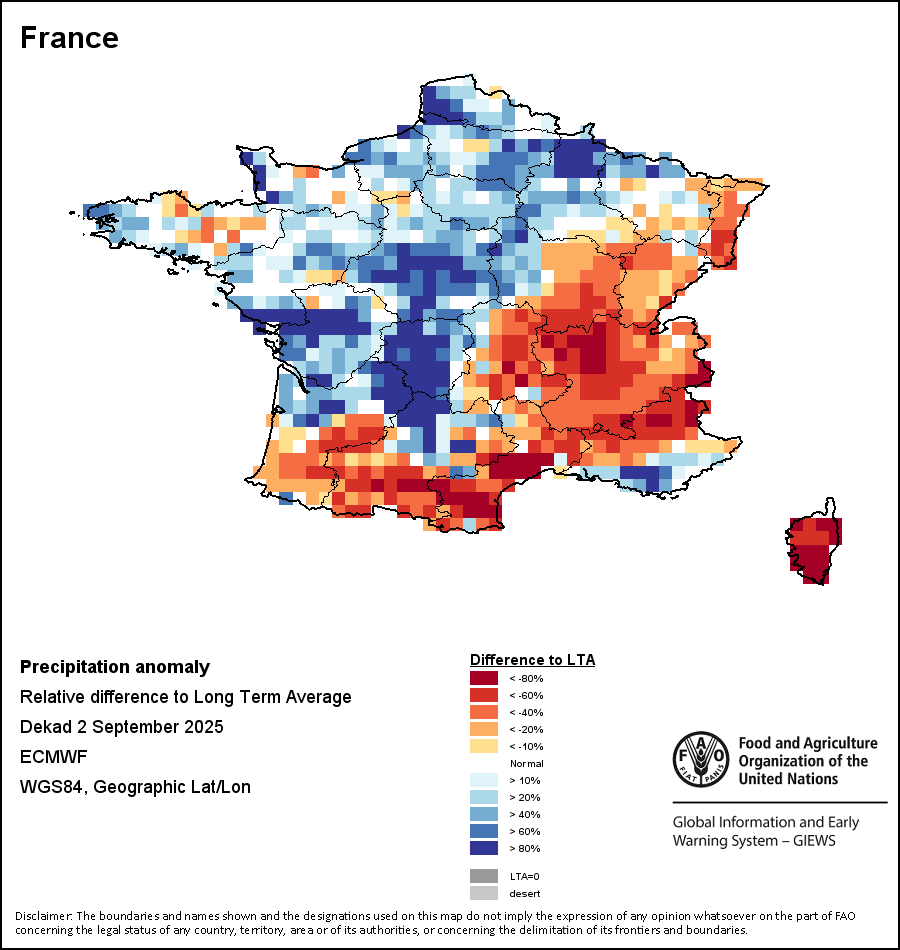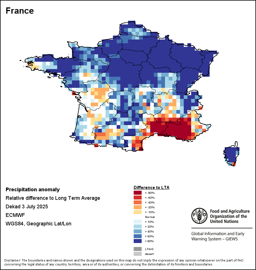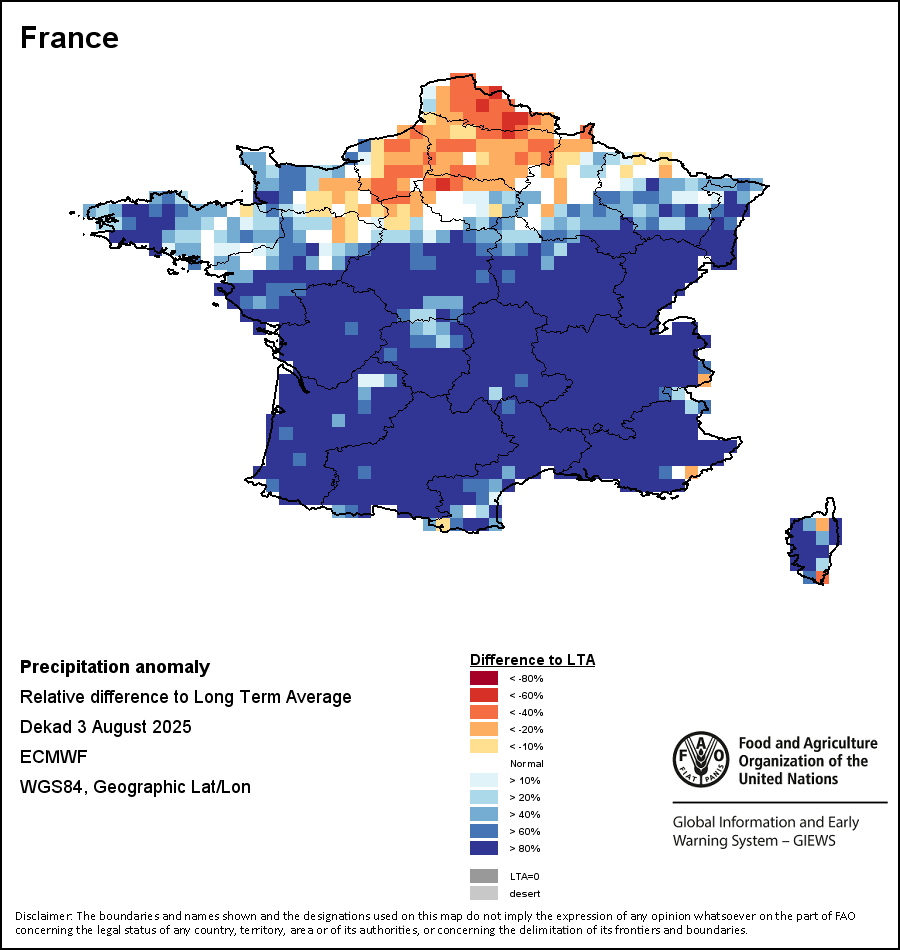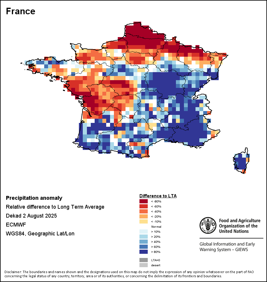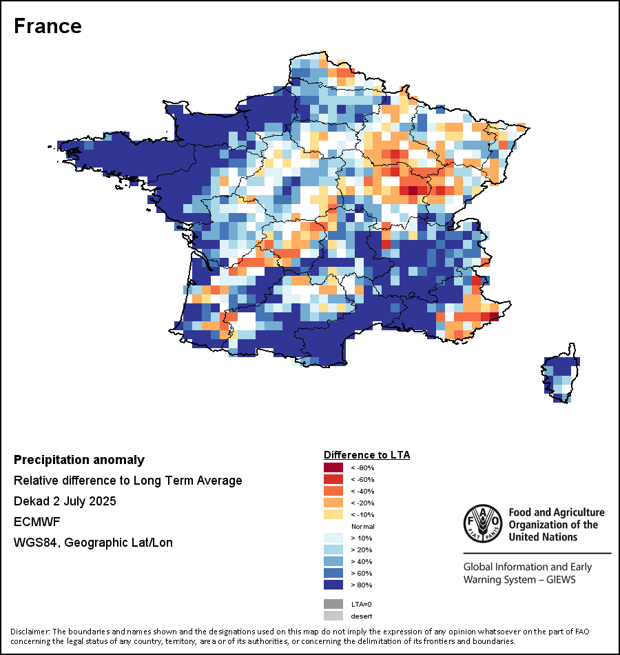 该图谱显示了当前降水量与平均水平之间的差异。 由降水量水平与长期平均值(LTA)进行比较得出,长期平均值系指1989-2015年期间的数值。暖色调指示的是降水量低于平均水平的地区,而冷色调指示的则是降水量高于平均水平的地区。降雨量估算数据来自欧洲中期天气预报这些(ECMWF)。