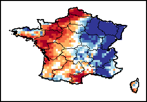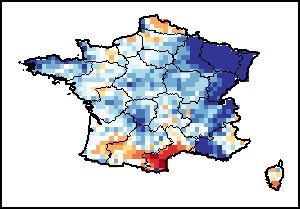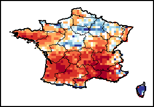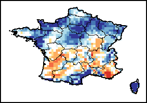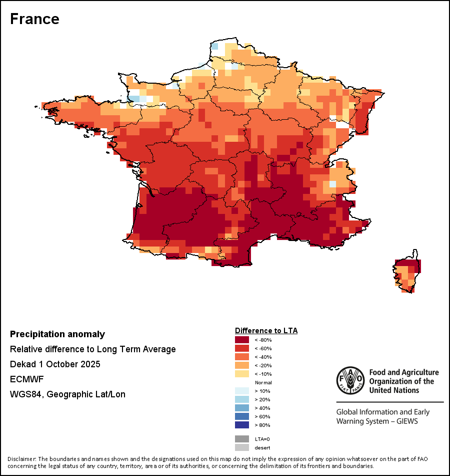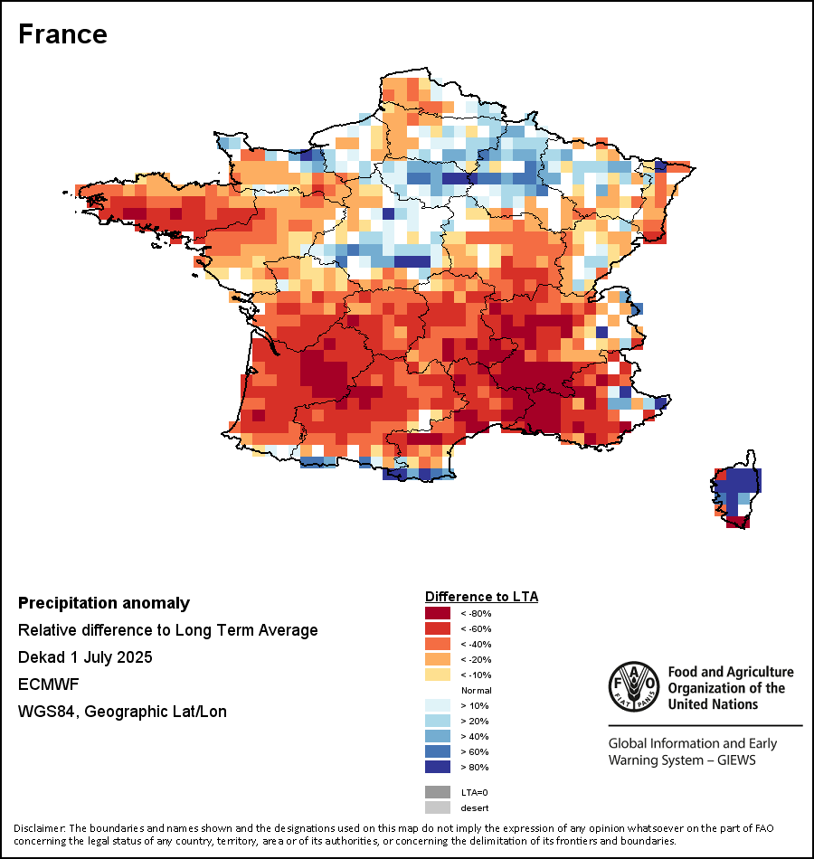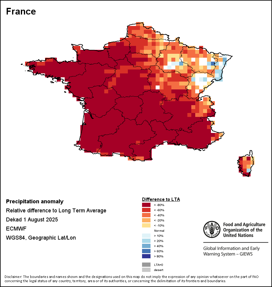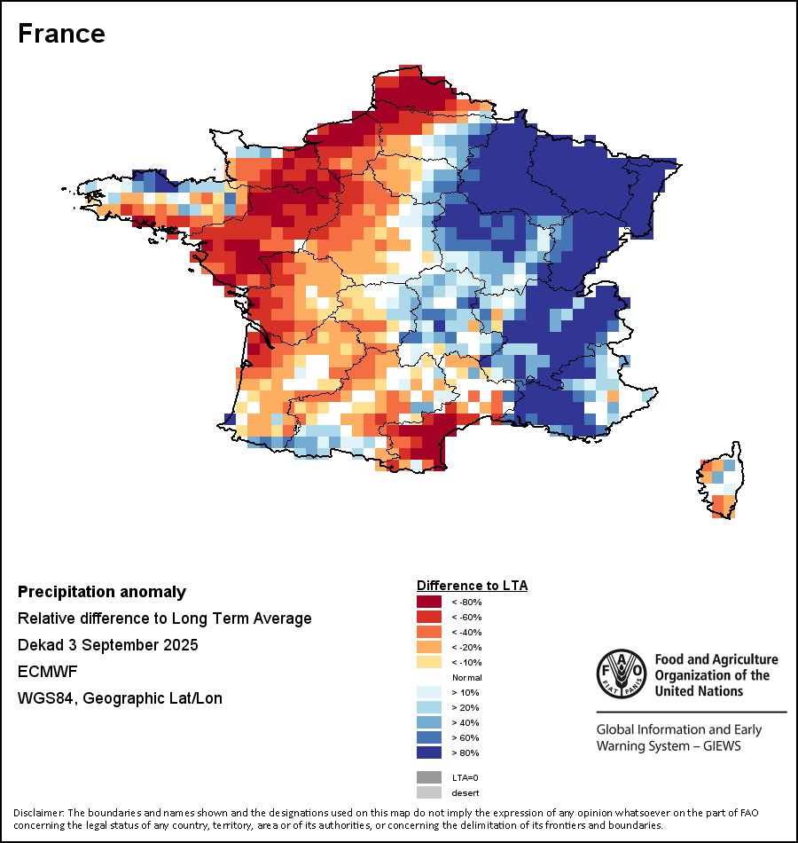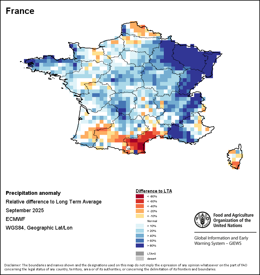 该图谱显示了当前降水量与平均水平之间的差异。 由降水量水平与长期平均值(LTA)进行比较得出,长期平均值系指1989-2015年期间的数值。暖色调指示的是降水量低于平均水平的地区,而冷色调指示的则是降水量高于平均水平的地区。降雨量估算数据来自欧洲中期天气预报这些(ECMWF)。