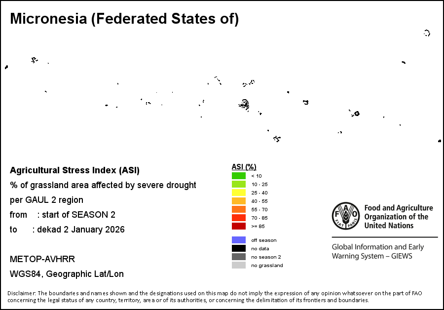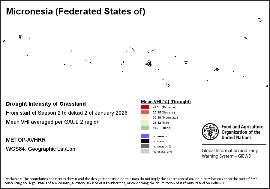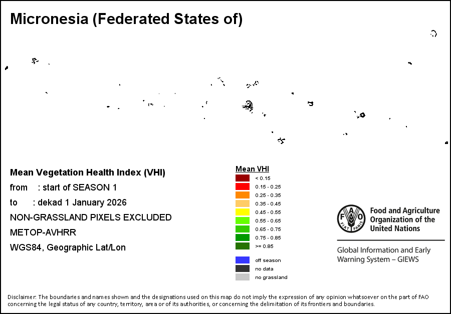 На картах и графиках на уровне страны показывается последний период в 36 месяцев по сезонным показателям, показателям растительного покрова и уровня атмосферных осадков. Данные представляются по 10-дневным периодам и по месяцам. Все три показателя растительного покрова основаны на 10-дневных данных по растительному покрову, полученных от сенсора METOR-AVHRR при разрешении в 1 км (начиная с 2007 года). Данные при разрешении в 1 км за период 1984-2006 гг. были получены из банка данных NOAA-AVHRR при разрешении в 16 км. Оценки атмосферных осадков для всех африканских стран (за исключением Кабо-Верде и Маврикия) получены из системы NOAA/Системы раннего предупреждения об опасности голода (разрешении в 16 km), а по остальным странам данные получены из системы ECMWF (разрешении в 25 km). Благодаря более высокой разрешающей способности показателей состояния растительного покрова (например, NDVI, VHI) по сравнению с показателями осадков, у некоторых стран количество субнациональных единиц, для которых можно получить действительную статистику по данным показателям, больше, чем по показателям осадков.