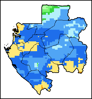 На картах и графиках на уровне страны показывается последний период в 36 месяцев по сезонным показателям, показателям растительного покрова и уровня атмосферных осадков. Данные представляются по 10-дневным периодам и по месяцам. Все три показателя растительного покрова основаны на 10-дневных данных по растительному покрову, полученных от сенсора METOR-AVHRR при разрешении в 1 км (начиная с 2007 года). Данные при разрешении в 1 км за период 1984-2006 гг. были получены из банка данных NOAA-AVHRR при разрешении в 16 км. Оценки атмосферных осадков для всех африканских стран (за исключением Кабо-Верде и Маврикия) получены из системы NOAA/Системы раннего предупреждения об опасности голода (разрешении в 16 km), а по остальным странам данные получены из системы ECMWF (разрешении в 25 km). Благодаря более высокой разрешающей способности показателей состояния растительного покрова (например, NDVI, VHI) по сравнению с показателями осадков, у некоторых стран количество субнациональных единиц, для которых можно получить действительную статистику по данным показателям, больше, чем по показателям осадков.