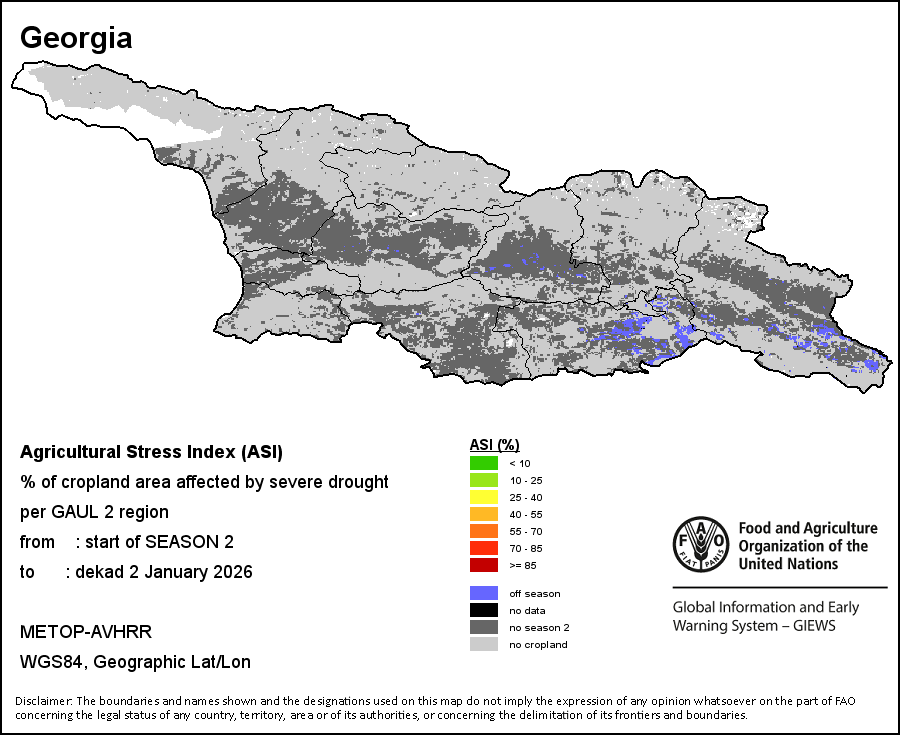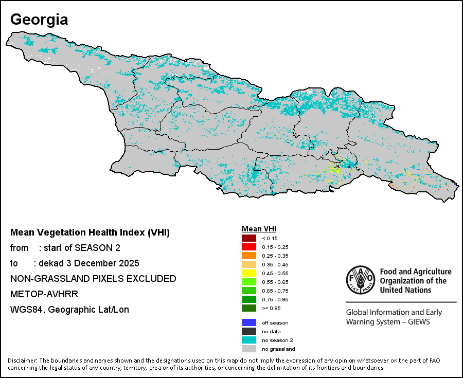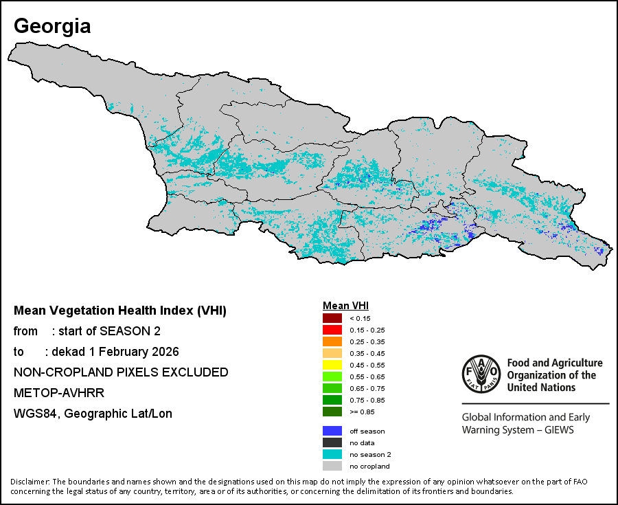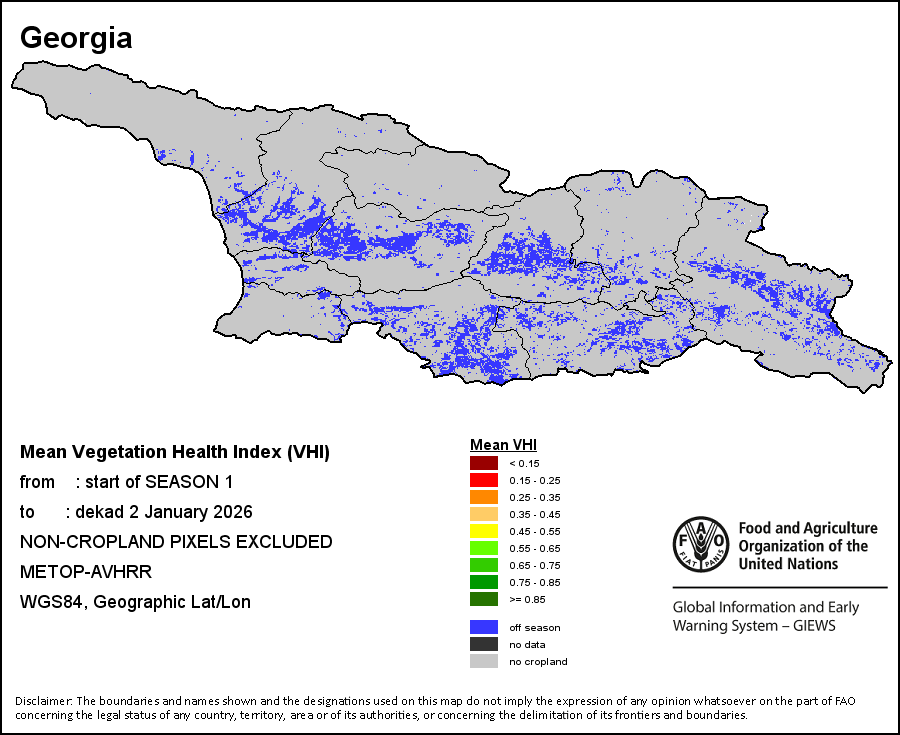 Индекс здоровья растительности (VHI) иллюстрирует серьезность засухи, основанной на здоровье растительности и влиянии температуры на состояние растений. VHI является составным индексом и элементарным индикатором, используемым для вычисления ASI. Он сочетает в себе как Индекс Состояния Растительности (VCI), так и Индекс Состояния Температуры (TCI). TCI рассчитывается с использованием аналогичного уравнения с VCI, но связывает текущую температуру с долгосрочным максимумом и минимумом, так как предполагается, что более высокие температуры, как правило, вызывают ухудшение состояния растительности. Например, уменьшение VHI будет означать относительно слабое состояние растительности и более высокие температуры, означающее ухудшение состояния растительности, что в течение более длительного периода будет свидетельствовать о засухе. Изображения VHI вычисляются для двух основных сезонов и трех модальностей: по-декадный, ежемесячный и годовой. |