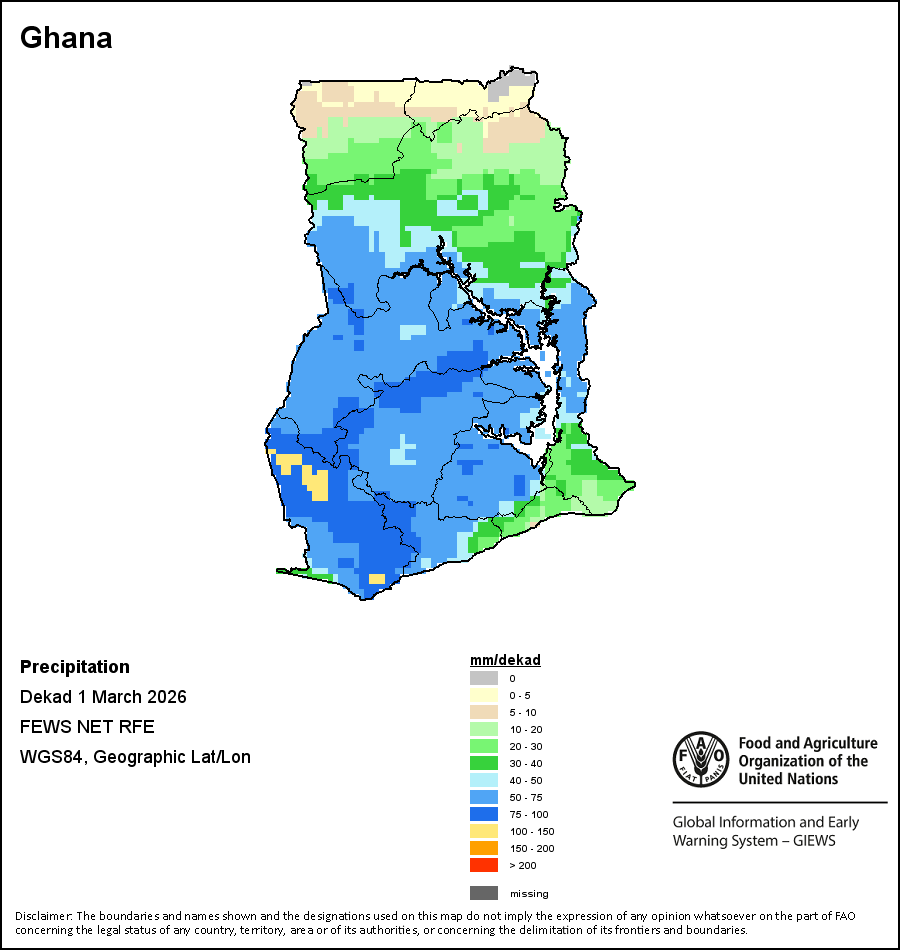На карте изображены кумулятивные объемы осадков в декаду (10-дневный период). Оценки атмосферных осадков для всех африканских стран (за исключением Кабо-Верде и Маврикия) получены из системы NOAA/Системы раннего предупреждения об опасности голода, а по остальным странам данные получены из системы ECMWF.