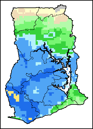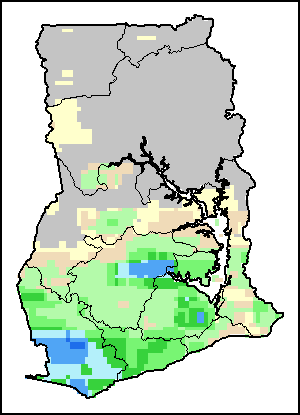 На картах и графиках на уровне страны показывается последний период в 36 месяцев по сезонным показателям, показателям растительного покрова и уровня атмосферных осадков. Данные представляются по 10-дневным периодам и по месяцам. Все три показателя растительного покрова основаны на 10-дневных данных по растительному покрову, полученных от сенсора METOR-AVHRR при разрешении в 1 км (начиная с 2007 года). Данные при разрешении в 1 км за период 1984-2006 гг. были получены из банка данных NOAA-AVHRR при разрешении в 16 км. Оценки атмосферных осадков для всех африканских стран (за исключением Кабо-Верде и Маврикия) получены из системы NOAA/Системы раннего предупреждения об опасности голода (разрешении в 16 km), а по остальным странам данные получены из системы ECMWF (разрешении в 25 km). Благодаря более высокой разрешающей способности показателей состояния растительного покрова (например, NDVI, VHI) по сравнению с показателями осадков, у некоторых стран количество субнациональных единиц, для которых можно получить действительную статистику по данным показателям, больше, чем по показателям осадков.