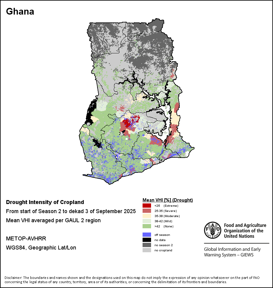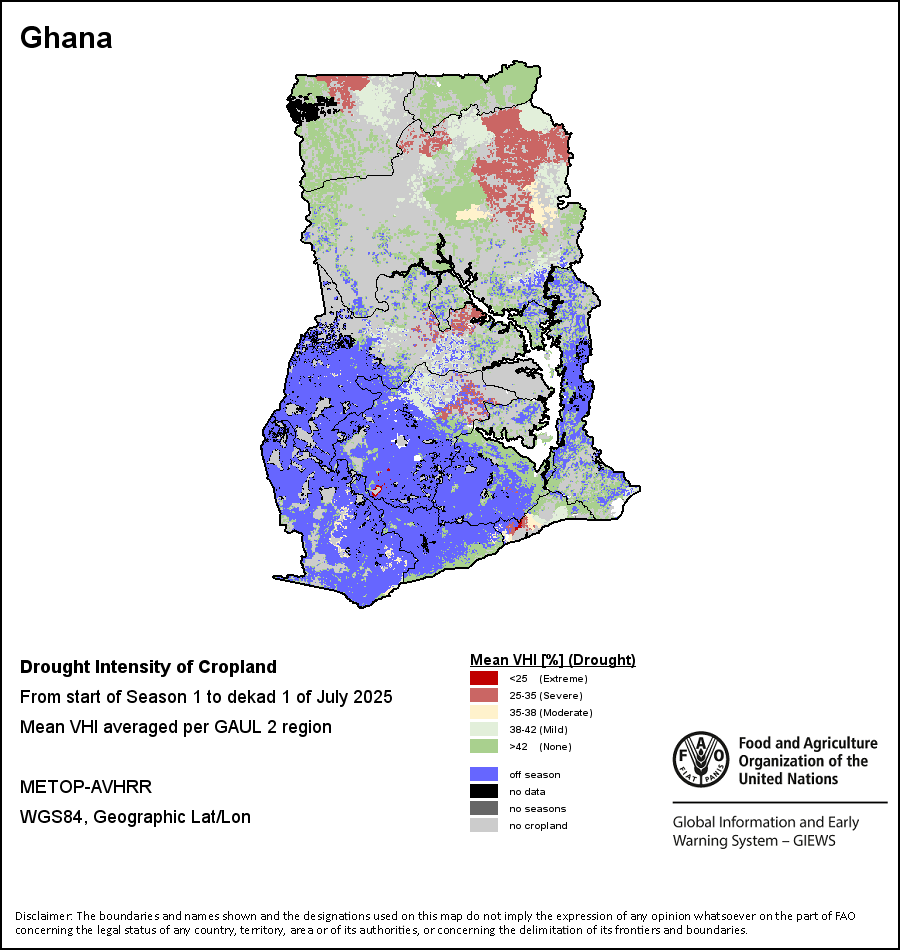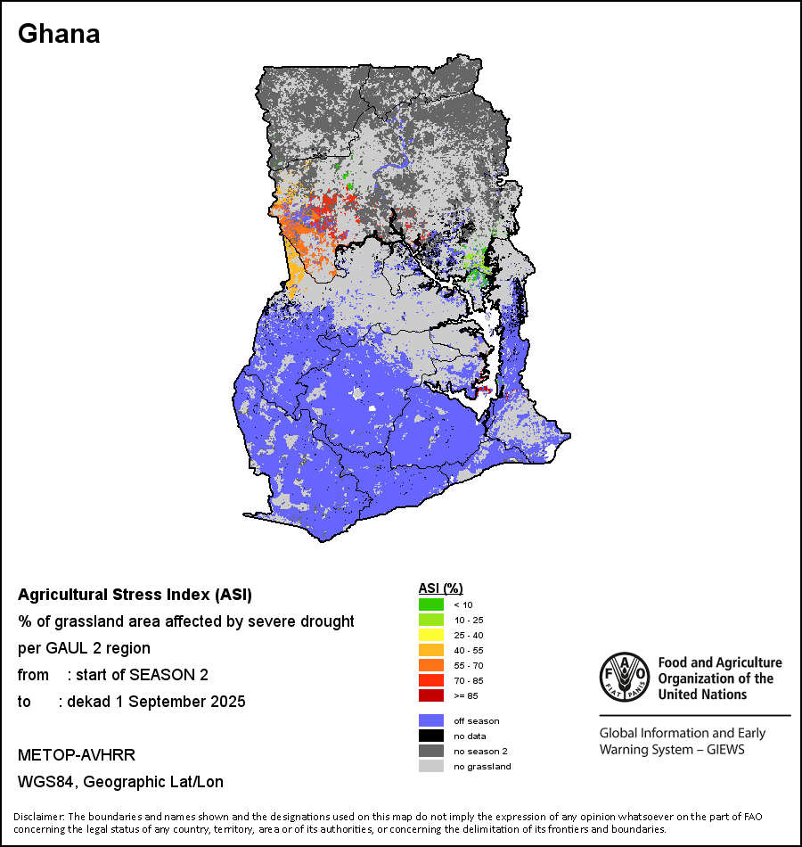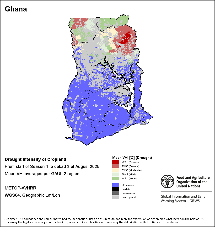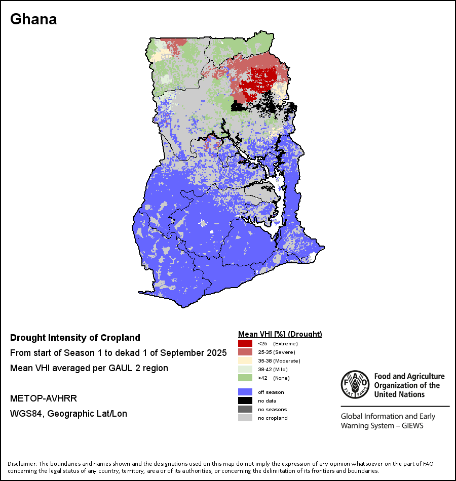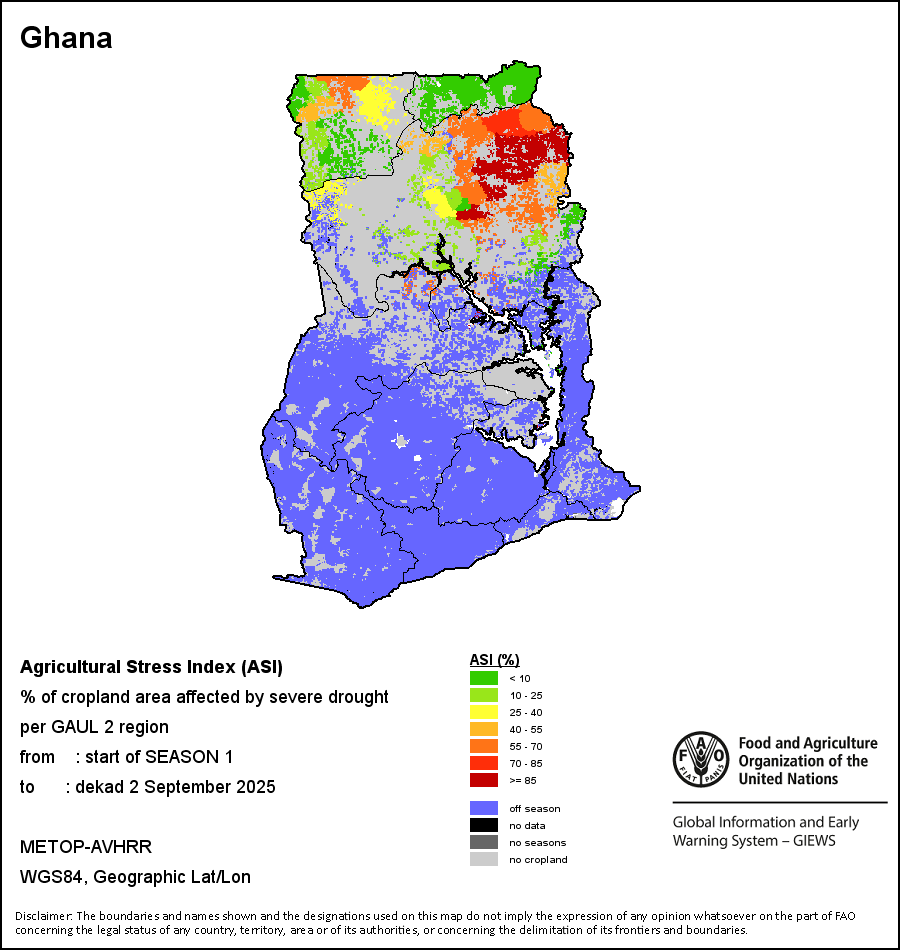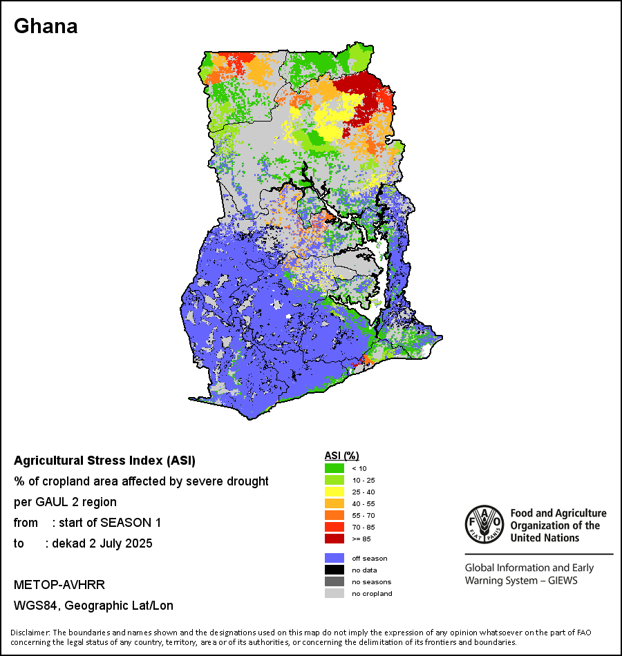 农业干旱依据其强度划分为四类:极端、严重、重度或轻度。干旱的强度通过各全球行政单位分层制度二级区域(GAUL 2)地区累积加权平均植被健康指数计算得出,意味着植被健康状况越差旱情就越严重。