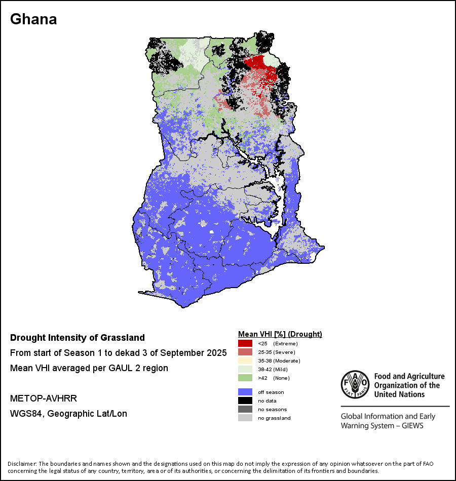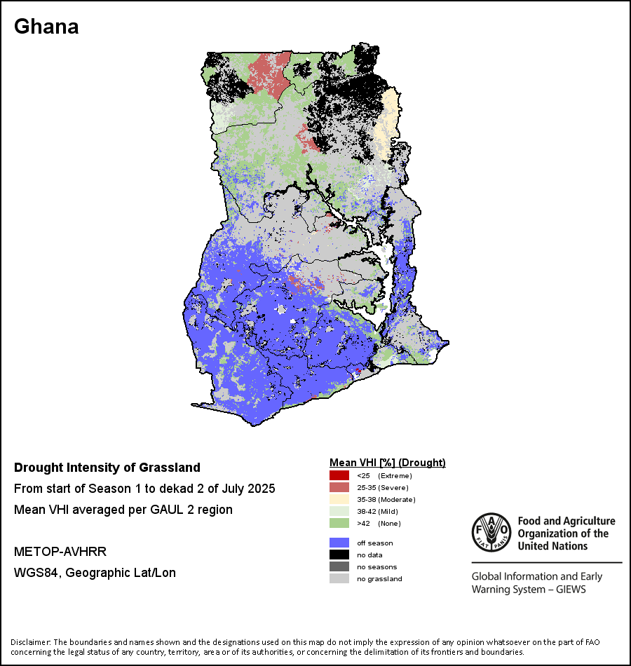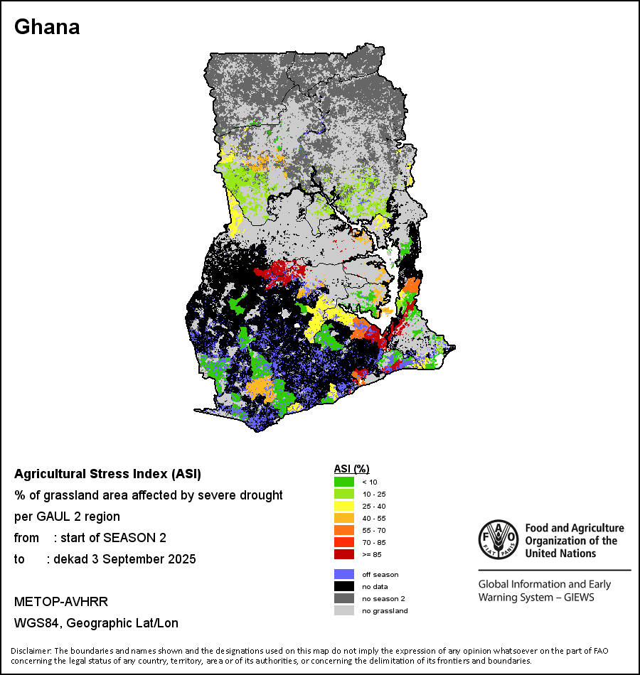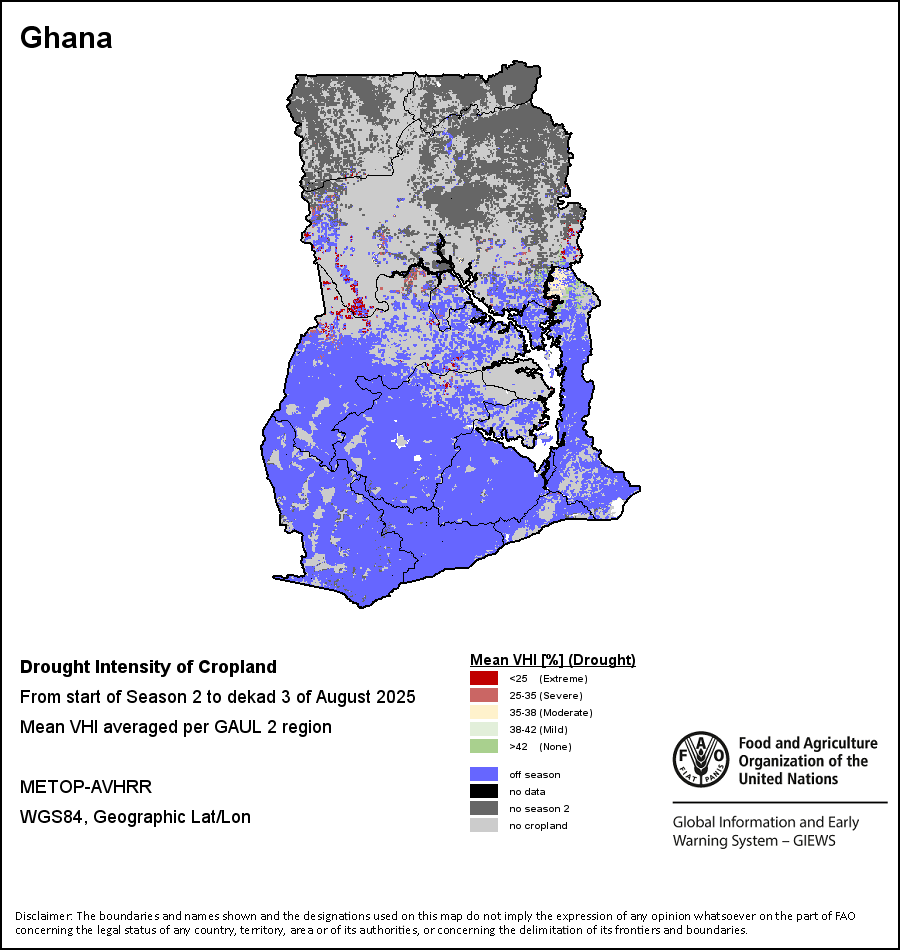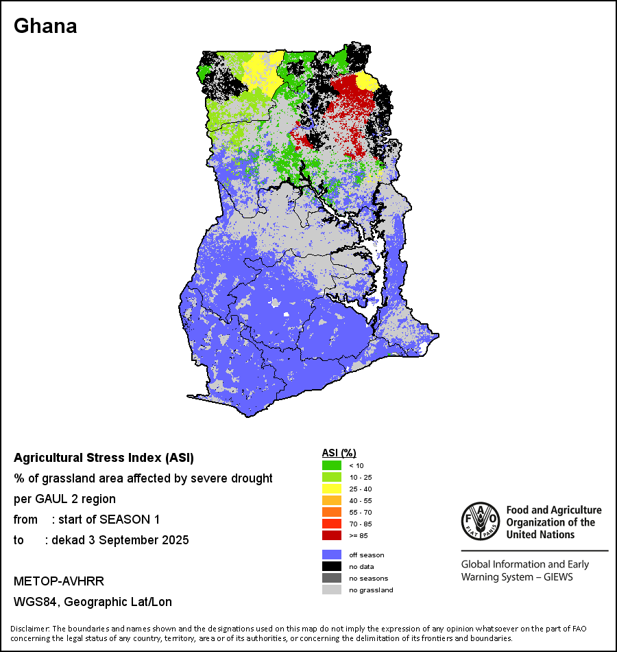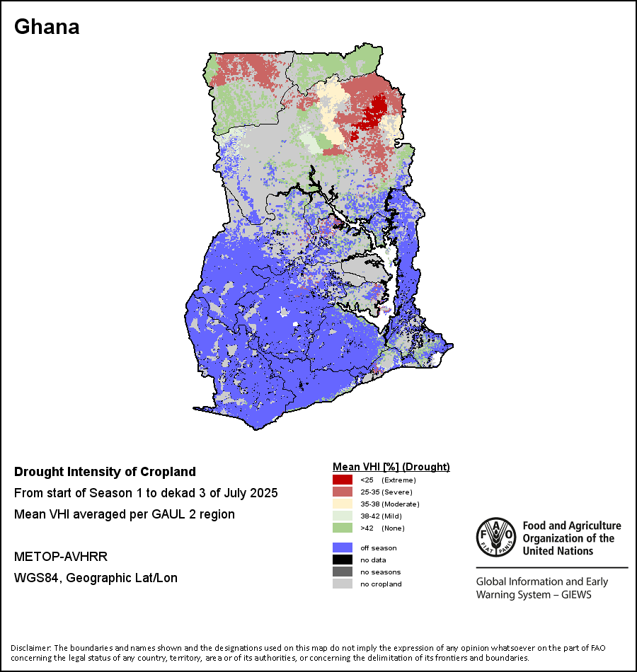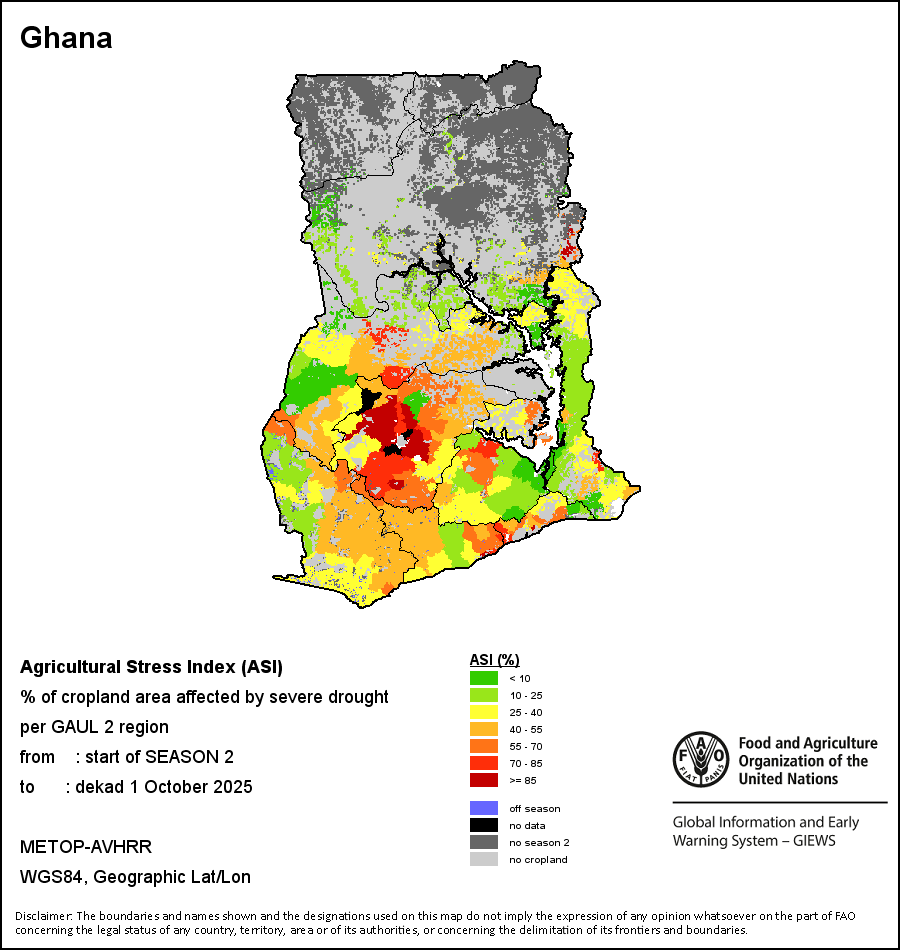 农业干旱依据其强度划分为四类:极端、严重、重度或轻度。干旱的强度通过各全球行政单位分层制度二级区域(GAUL 2)地区累积加权平均植被健康指数计算得出,意味着植被健康状况越差旱情就越严重。