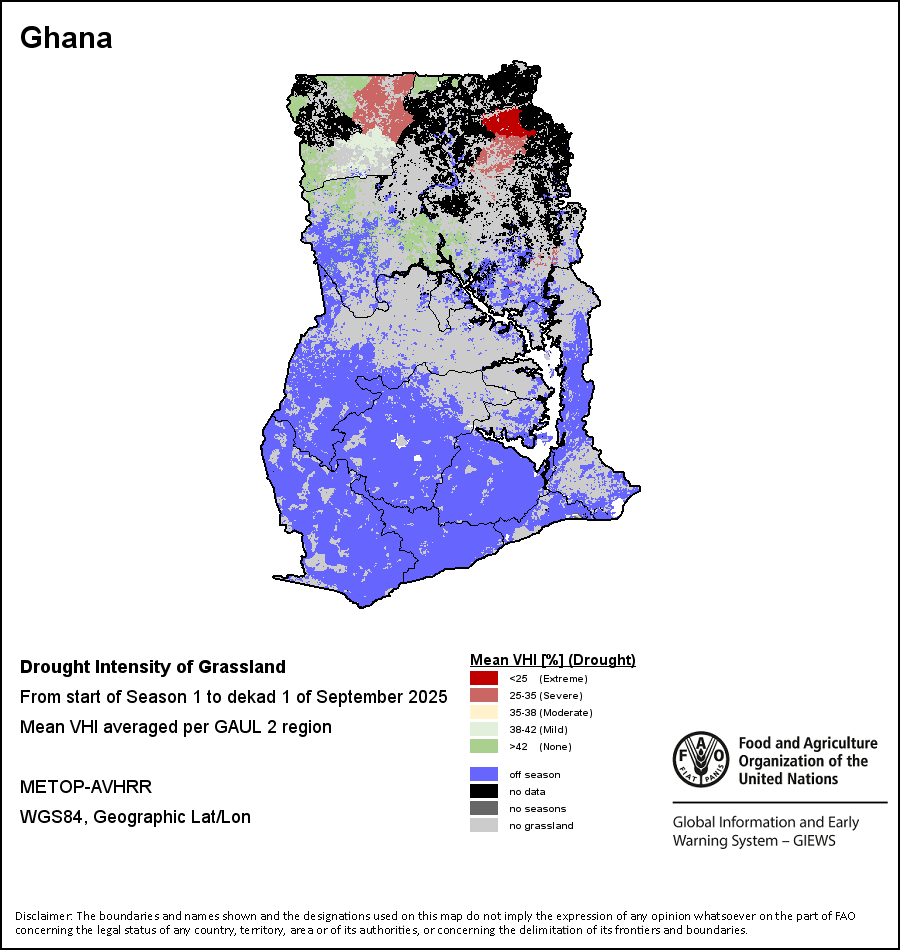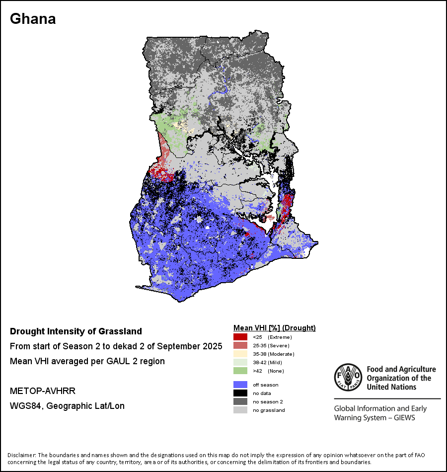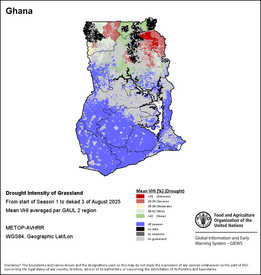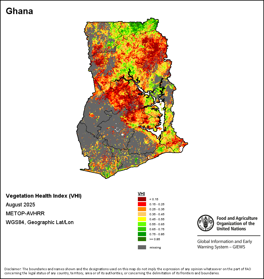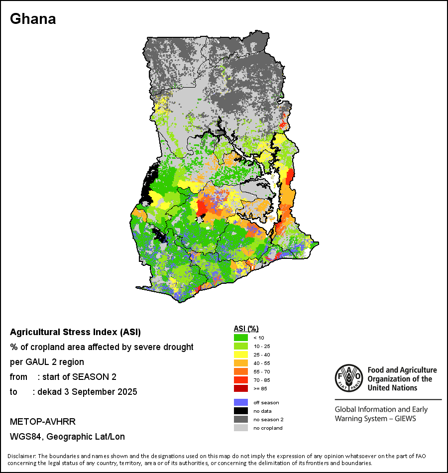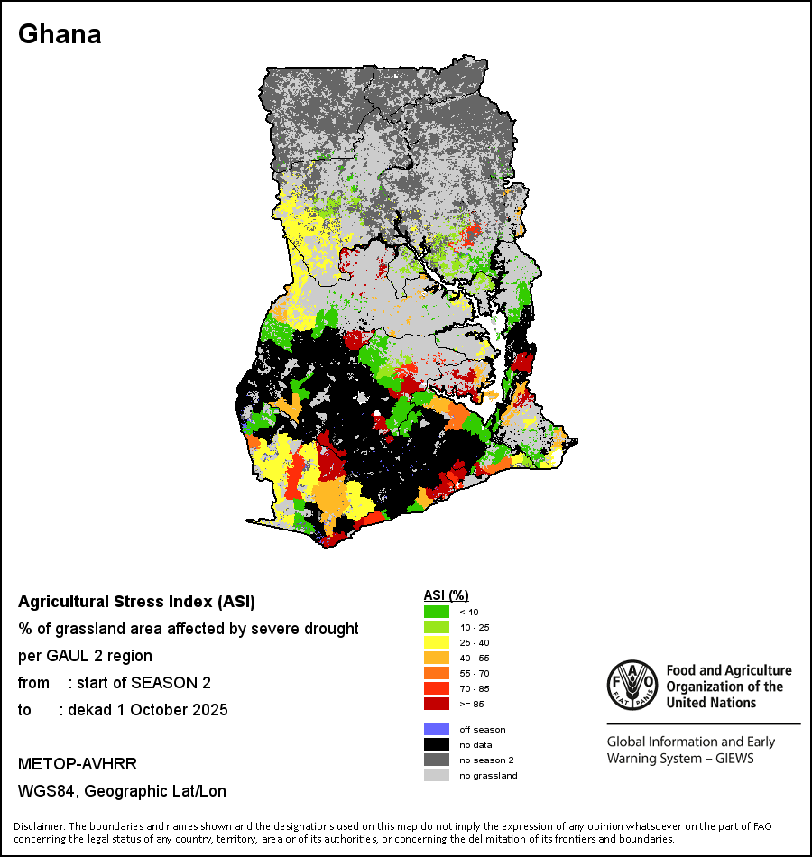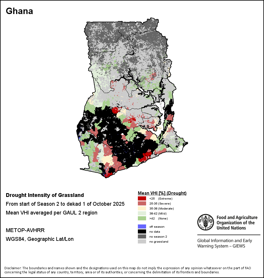 农业干旱依据其强度划分为四类:极端、严重、重度或轻度。干旱的强度通过各全球行政单位分层制度二级区域(GAUL 2)地区累积加权平均植被健康指数计算得出,意味着植被健康状况越差旱情就越严重。