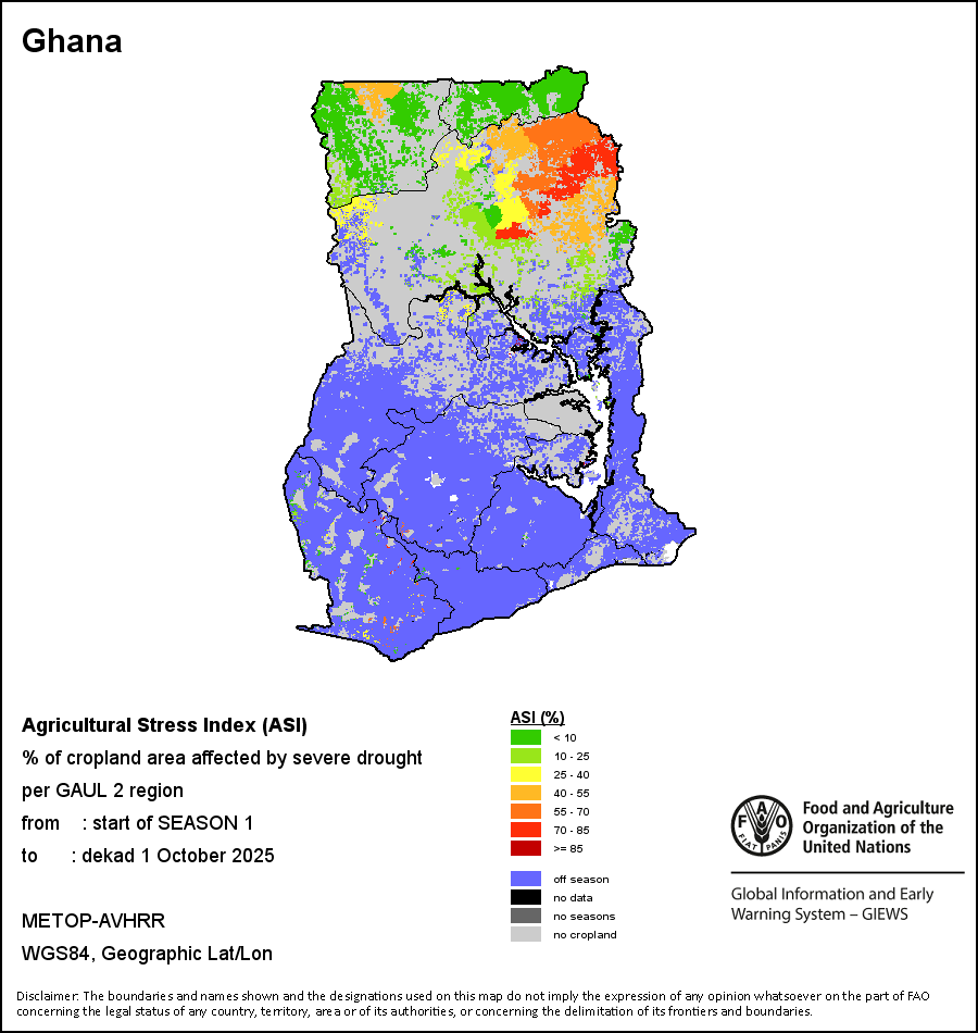 农业干旱胁迫指数(ASI)是一项速览指数,有助于在早期甄别较大可能发生水胁迫(干旱)的耕地。 该指数通过整合植被健康指数(VHI)在评估农业旱情方面具有关键意义的两个维度,即时间和空间维度,而得出。计算农业干旱胁迫指数的第一步是求植被健康指数的时间平均值,对作物周期内旱情的强度和时长进行像素级评估;这项计算包括采用作物系数衡量某种作物在各物候阶段对干旱胁迫的敏感度。第二步是确定旱情的空间广度,方法是计算植被健康指数值低于35%(Kogan前期研究将这一数值确定为评估干旱程度的临界值,1995年)的耕地的像素百分比。然后把各个行政区域根据受影响面积的百分比进行划分,便于对结果进行快速解读。