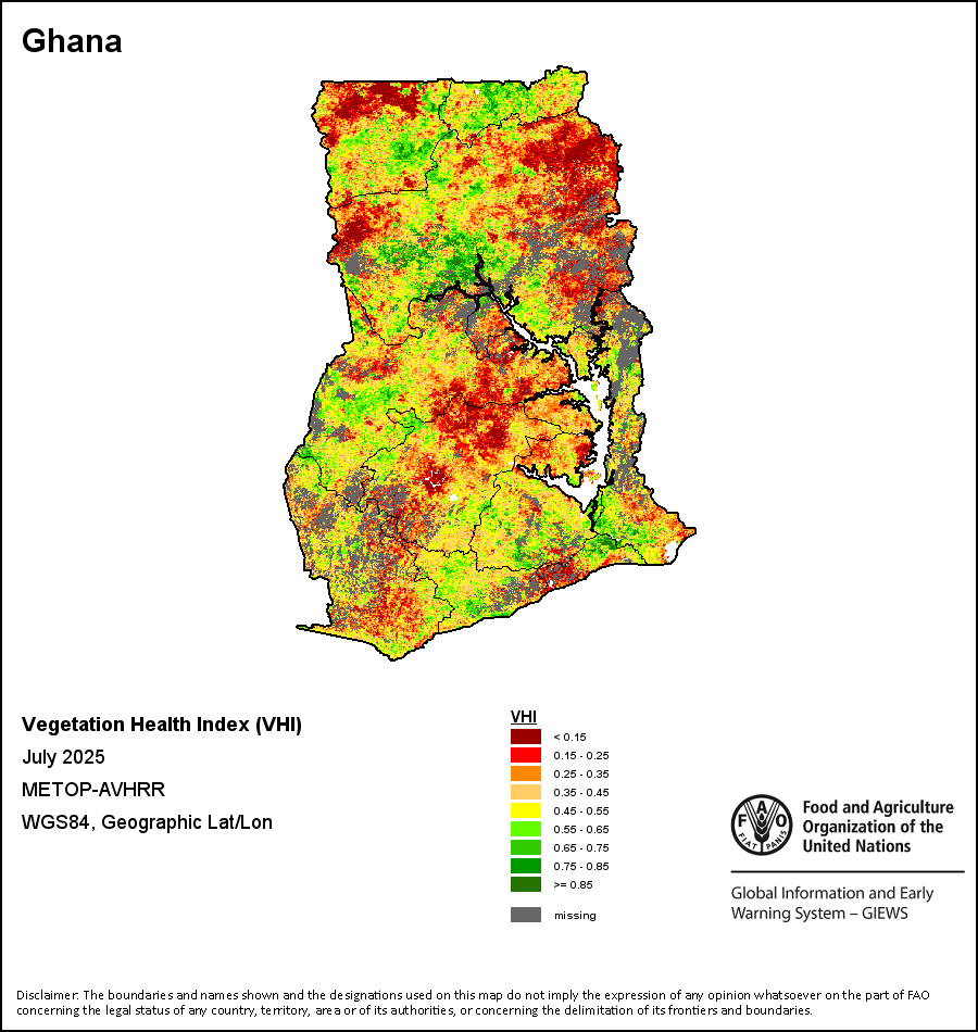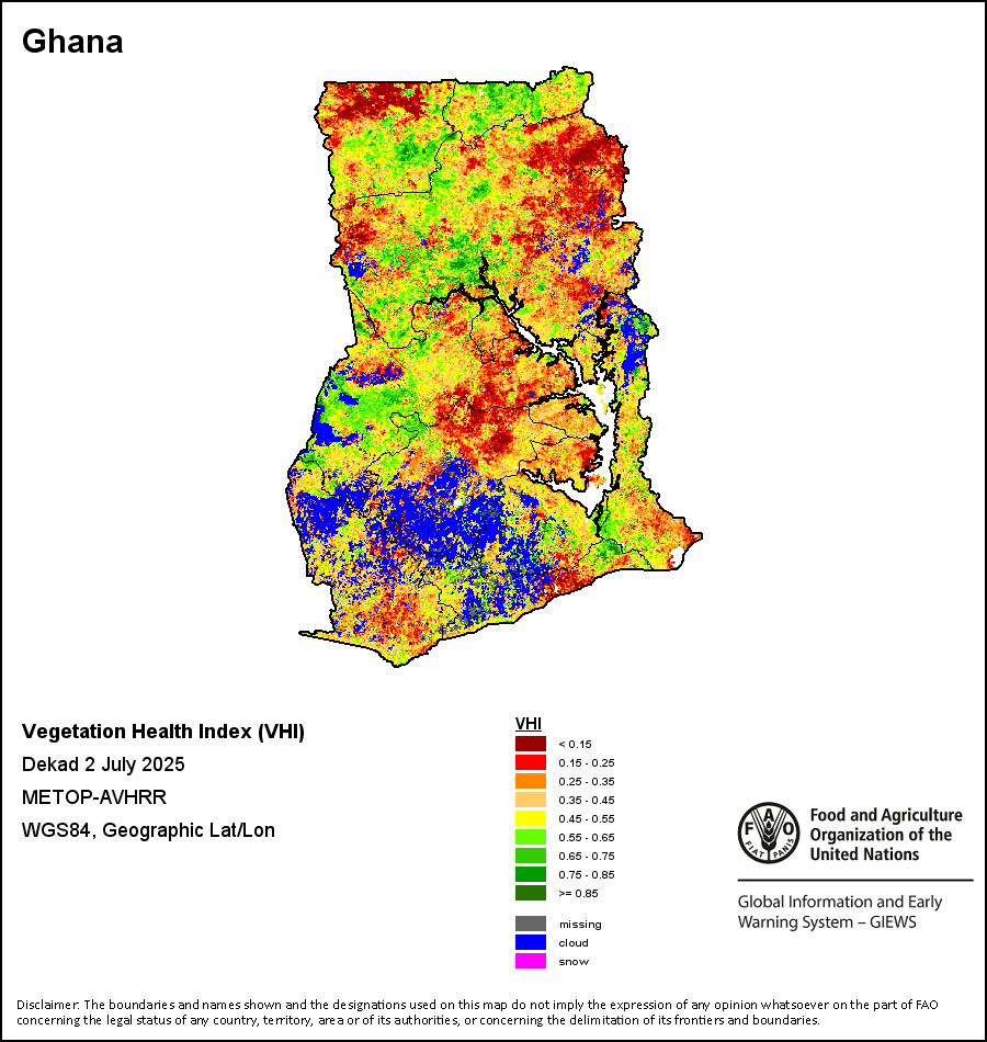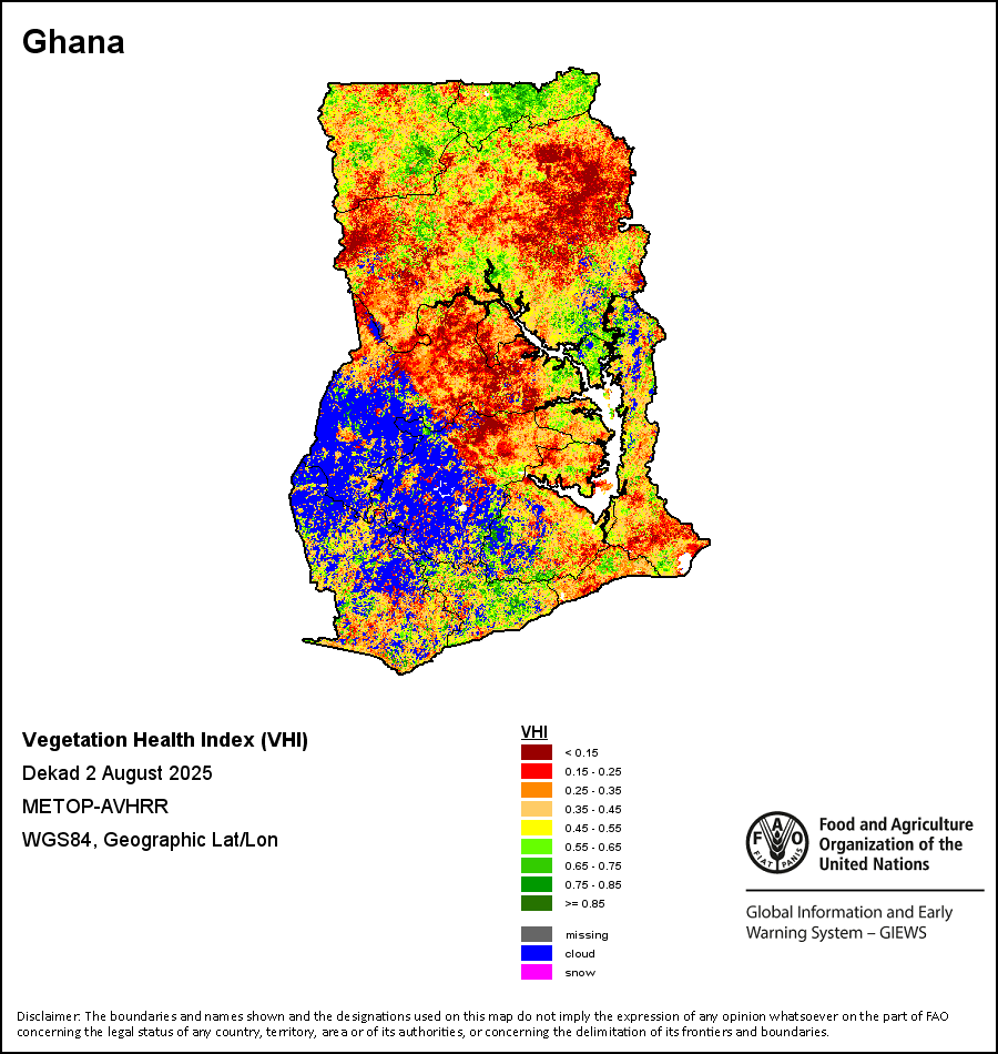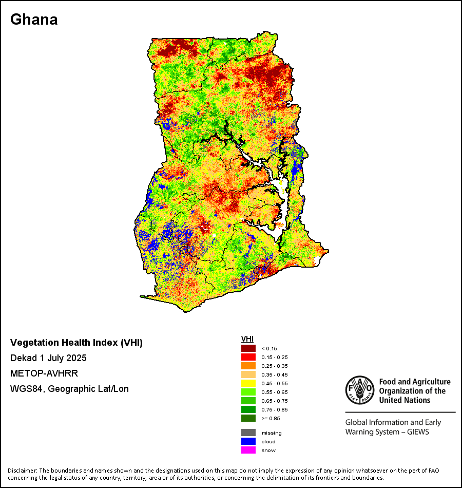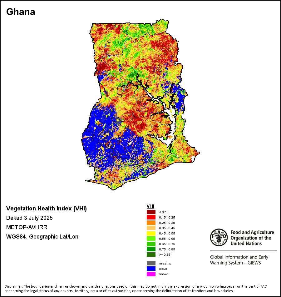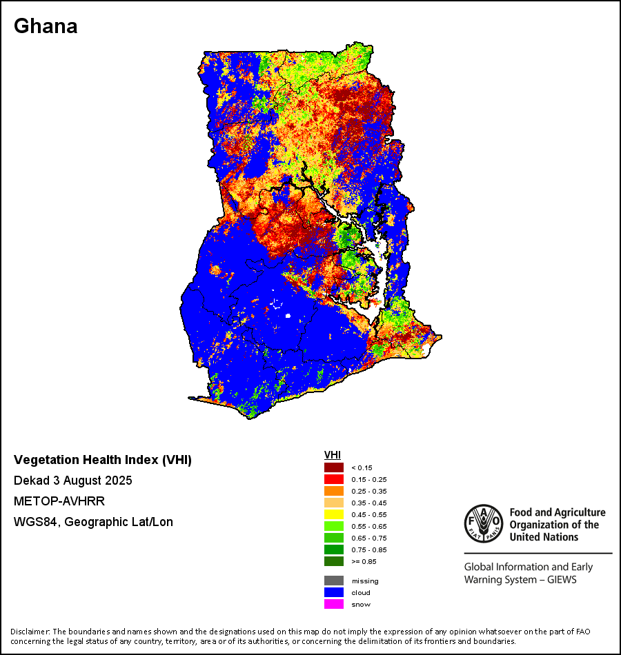 植被健康指数(VHI)根据植被健康状况以及气温对作物状况的影响情况显示干旱的严重程度。 VHI是一项综合指数,是用于计算ASI的基础性指标。它结合了植被状况指数(VCI)和气温状况指数(TCI)。TCI的计算采用了与VCI类似的方程,但它把当前气温与长期最高和最低值联系起来,因为一个假定前提是气温越高就倾向于造成植被状况恶化。比方说,VHI指数下降就意味着植被状况相对较差,而气温越高则意味着植被状况受到胁迫,较长时间延续则成为干旱的指征。VHI映像针对两个主要季节进行计算并分为三种时间模式:旬度、月度和年度。