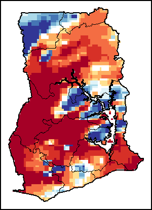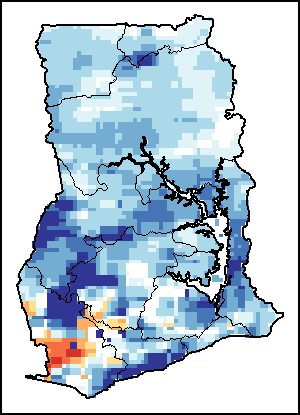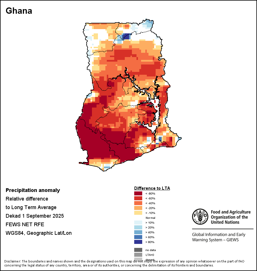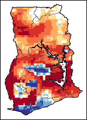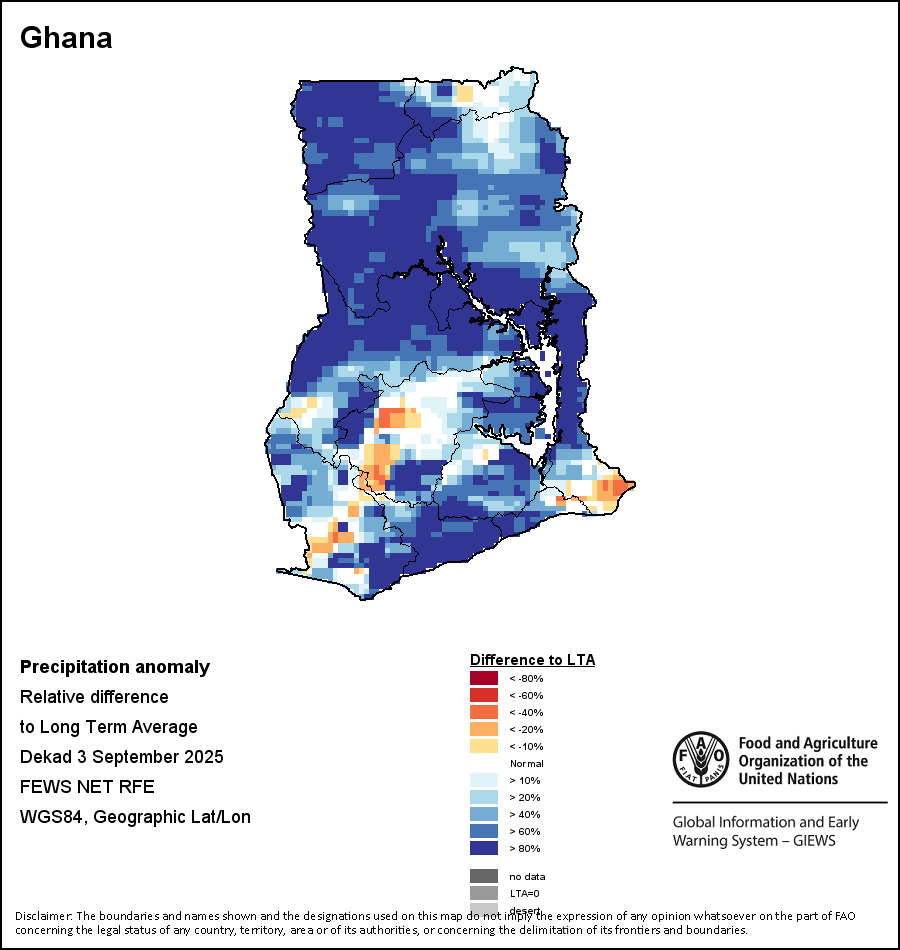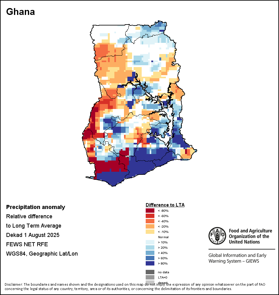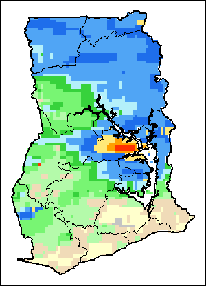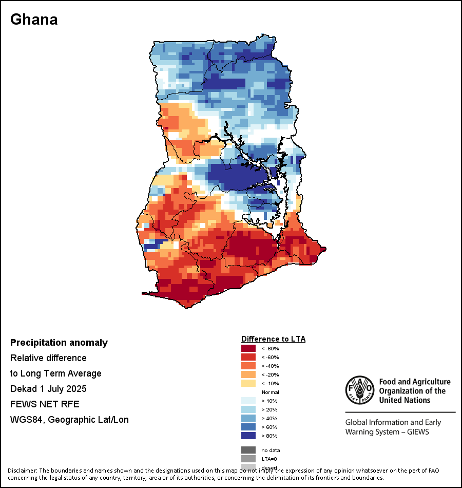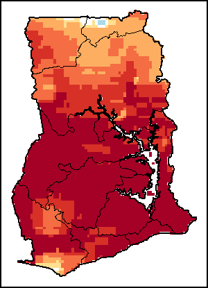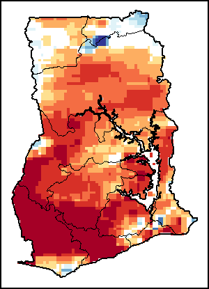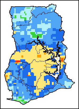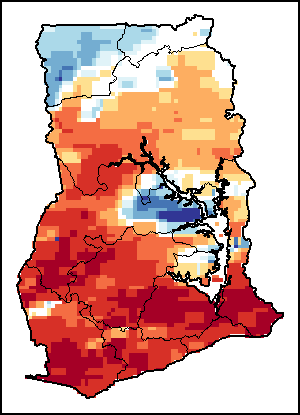 该图谱显示了当前降水量与平均水平之间的差异。 由降水量水平与长期平均值(LTA)进行比较得出,长期平均值系指1989-2015年期间的数值。暖色调指示的是降水量低于平均水平的地区,而冷色调指示的则是降水量高于平均水平的地区。降雨量估算数据来自欧洲中期天气预报这些(ECMWF)。