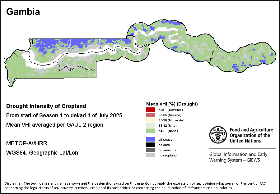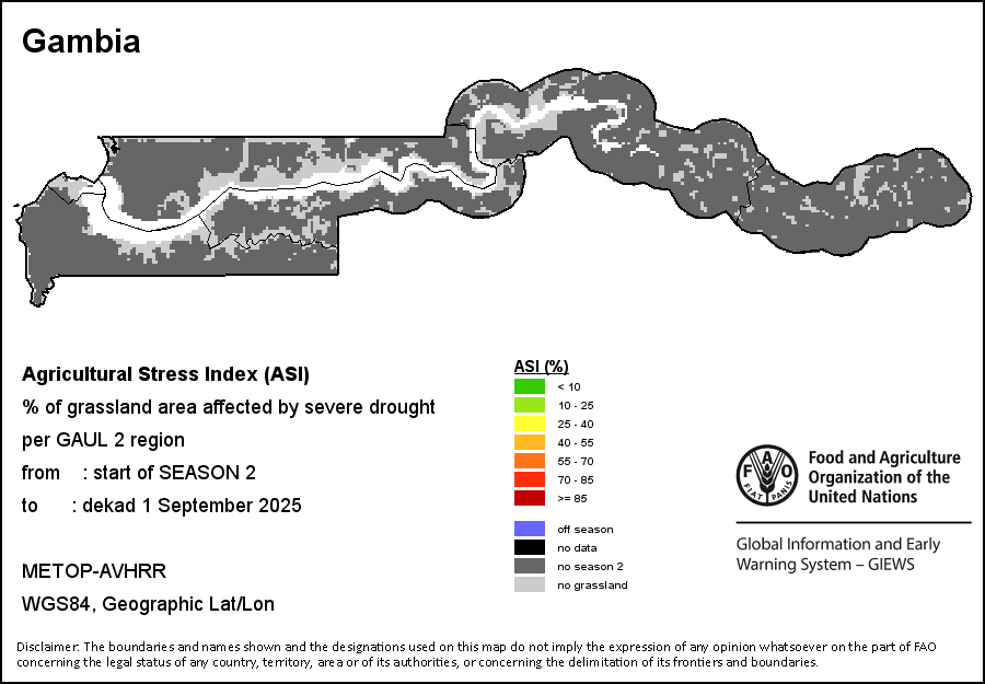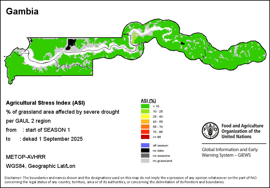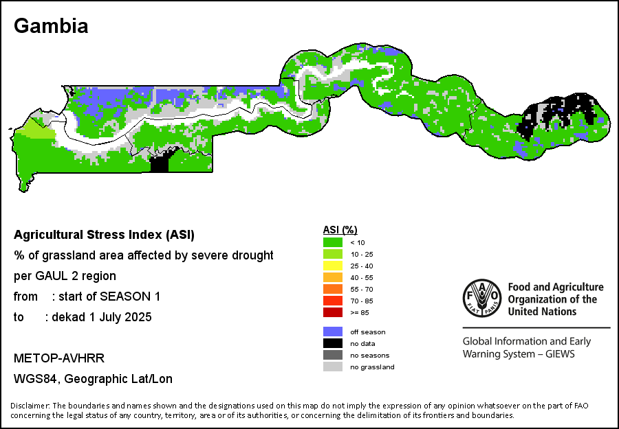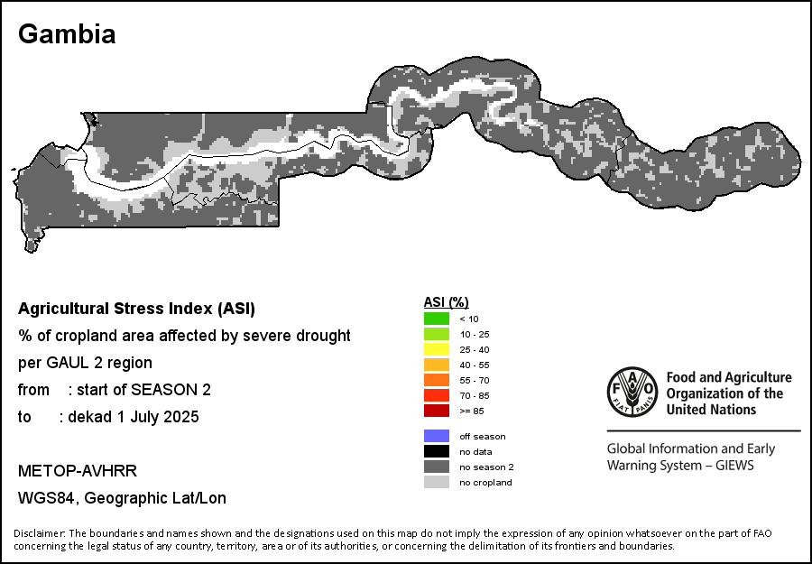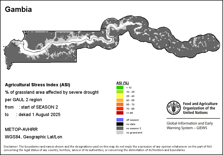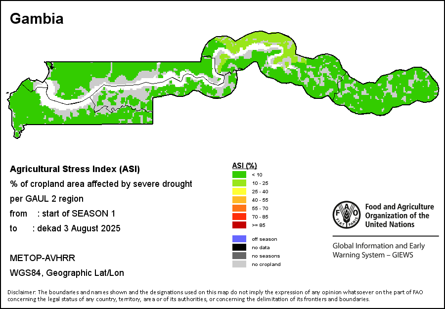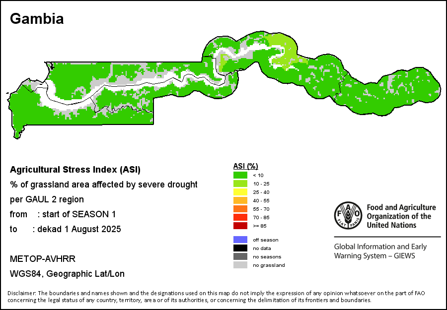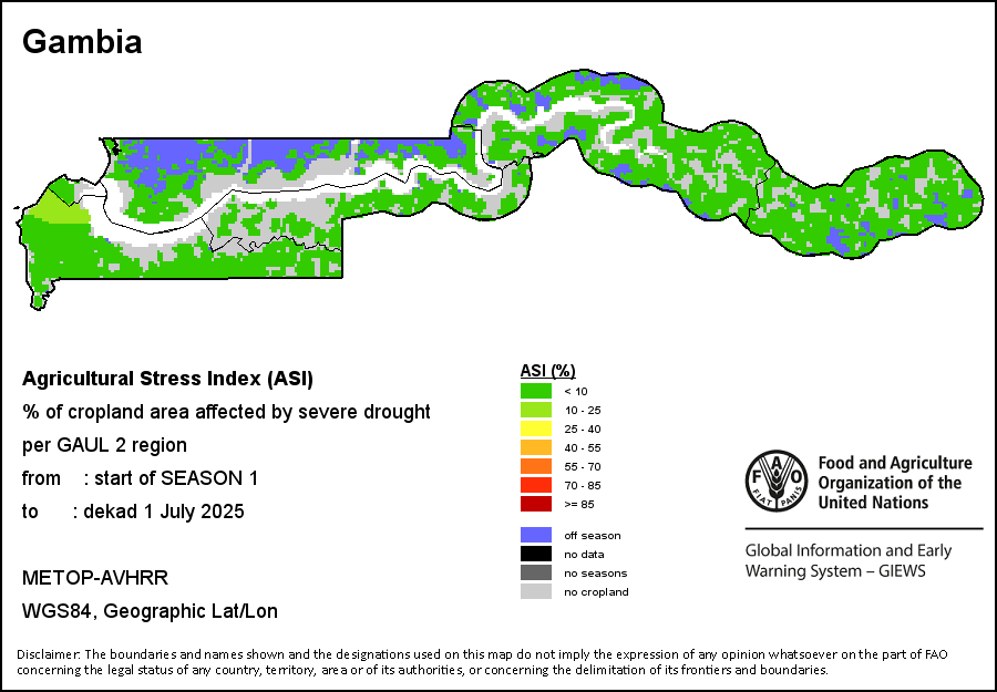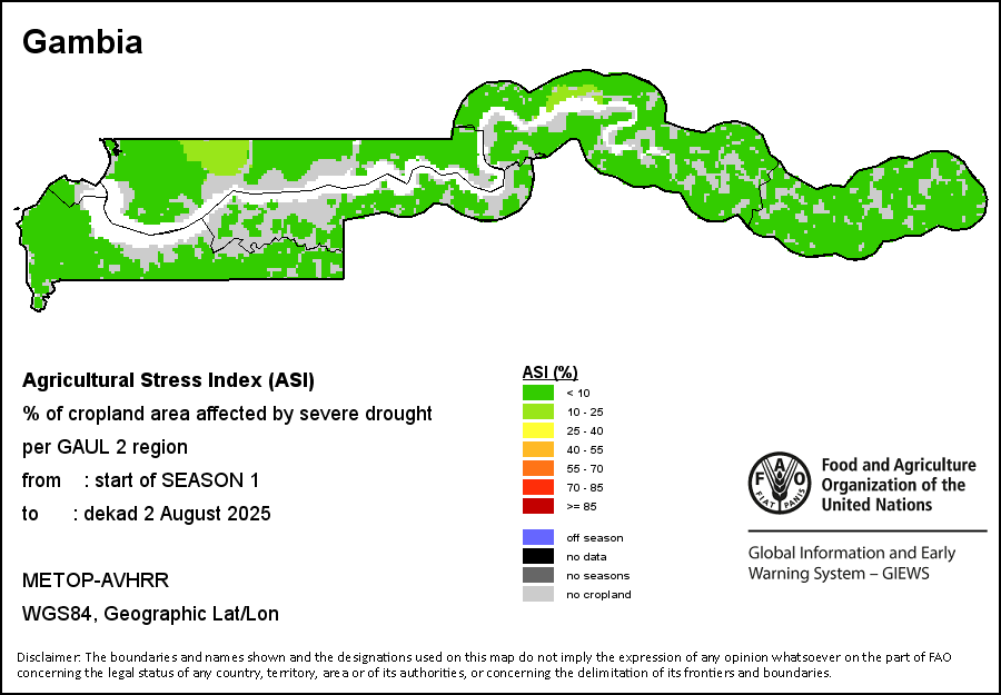 The Agricultural Stress Index (ASI) is a quick-look indicator that facilitates the early identification of cropped land with a high likelihood of water stress (drought). The Index is based on the integration of the Vegetation Health Index (VHI) in two dimensions that are critical in the assessment of a drought event in agriculture: temporal and spatial. The first step of the ASI calculation is a temporal averaging of the VHI, assessing the intensity and duration of dry periods occurring during the crop cycle at the pixel level; this calculation includes the use of crop coefficients, which introduces sensitivity of a crop to water stress during each phenological phase. The second step determines the spatial extent of drought events by calculating the percentage of pixels in arable areas with a VHI value below 35 percent (this value was identified as a critical threshold in assessing the extent of drought in previous research by Kogan, 1995). Each administrative area is classified according to the percentage of the affected area to facilitate the quick interpretation of results.