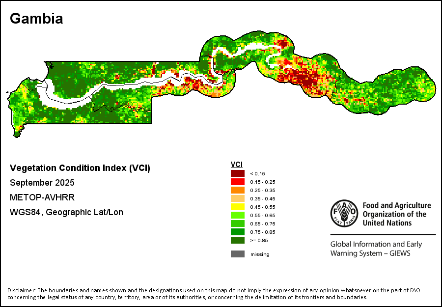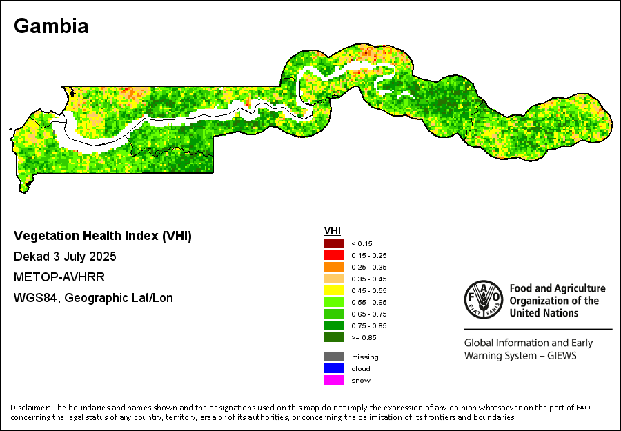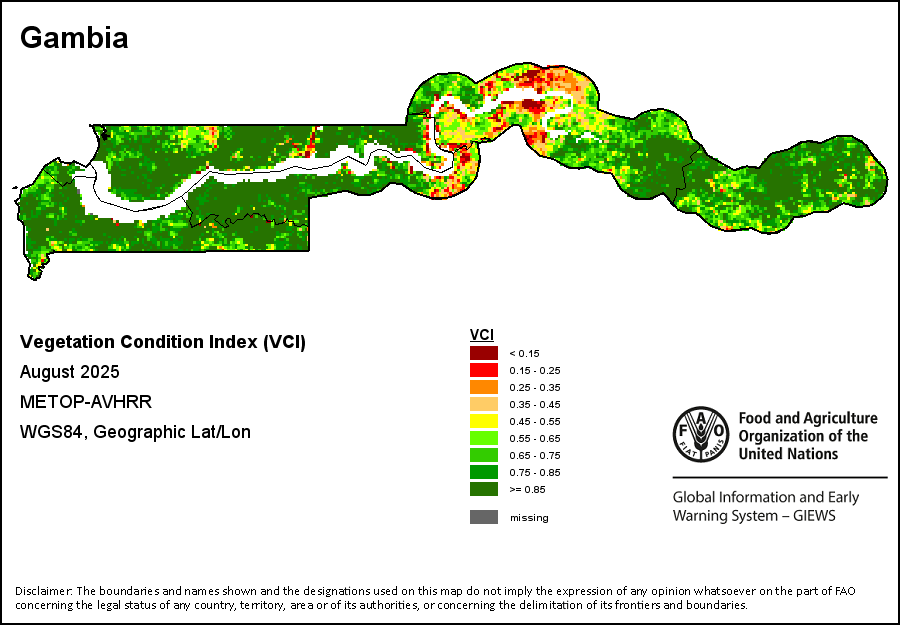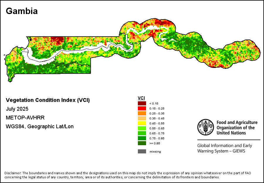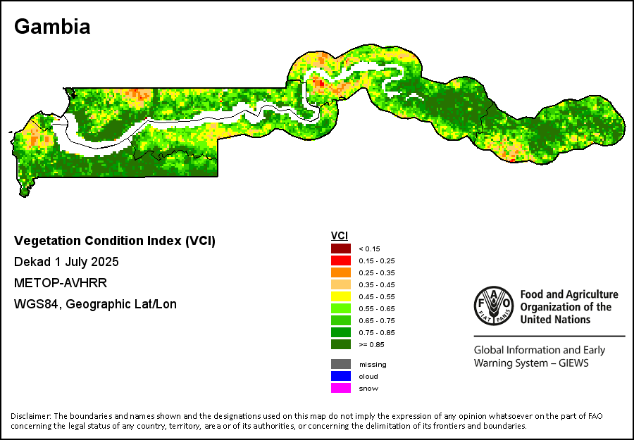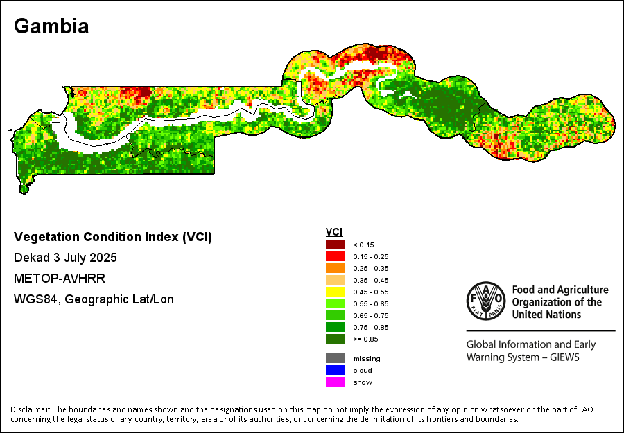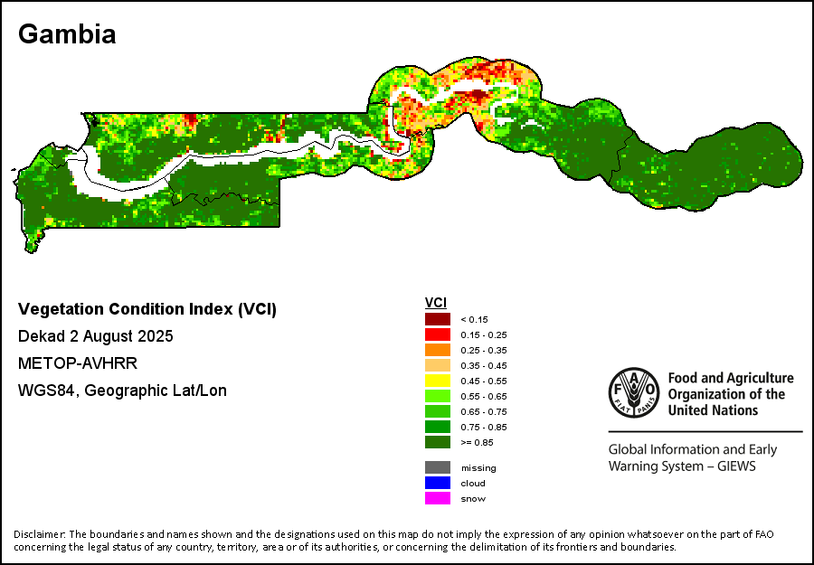The Vegetation Condition Index (VCI) evaluates the current vegetation health in comparison to the historical trends. The VCI relates current dekadal Normalized Difference Vegetation Index (NDVI) to its long-term minimum and maximum, normalized by the historical range of NDVI values for the same dekad. The VCI was designed to separate the weather-related component of the NDVI from the ecological element.