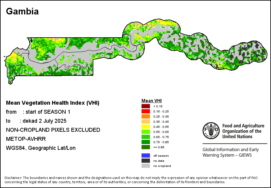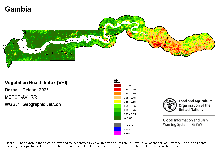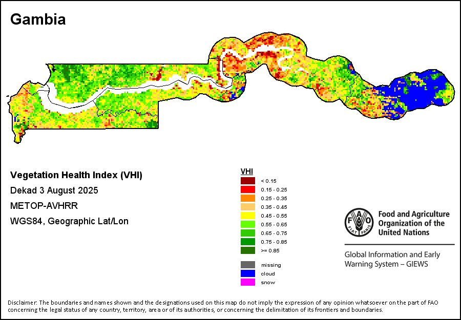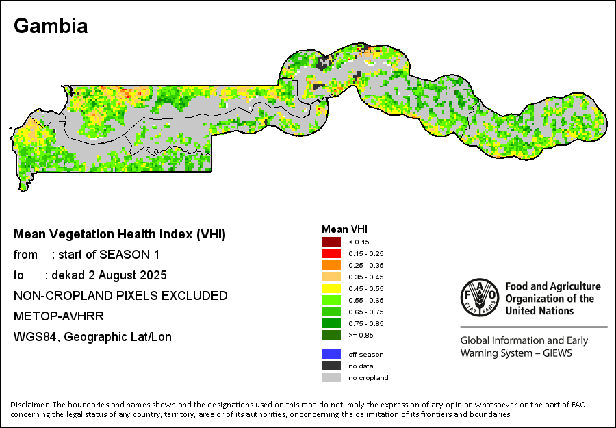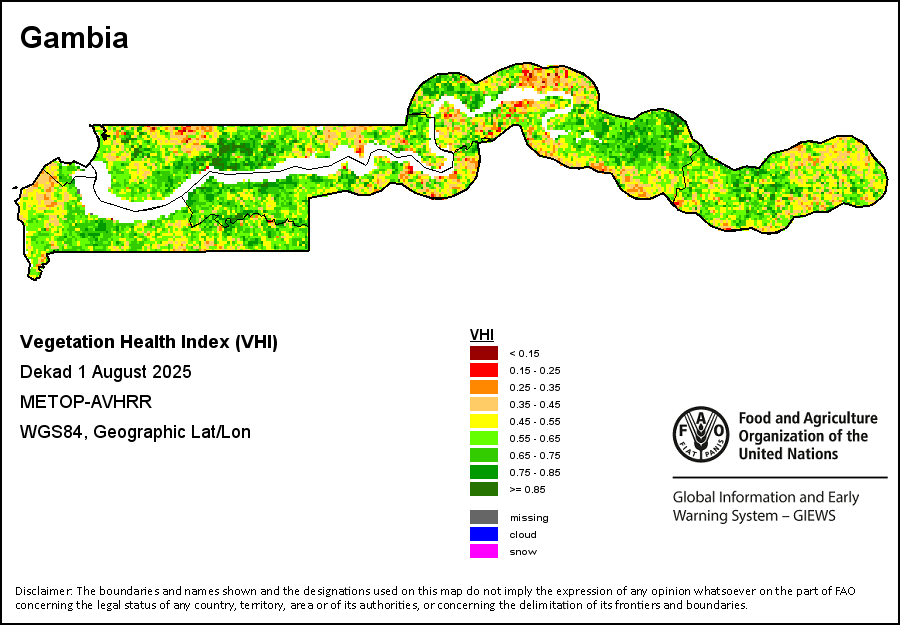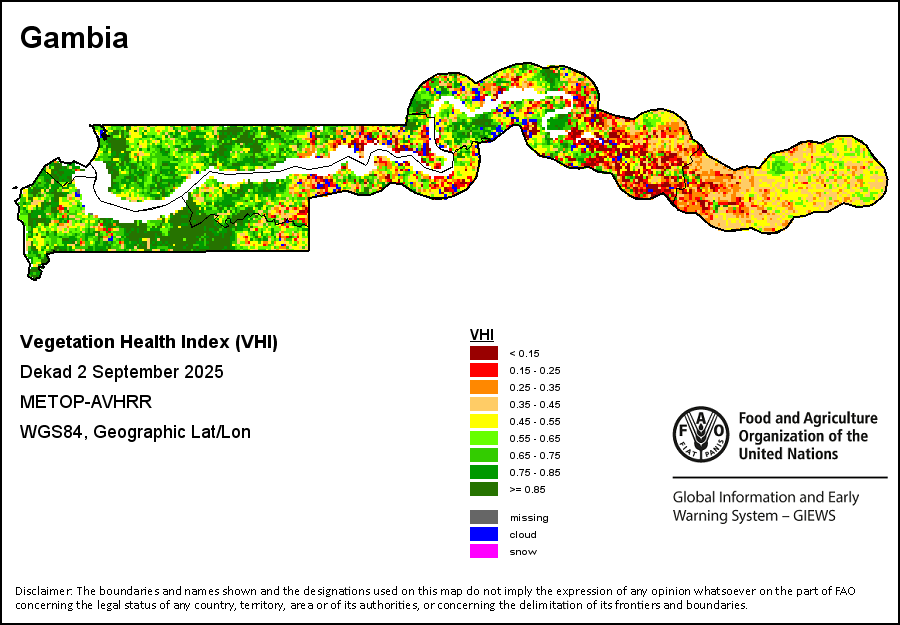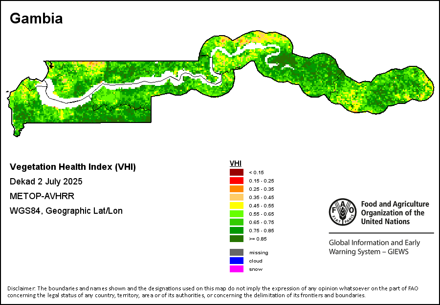 The Vegetation Condition Index (VCI) evaluates the current vegetation health in comparison to the historical trends. The VCI relates current dekadal Normalized Difference Vegetation Index (NDVI) to its long-term minimum and maximum, normalized by the historical range of NDVI values for the same dekad. The VCI was designed to separate the weather-related component of the NDVI from the ecological element.