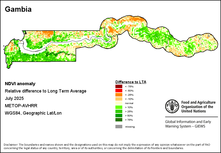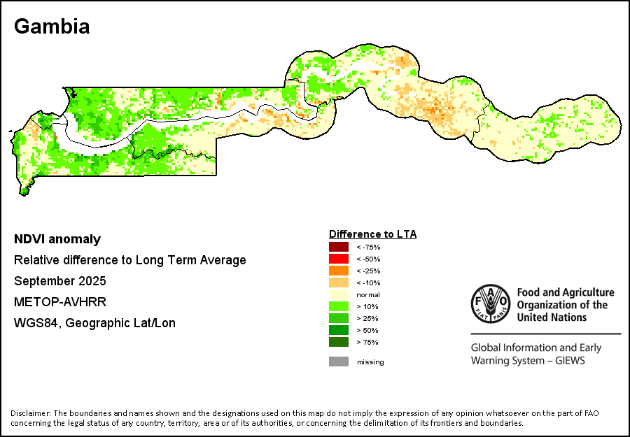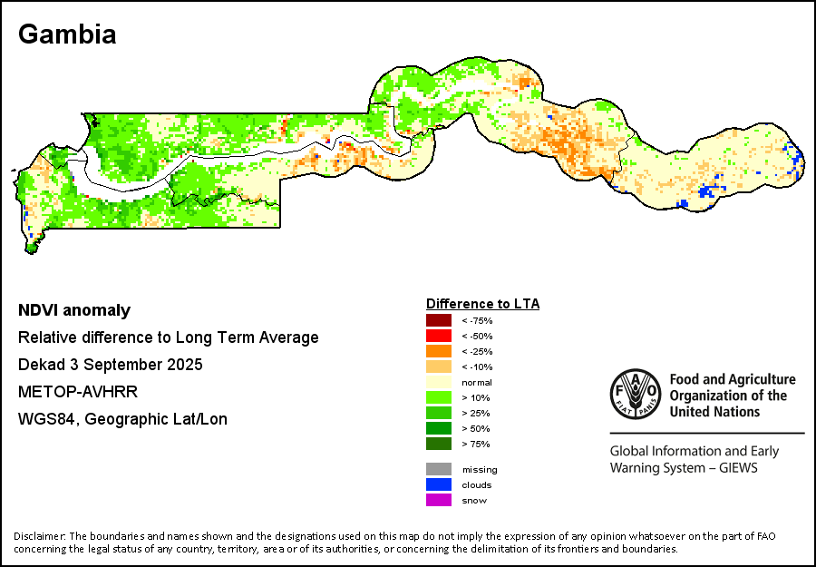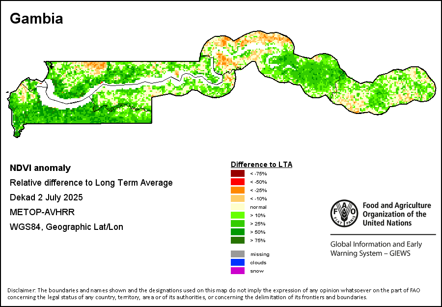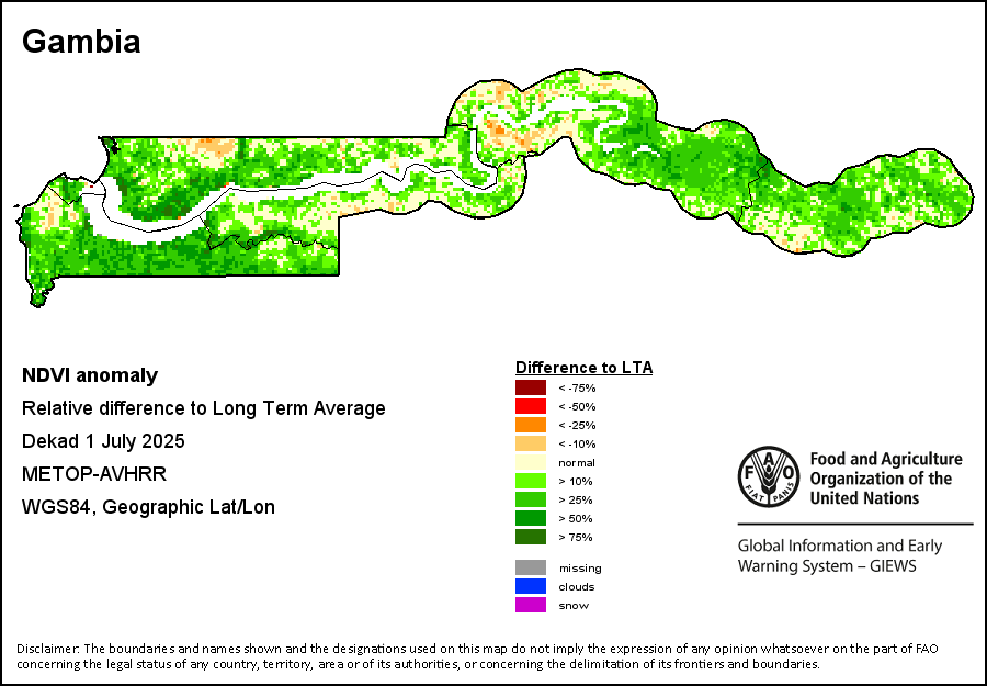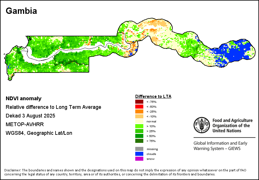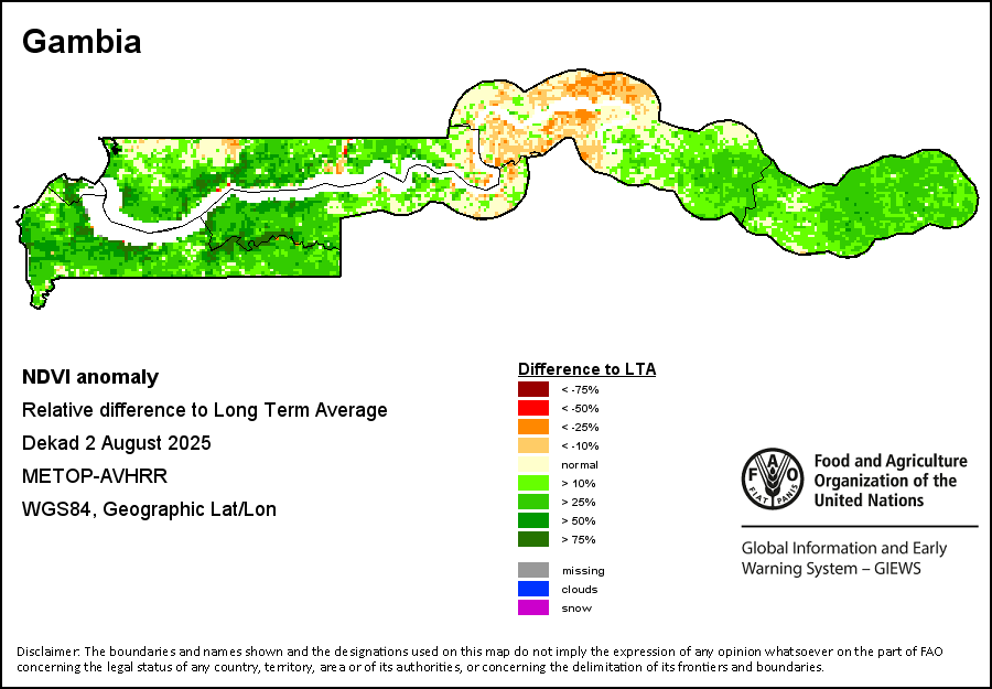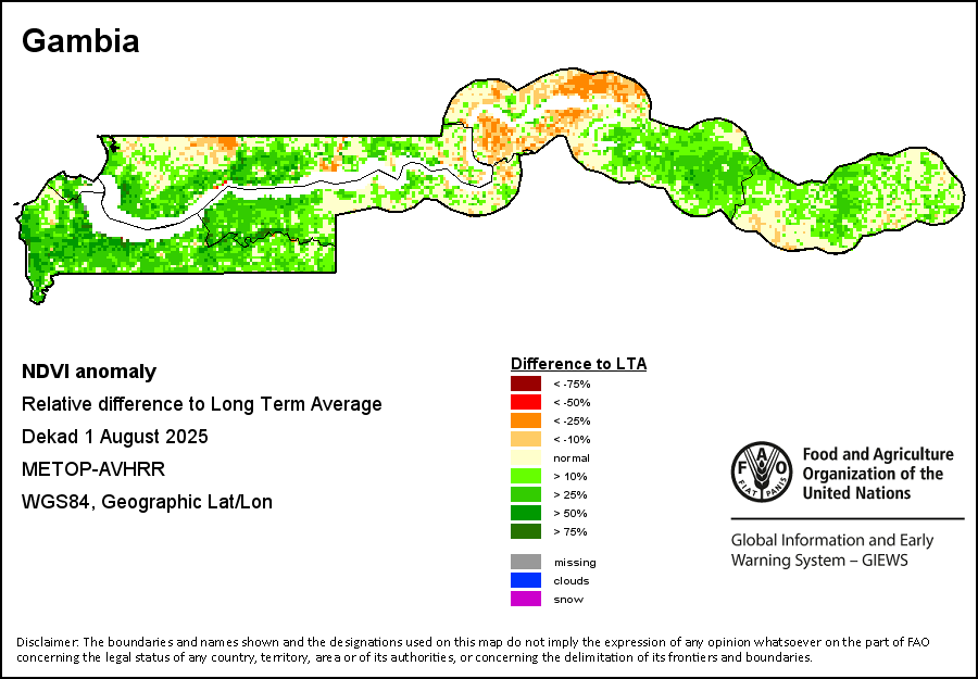 The Normalized Difference Vegetation Index (NDVI) measures the “greenness” of ground cover and is used as a proxy to indicate the density and health of vegetation. NDVI values range from +1 to -1, with high positive values corresponding to dense and healthy vegetation, and low and/or negative NDVI values indicating poor vegetation conditions or sparse vegetative cover. The NDVI anomaly indicates the variation of the current dekad to the long-term average, where a positive value (for example 20 percent) would signify enhanced vegetation conditions compared to the average, while a negative value (for instance -40 percent) would indicate comparatively poor vegetation conditions.