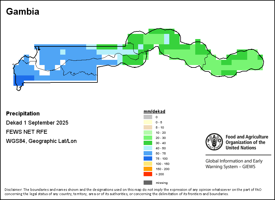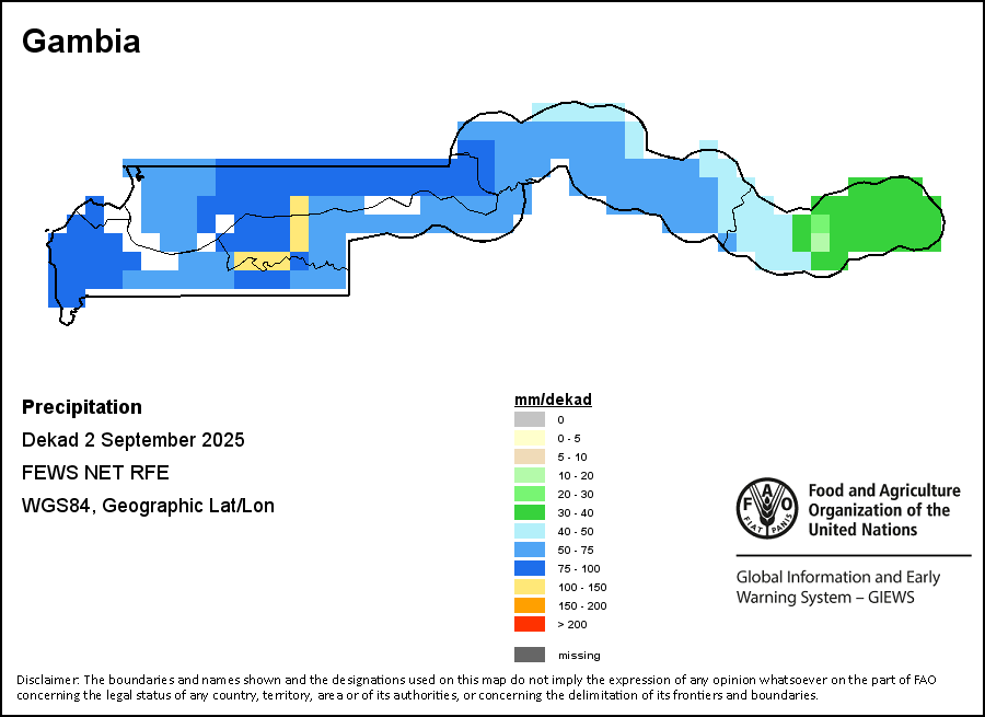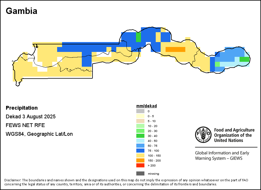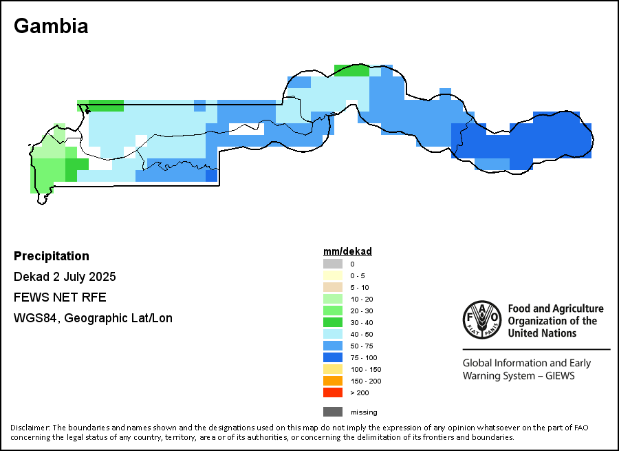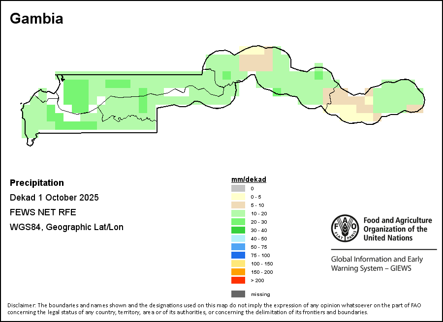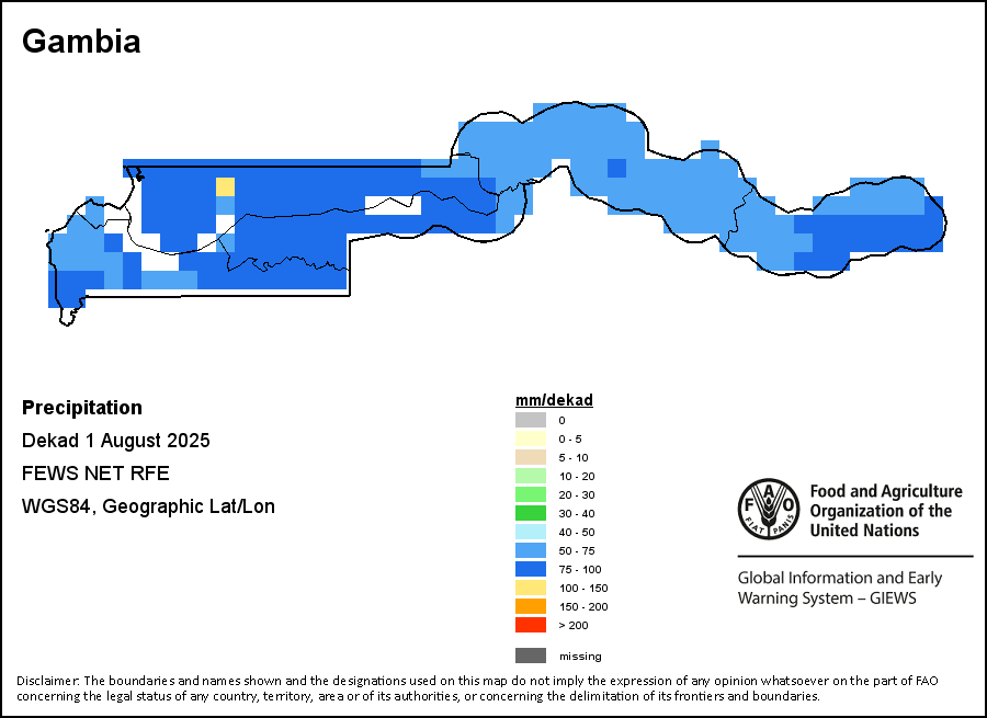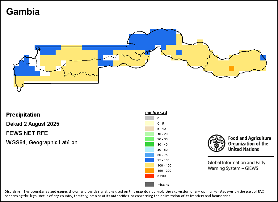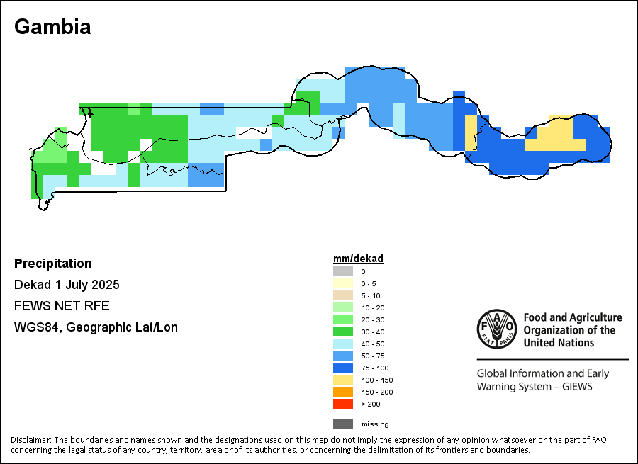 The map depicts cumulative rainfall volumes over a dekad (a 10-day period). Precipitation estimates for all African countries (except Cabo Verde and Mauritius) are taken from NOAA/FEWSNet, while for the remaining countries data is obtained from ECMWF.