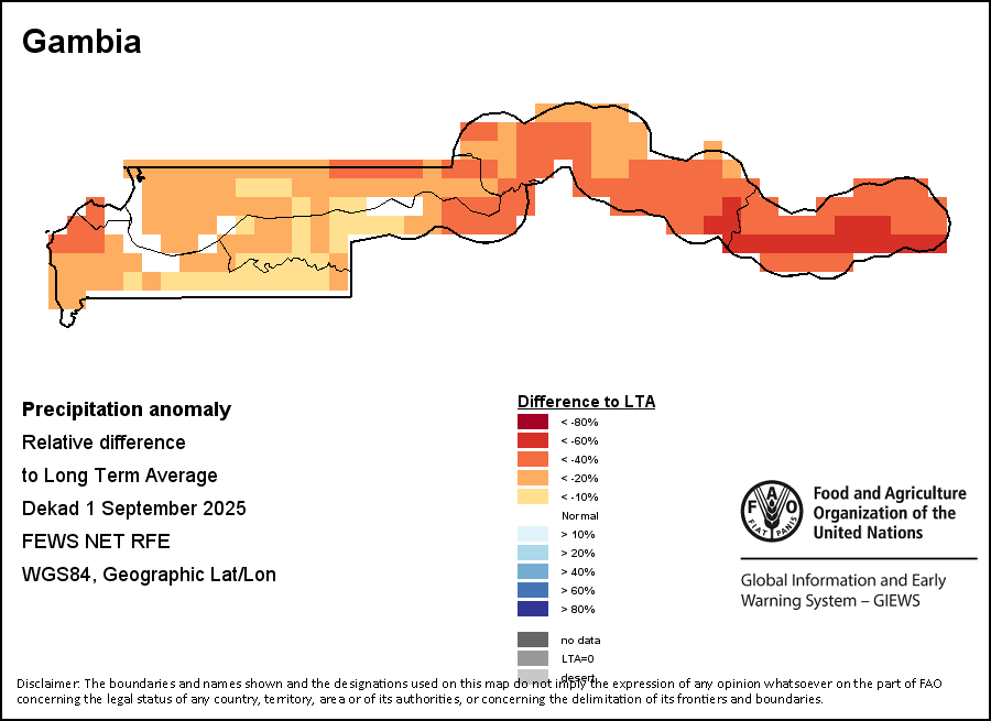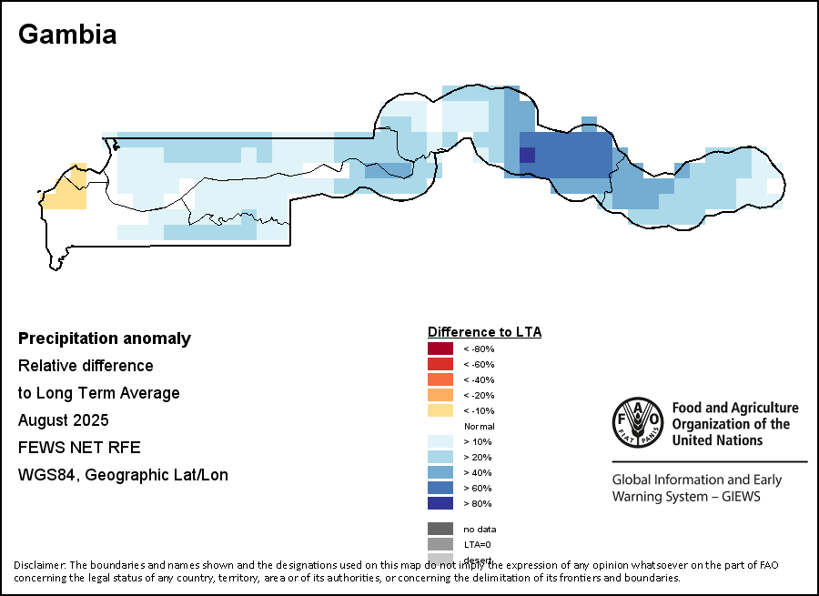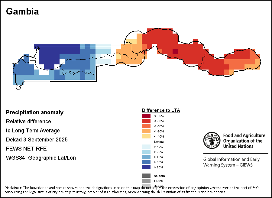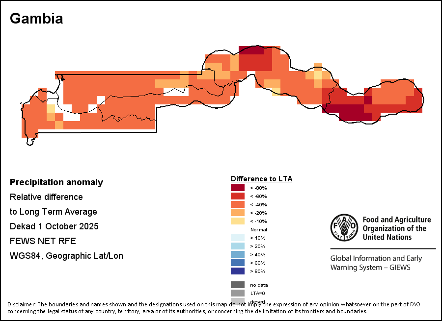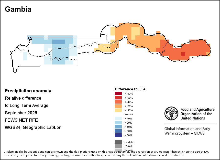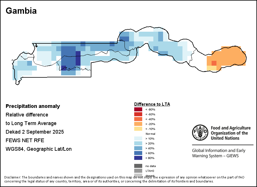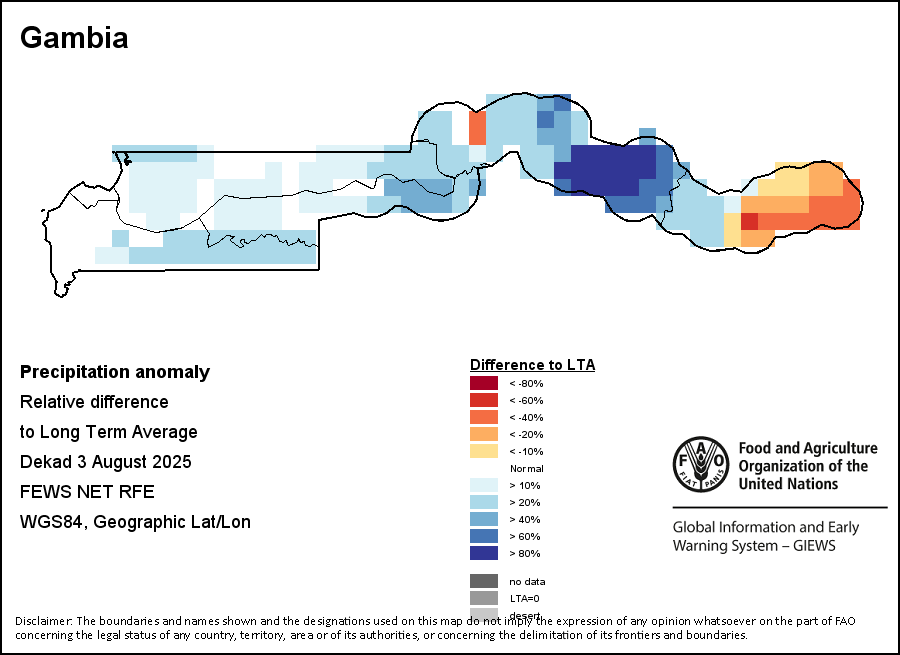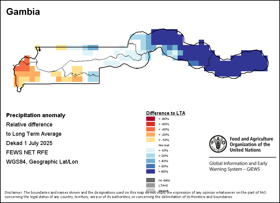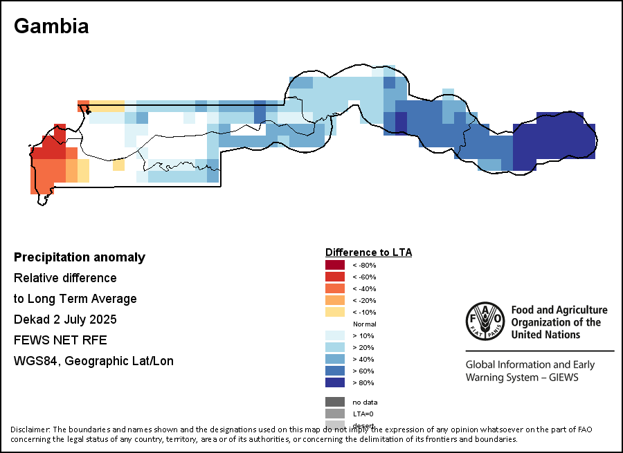 The map illustrates the difference between the current rainfall volume and the average level. Rainfall levels are compared with the Long-Term Average (LTA), which refers to the period 1989-2015. Warmer colours identify areas which have received lower-than-average rainfall, while colder colours are given to areas where precipitation has been above average.
