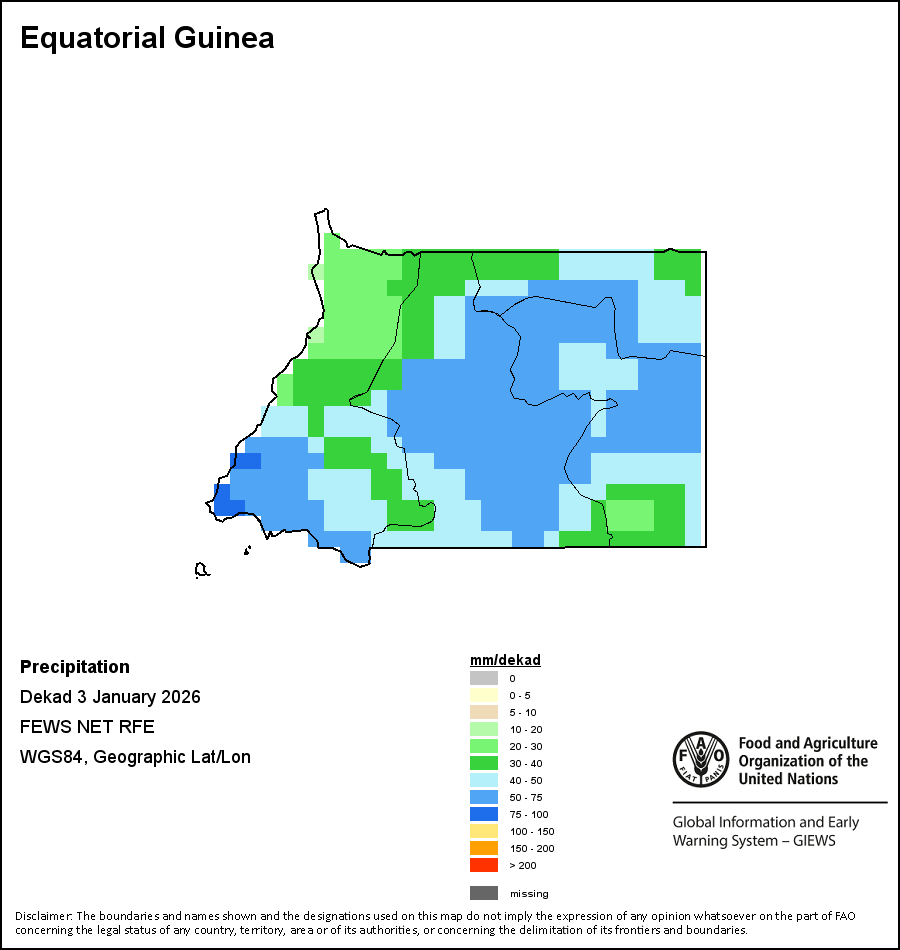 该图谱显示了每一旬(十天)的累积降水量。 所有非洲国家的降水量估算(除佛得角和毛里求斯外)均取自NOAA/FEWSNet,其他国家则取自ECMWF。