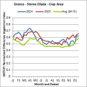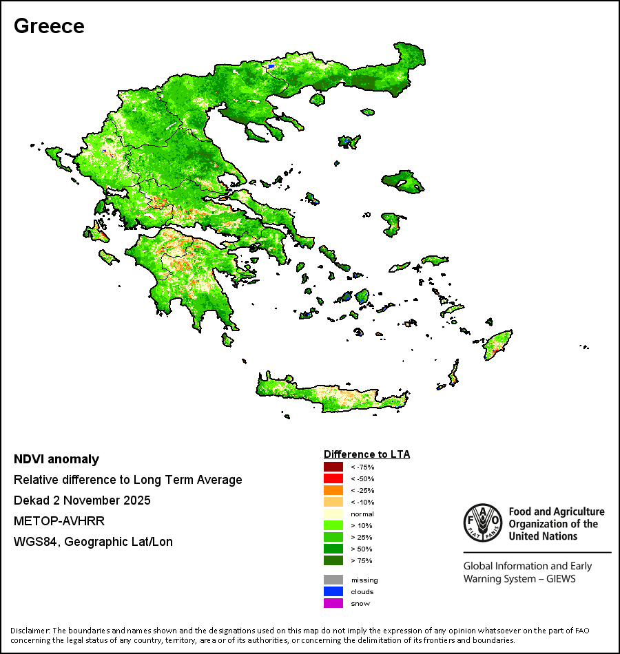 The Normalized Difference Vegetation Index (NDVI) measures the “greenness” of ground cover and is used as a proxy to indicate the density and health of vegetation. NDVI values range from +1 to -1, with high positive values corresponding to dense and healthy vegetation, and low and/or negative NDVI values indicating poor vegetation conditions or sparse vegetative cover. The NDVI anomaly indicates the variation of the current dekad to the long-term average, where a positive value (for example 20 percent) would signify enhanced vegetation conditions compared to the average, while a negative value (for instance -40 percent) would indicate comparatively poor vegetation conditions.