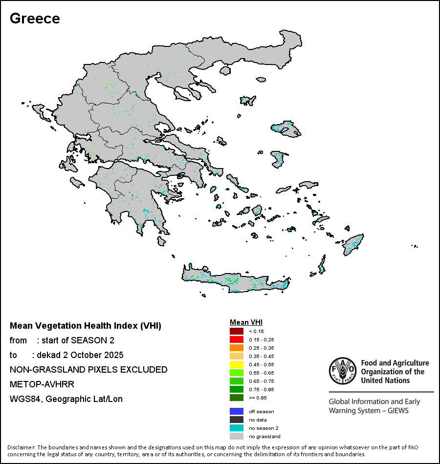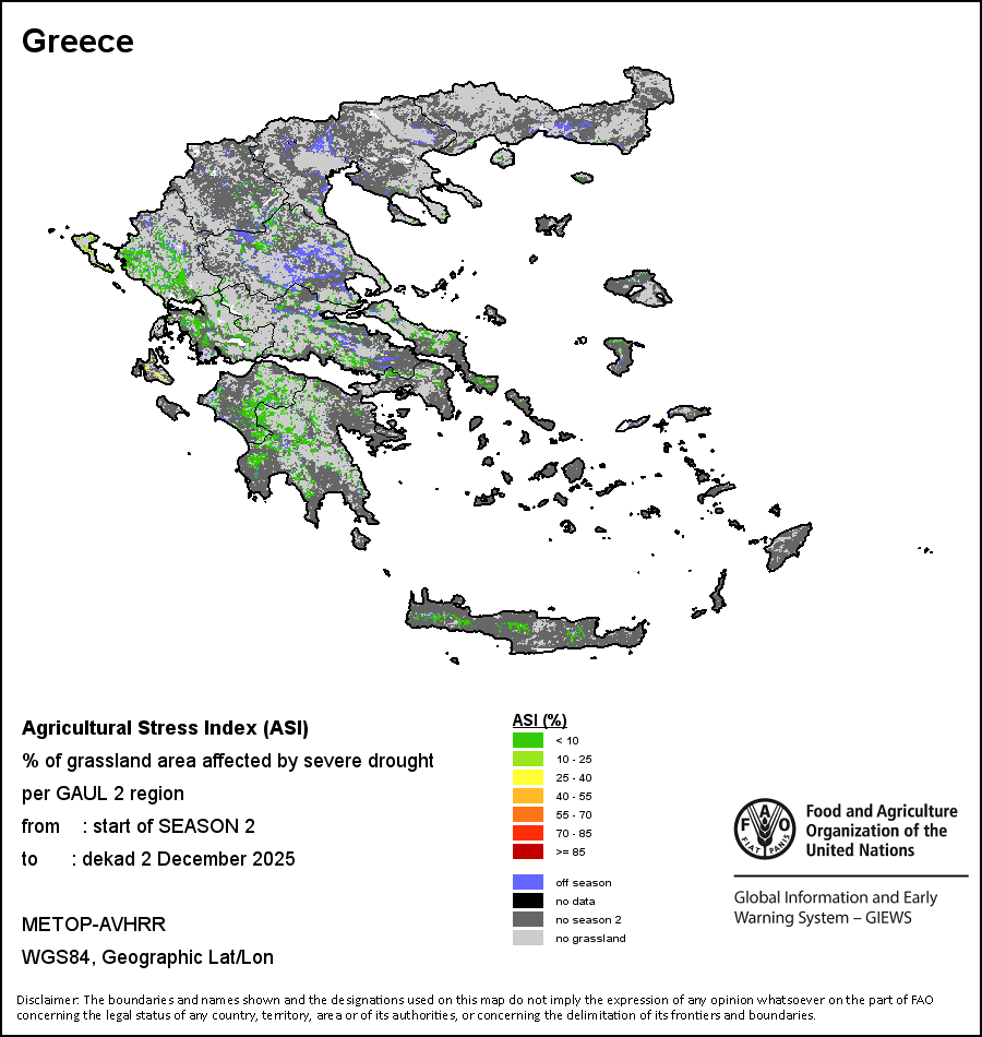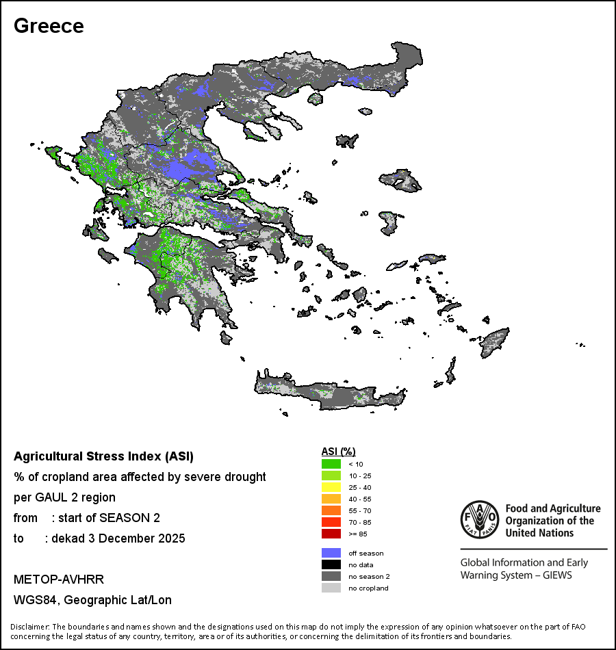 The Agricultural Stress Index (ASI) is a quick-look indicator that facilitates the early identification of cropped land with a high likelihood of water stress (drought). The Index is based on the integration of the Vegetation Health Index (VHI) in two dimensions that are critical in the assessment of a drought event in agriculture: temporal and spatial. The first step of the ASI calculation is a temporal averaging of the VHI, assessing the intensity and duration of dry periods occurring during the crop cycle at the pixel level; this calculation includes the use of crop coefficients, which introduces sensitivity of a crop to water stress during each phenological phase. The second step determines the spatial extent of drought events by calculating the percentage of pixels in arable areas with a VHI value below 35 percent (this value was identified as a critical threshold in assessing the extent of drought in previous research by Kogan, 1995). Each administrative area is classified according to the percentage of the affected area to facilitate the quick interpretation of results.