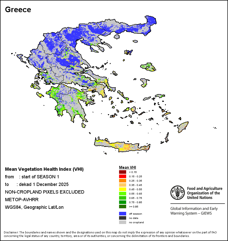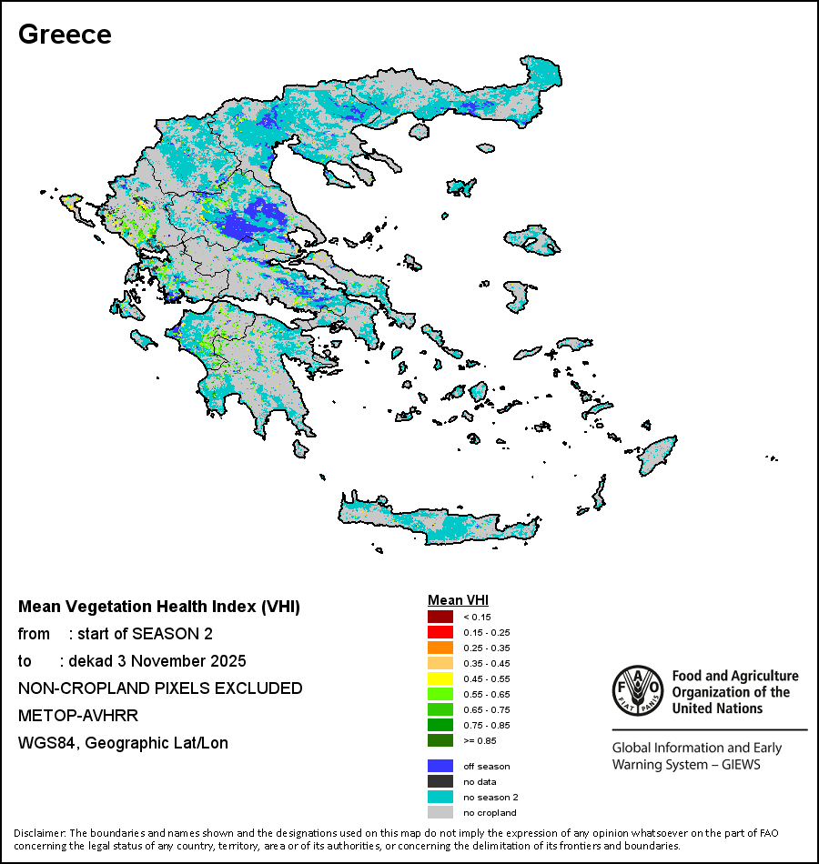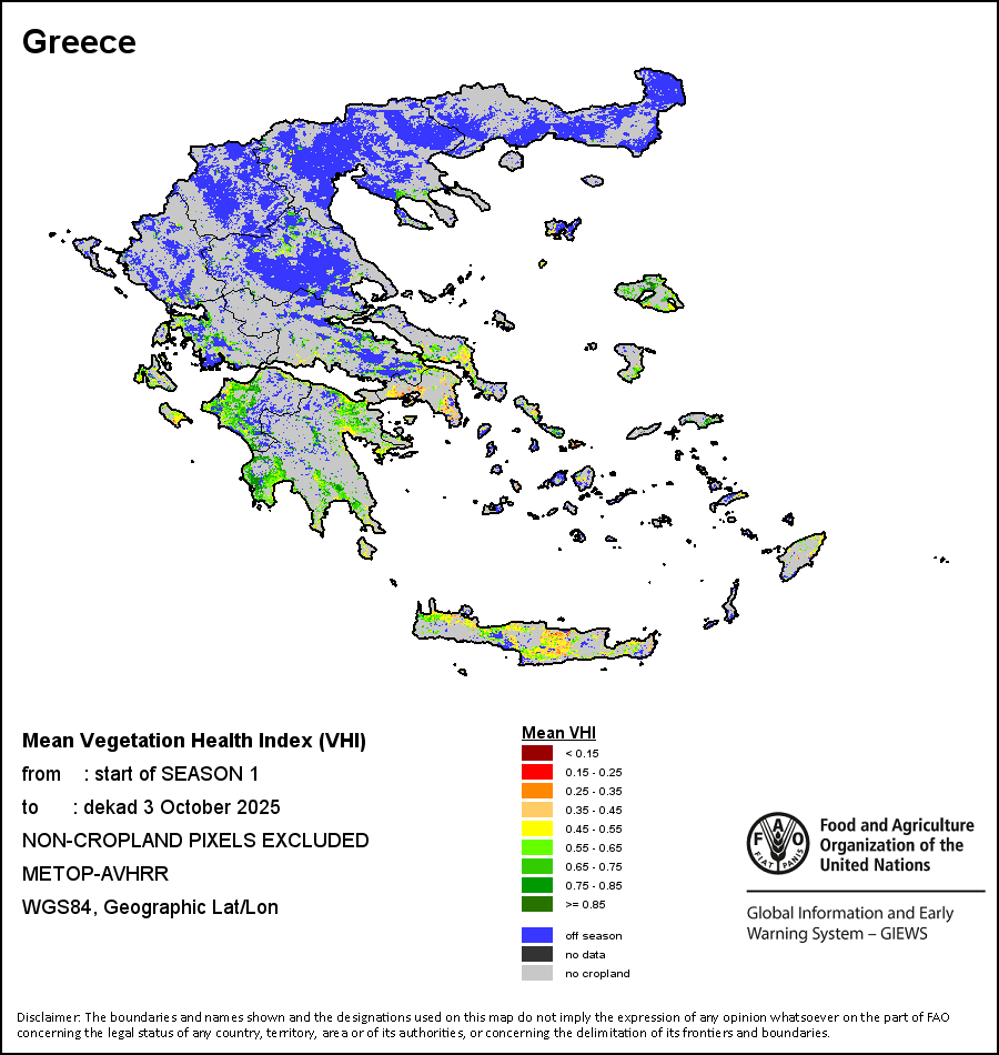 The Weighted Mean Vegetation Health Index (Weighted Mean VHI) allows the user to assess the severity of the drought from the start of the growing season, examining the vegetation health and the influence of temperature on plant conditions. The Mean VHI is an average of the dekadal VHI values over the crop growing season (from the start until the last dekad of analysis), weighted by crop coefficients (Kc), assigned to VHI values at the dekads corresponding to the Start of the Season (SOS), Maximum of the Season (MOS) and End of the Season (EOS). Crop coefficient is applied for the purpose of reflecting the crop’s water sensitivity at different phenology stages.