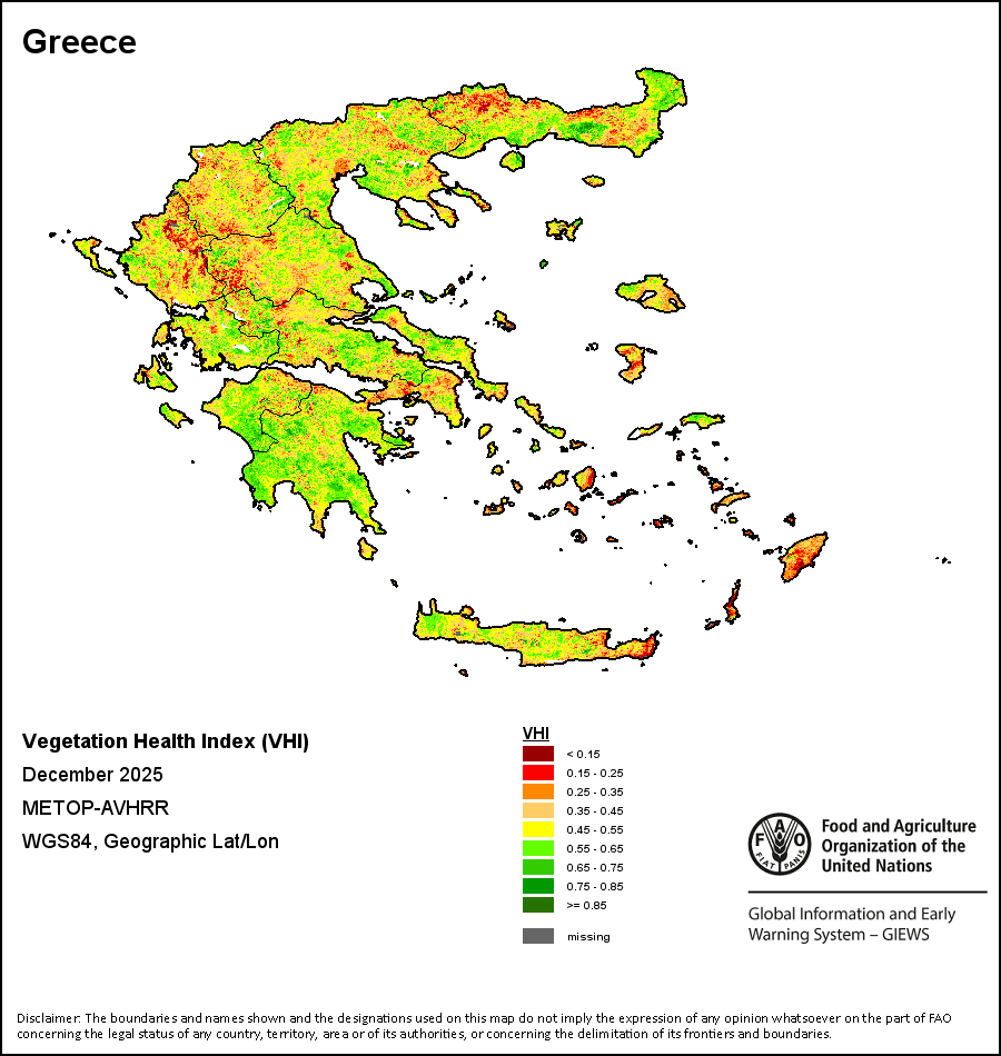 Agricultural droughts are classified by their intensity and are categorized into four classes: Extreme, Severe, Moderate or Mild. The intensity of the drought is calculated through the Weighted Mean Vegetation Health Index aggregated per GAUL 2 region, indicating that the poorer the vegetation health the more severe the drought.
