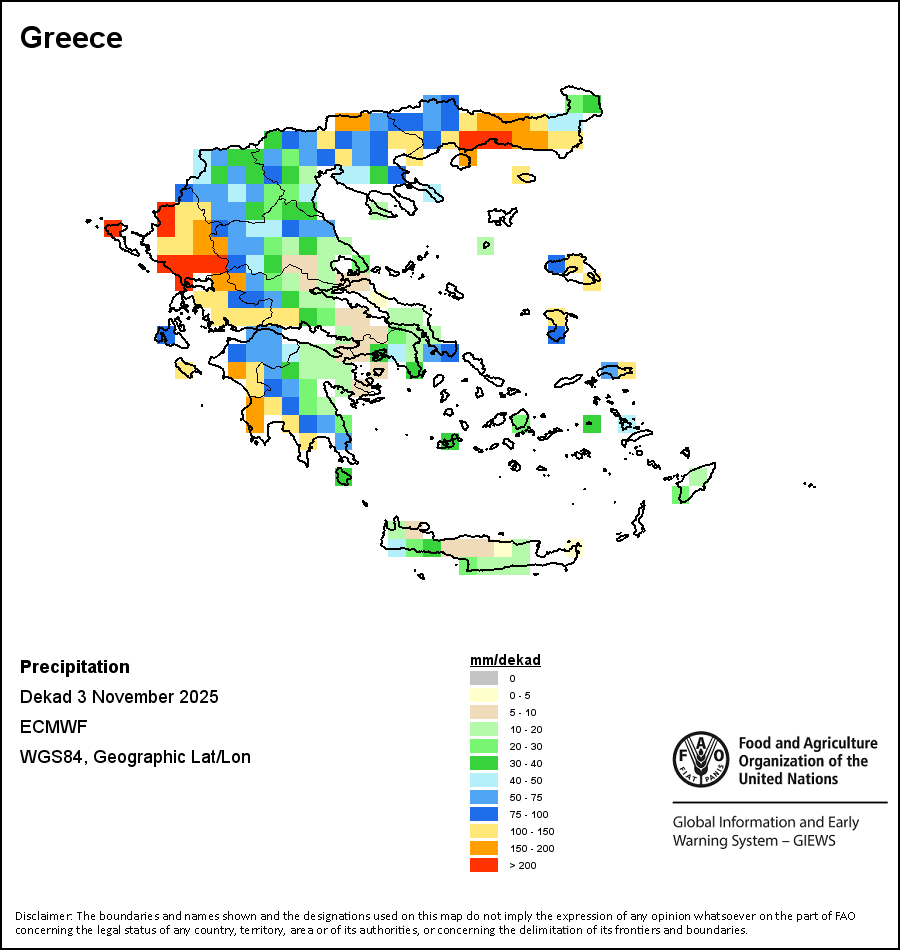 The map depicts cumulative rainfall volumes over a dekad (a 10-day period). Precipitation estimates for all African countries (except Cabo Verde and Mauritius) are taken from NOAA/FEWSNet, while for the remaining countries data is obtained from ECMWF.