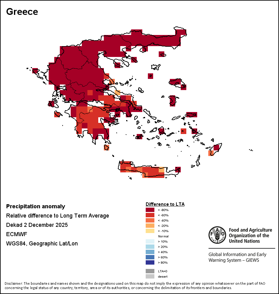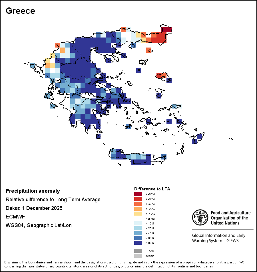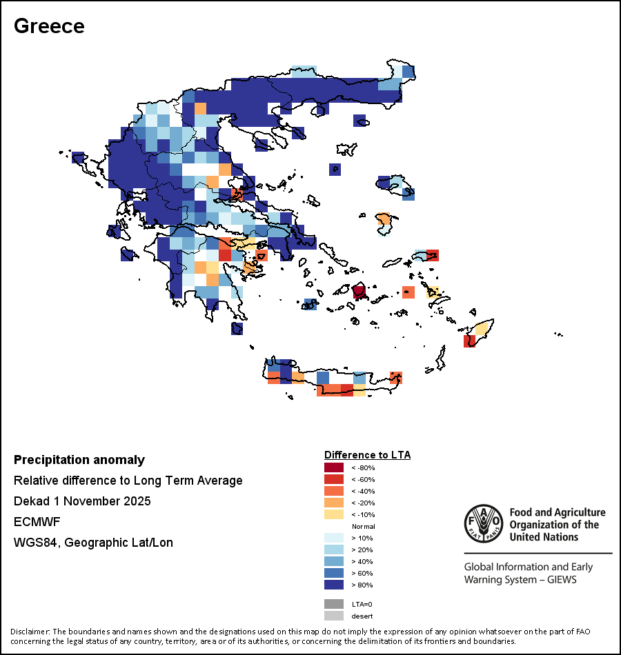 The map illustrates the difference between the current rainfall volume and the average level. Rainfall levels are compared with the Long-Term Average (LTA), which refers to the period 1989-2015. Warmer colours identify areas which have received lower-than-average rainfall, while colder colours are given to areas where precipitation has been above average.