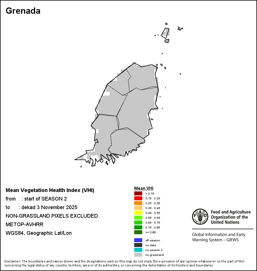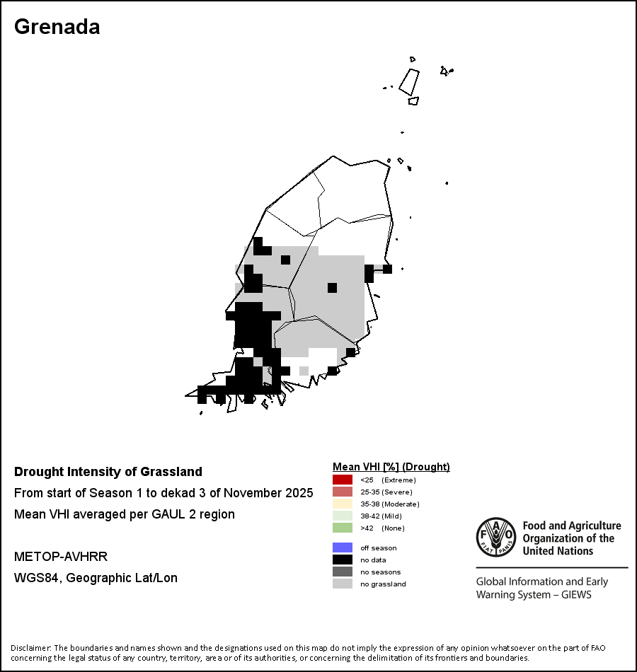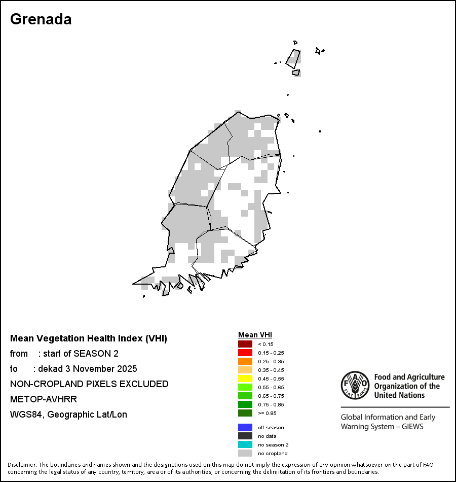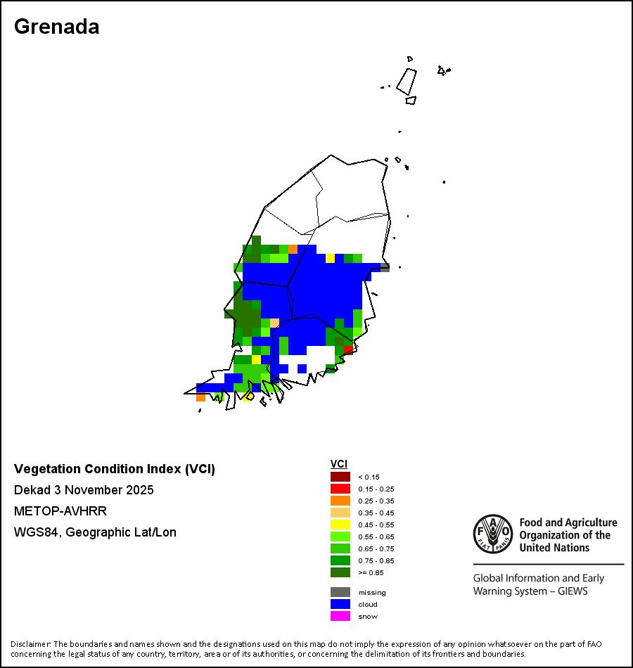 The country level maps and graphs depict the latest 36-month period of the seasonal, vegetation and precipitation indicators. The data is presented by dekad and month. All three vegetation indicators are based on 10-day (dekadal) vegetation data from the METOP-AVHRR sensor at 1 km resolution (2007 and after). Data at 1 km resolution for the period 1984-2006 are derived from the NOAA-AVHRR dataset at 16 km resolution. Precipitation estimates for all African countries (except Cabo Verde and Mauritius) are taken from NOAA/FEWSNet (16 km resolution), while for the remaining countries data is obtained from ECMWF (25 km resolution). Owing to the higher resolution of vegetation indicators (e.g., NDVI, VHI) compared to coarser precipitation indicators, the number of sub-national units for which valid zonal statistics can be generated for vegetation indices is greater than the number of units for precipitation indicators for certain countries.