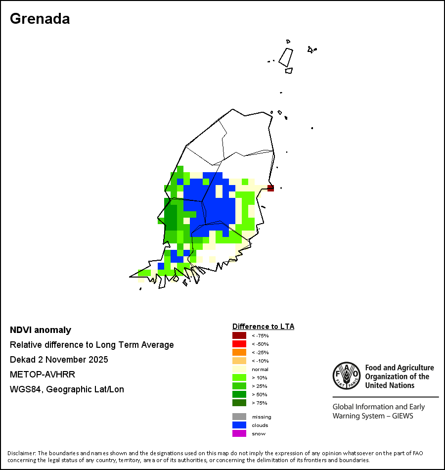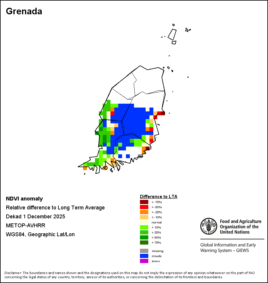 The Normalized Difference Vegetation Index (NDVI) measures the “greenness” of ground cover and is used as a proxy to indicate the density and health of vegetation. NDVI values range from +1 to -1, with high positive values corresponding to dense and healthy vegetation, and low and/or negative NDVI values indicating poor vegetation conditions or sparse vegetative cover. The NDVI anomaly indicates the variation of the current dekad to the long-term average, where a positive value (for example 20 percent) would signify enhanced vegetation conditions compared to the average, while a negative value (for instance -40 percent) would indicate comparatively poor vegetation conditions.
