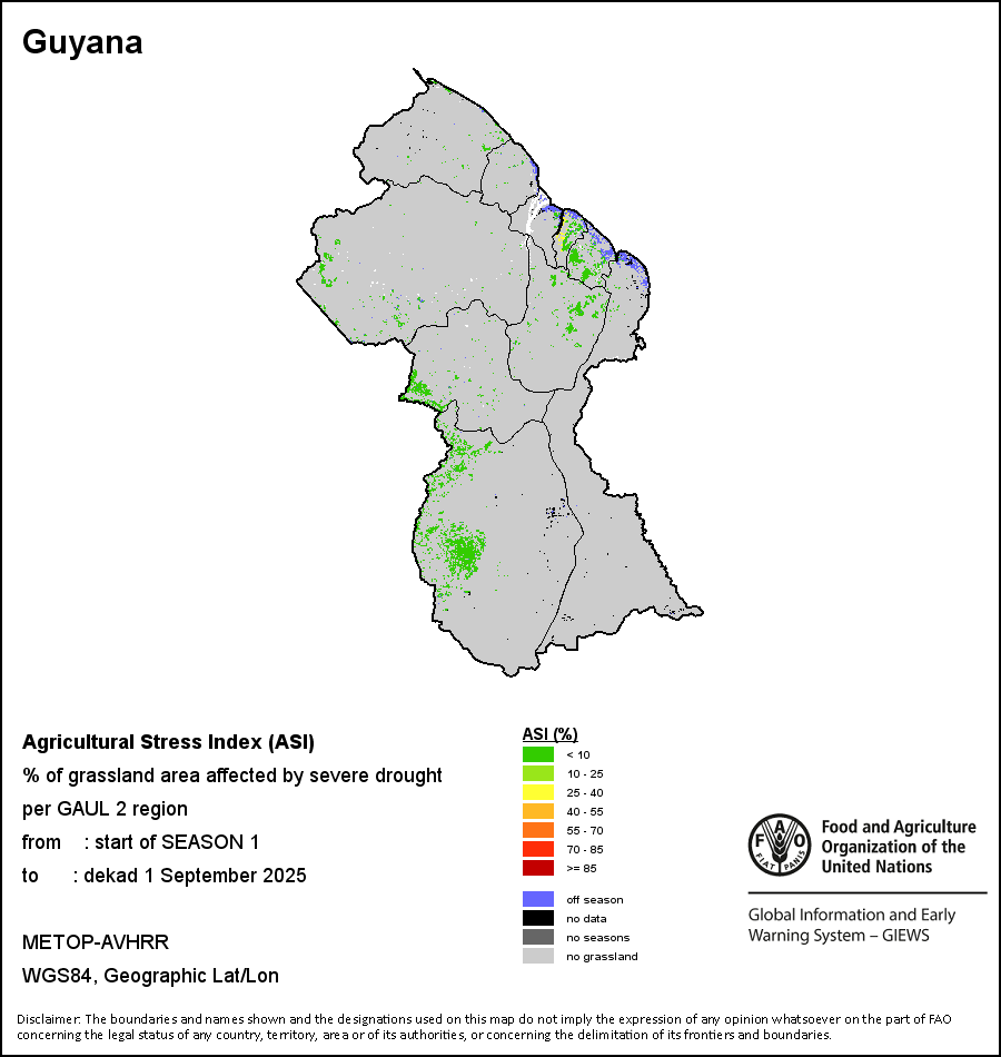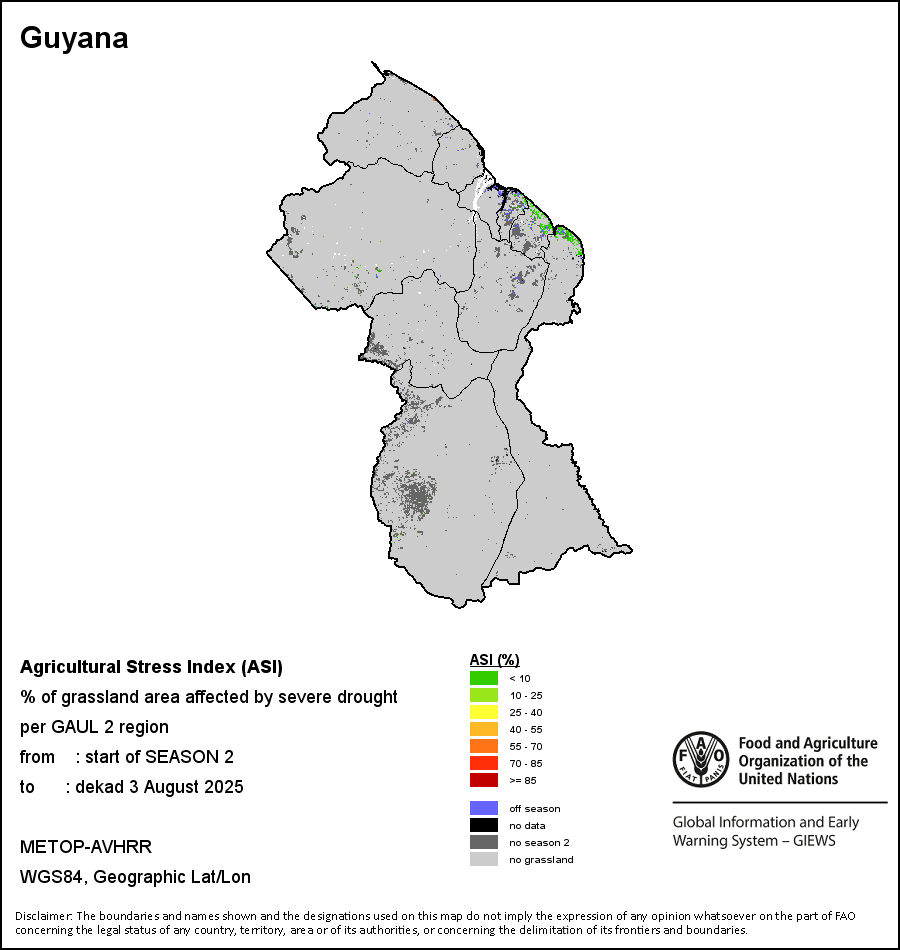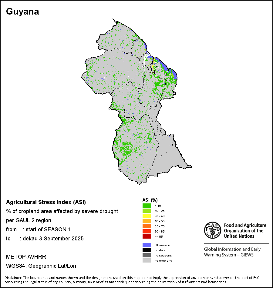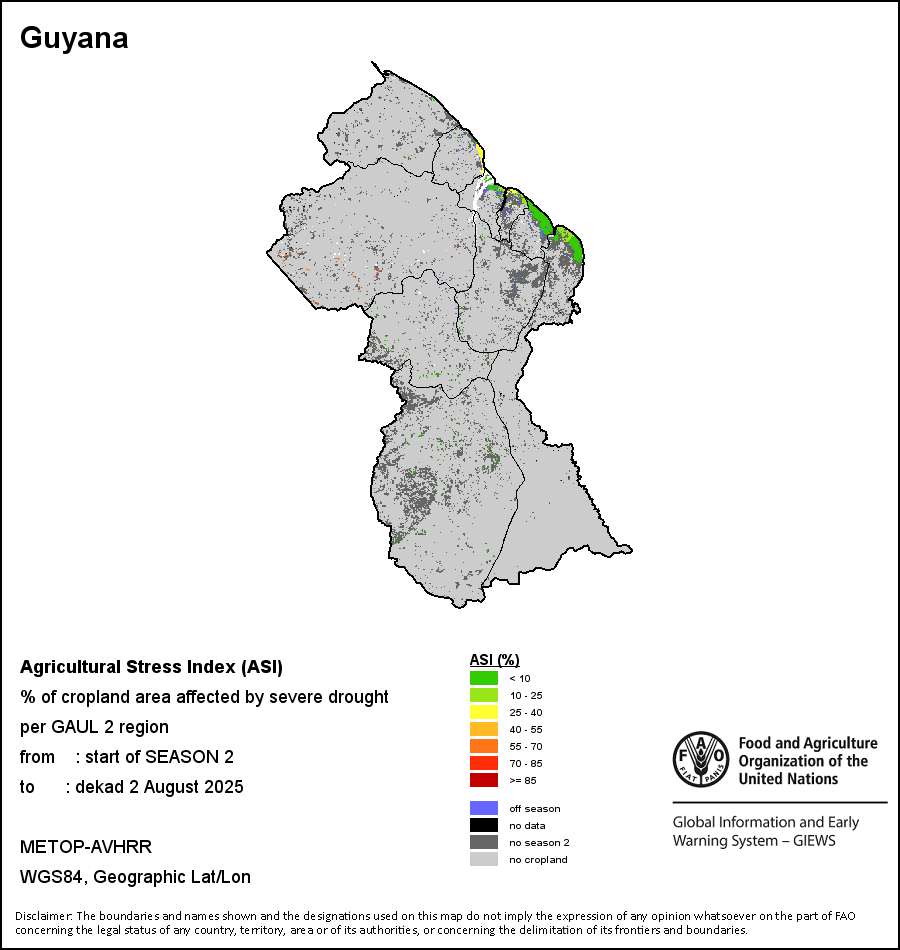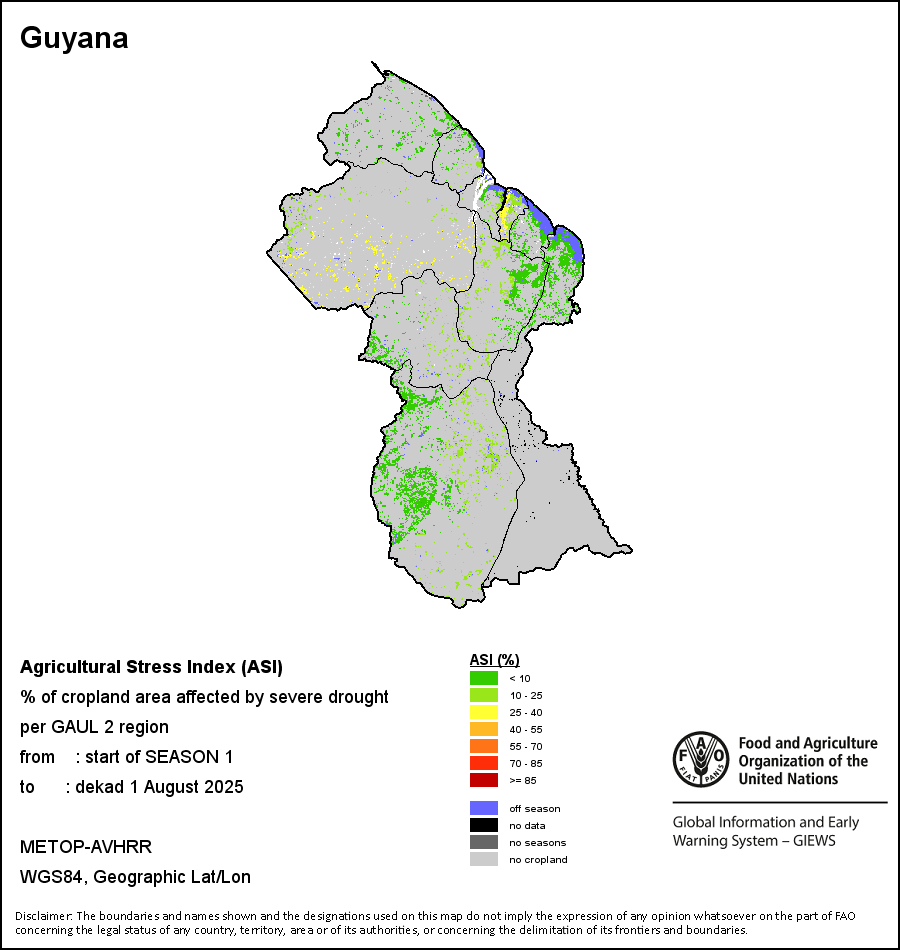 The Agricultural Stress Index (ASI) is a quick-look indicator that facilitates the early identification of cropped land with a high likelihood of water stress (drought). The Index is based on the integration of the Vegetation Health Index (VHI) in two dimensions that are critical in the assessment of a drought event in agriculture: temporal and spatial. The first step of the ASI calculation is a temporal averaging of the VHI, assessing the intensity and duration of dry periods occurring during the crop cycle at the pixel level; this calculation includes the use of crop coefficients, which introduces sensitivity of a crop to water stress during each phenological phase. The second step determines the spatial extent of drought events by calculating the percentage of pixels in arable areas with a VHI value below 35 percent (this value was identified as a critical threshold in assessing the extent of drought in previous research by Kogan, 1995). Each administrative area is classified according to the percentage of the affected area to facilitate the quick interpretation of results.