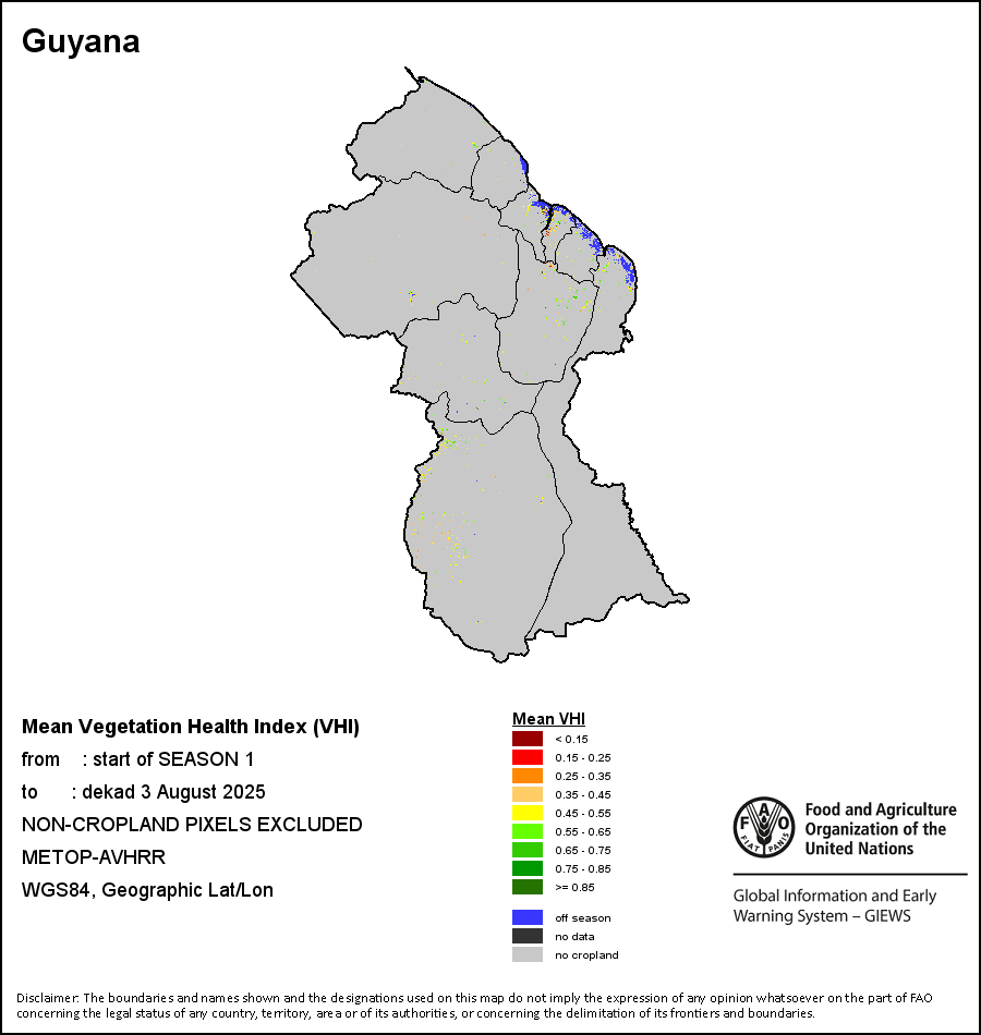 The Weighted Mean Vegetation Health Index (Weighted Mean VHI) allows the user to assess the severity of the drought from the start of the growing season, examining the vegetation health and the influence of temperature on plant conditions. The Mean VHI is an average of the dekadal VHI values over the crop growing season (from the start until the last dekad of analysis), weighted by crop coefficients (Kc), assigned to VHI values at the dekads corresponding to the Start of the Season (SOS), Maximum of the Season (MOS) and End of the Season (EOS). Crop coefficient is applied for the purpose of reflecting the crop’s water sensitivity at different phenology stages.