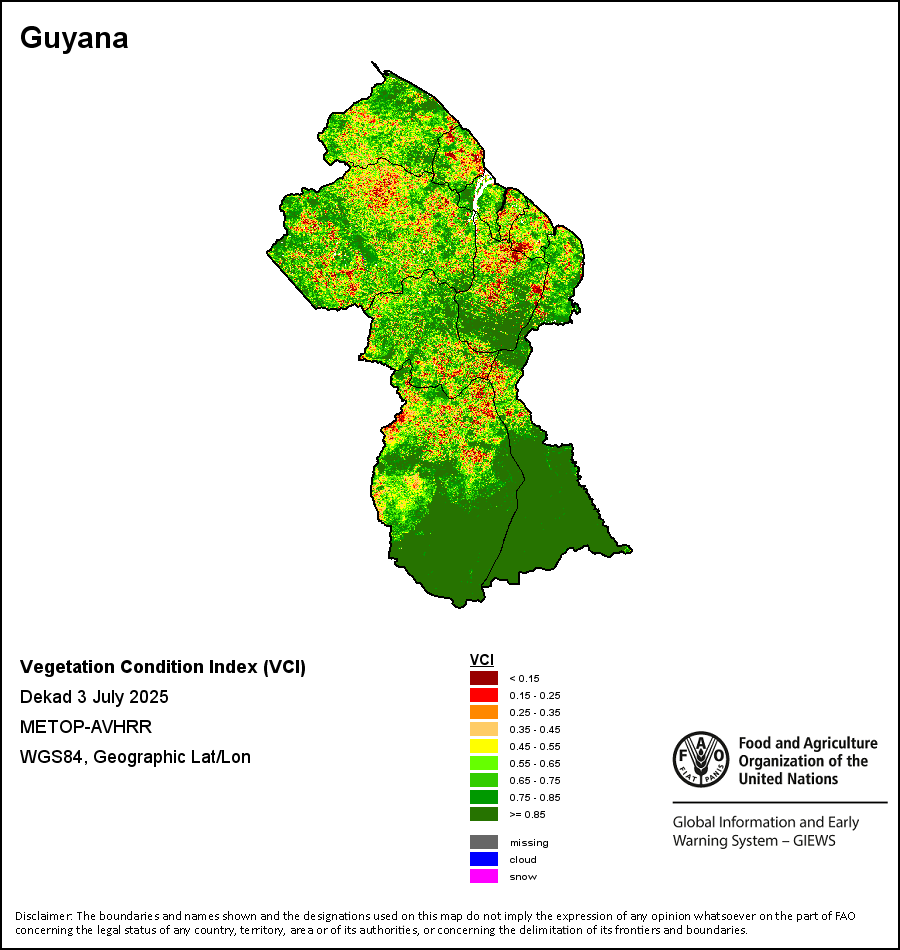 The Vegetation Condition Index (VCI) evaluates the current vegetation health in comparison to the historical trends. The VCI relates current dekadal Normalized Difference Vegetation Index (NDVI) to its long-term minimum and maximum, normalized by the historical range of NDVI values for the same dekad. The VCI was designed to separate the weather-related component of the NDVI from the ecological element.