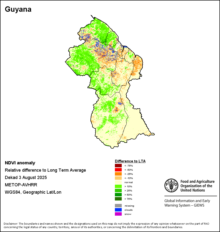 The Normalized Difference Vegetation Index (NDVI) measures the “greenness” of ground cover and is used as a proxy to indicate the density and health of vegetation. NDVI values range from +1 to -1, with high positive values corresponding to dense and healthy vegetation, and low and/or negative NDVI values indicating poor vegetation conditions or sparse vegetative cover. The NDVI anomaly indicates the variation of the current dekad to the long-term average, where a positive value (for example 20 percent) would signify enhanced vegetation conditions compared to the average, while a negative value (for instance -40 percent) would indicate comparatively poor vegetation conditions.