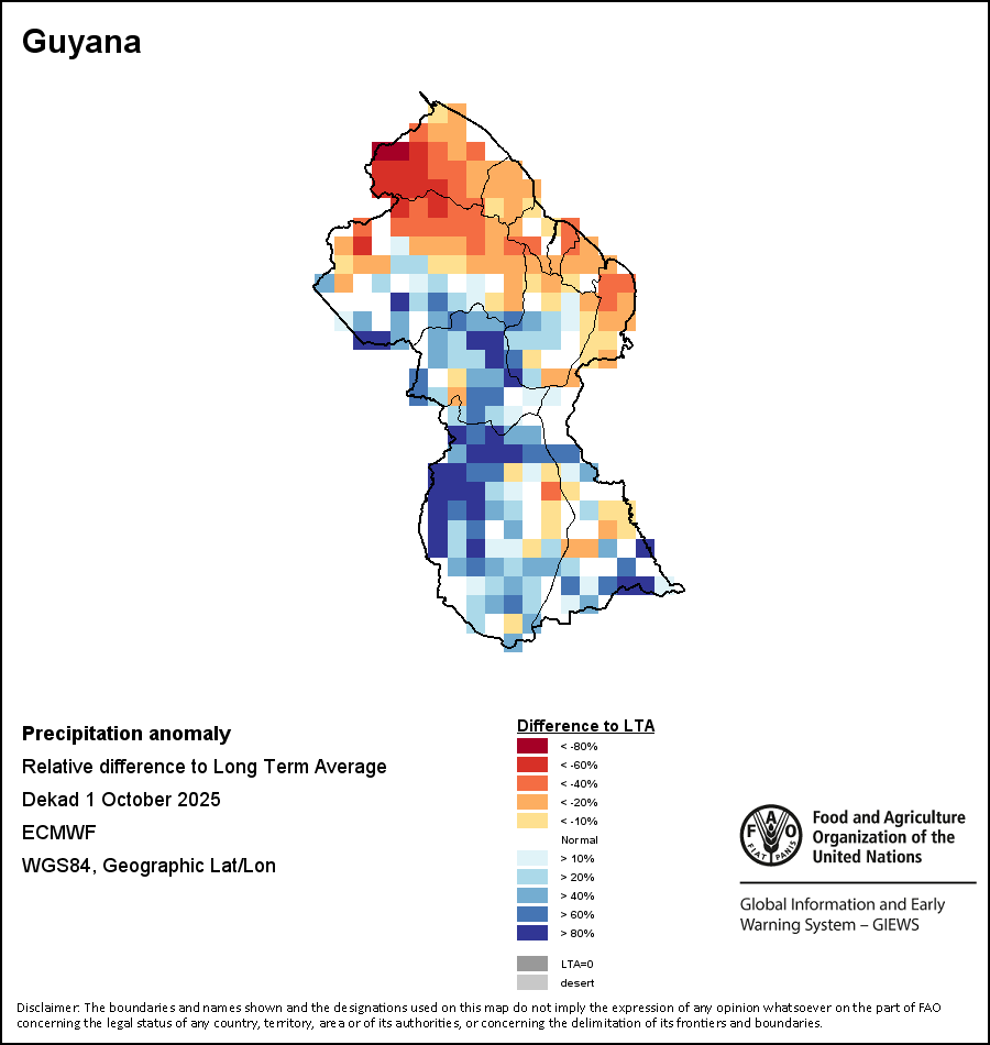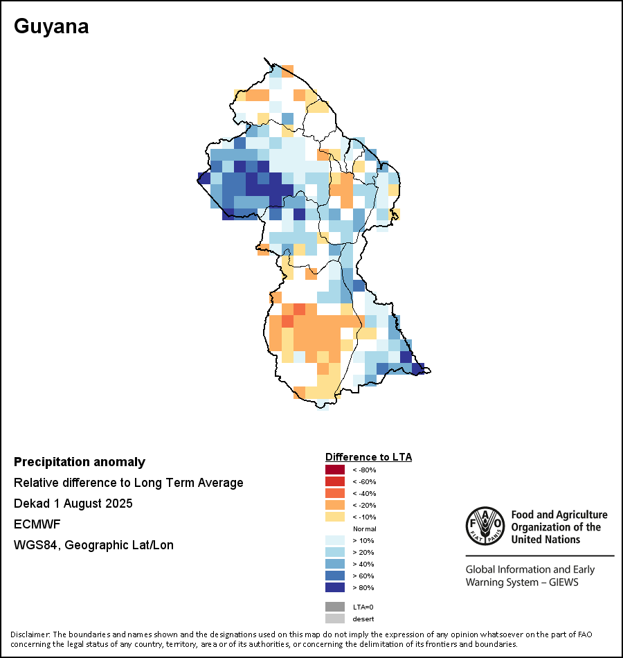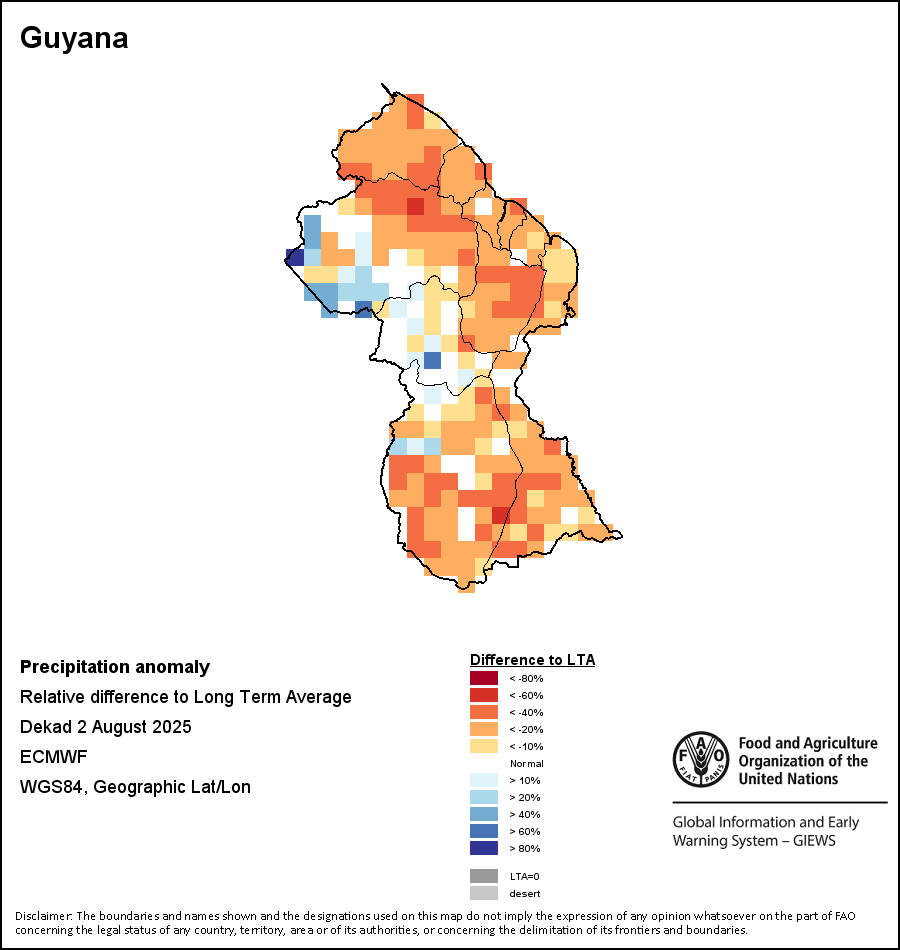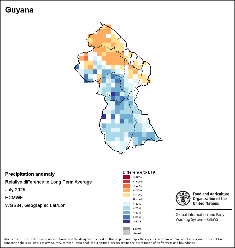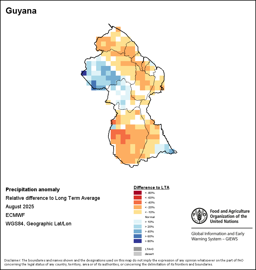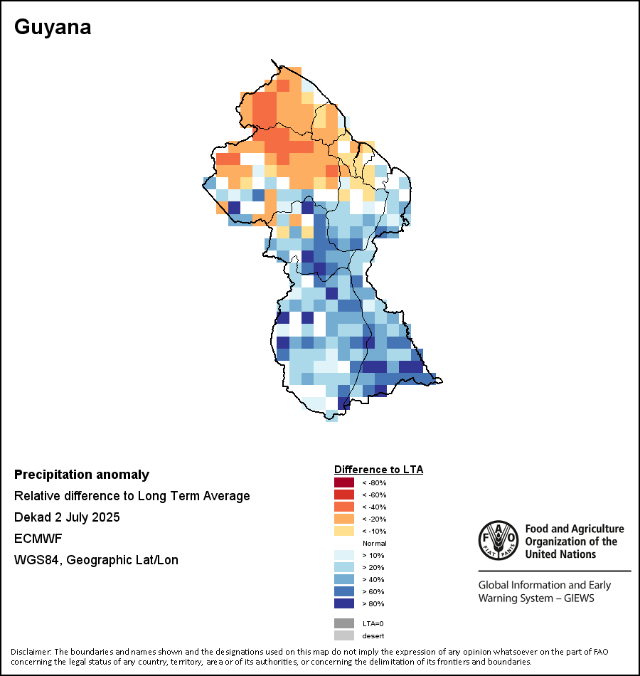 The map illustrates the difference between the current rainfall volume and the average level. Rainfall levels are compared with the Long-Term Average (LTA), which refers to the period 1989-2015. Warmer colours identify areas which have received lower-than-average rainfall, while colder colours are given to areas where precipitation has been above average.