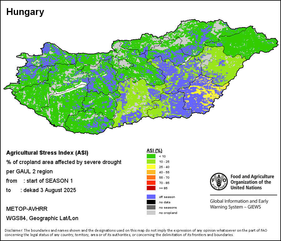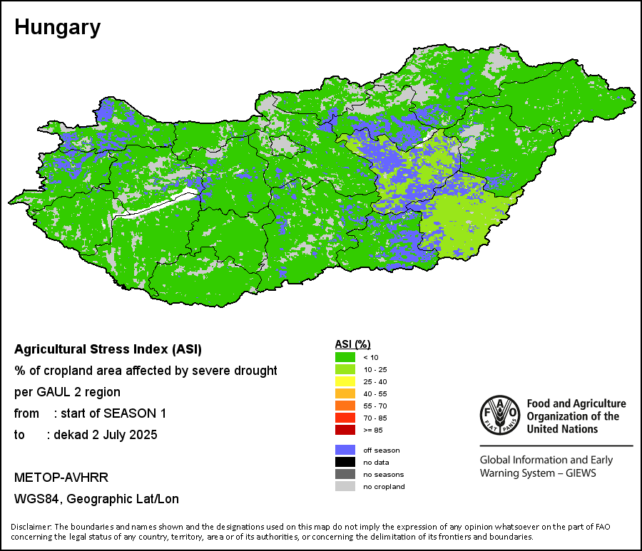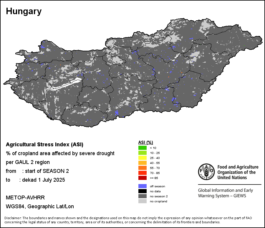 农业干旱胁迫指数(ASI)是一项速览指数,有助于在早期甄别较大可能发生水胁迫(干旱)的耕地。 该指数通过整合植被健康指数(VHI)在评估农业旱情方面具有关键意义的两个维度,即时间和空间维度,而得出。计算农业干旱胁迫指数的第一步是求植被健康指数的时间平均值,对作物周期内旱情的强度和时长进行像素级评估;这项计算包括采用作物系数衡量某种作物在各物候阶段对干旱胁迫的敏感度。第二步是确定旱情的空间广度,方法是计算植被健康指数值低于35%(Kogan前期研究将这一数值确定为评估干旱程度的临界值,1995年)的耕地的像素百分比。然后把各个行政区域根据受影响面积的百分比进行划分,便于对结果进行快速解读。