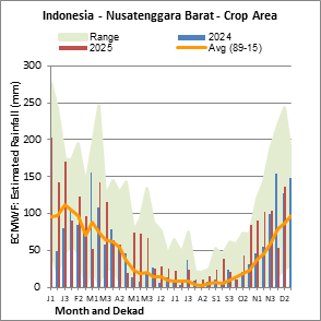 The Normalized Difference Vegetation Index (NDVI) measures the “greenness” of ground cover and is used as a proxy to indicate the density and health of vegetation. NDVI values range from +1 to -1, with high positive values corresponding to dense and healthy vegetation, and low and/or negative NDVI values indicating poor vegetation conditions or sparse vegetative cover. The NDVI anomaly indicates the variation of the current dekad to the long-term average, where a positive value (for example 20 percent) would signify enhanced vegetation conditions compared to the average, while a negative value (for instance -40 percent) would indicate comparatively poor vegetation conditions.