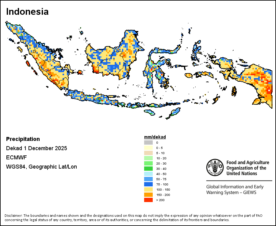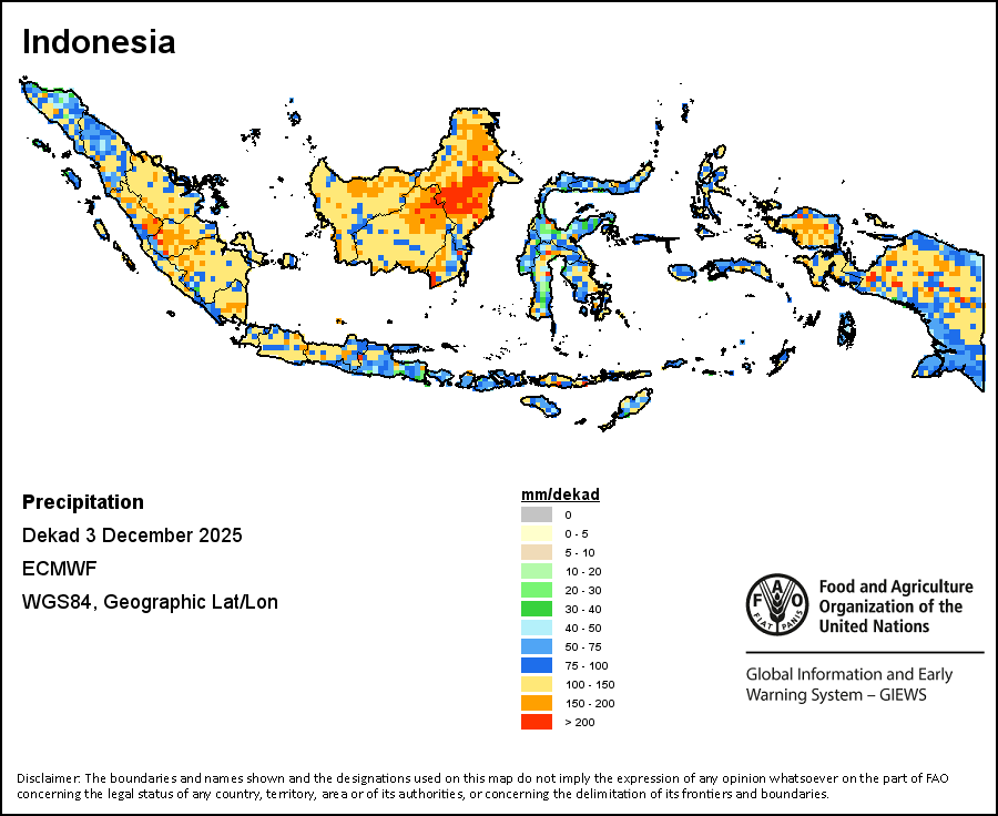 The map depicts cumulative rainfall volumes over a dekad (a 10-day period). Precipitation estimates for all African countries (except Cabo Verde and Mauritius) are taken from NOAA/FEWSNet, while for the remaining countries data is obtained from ECMWF.
