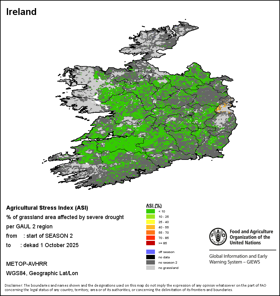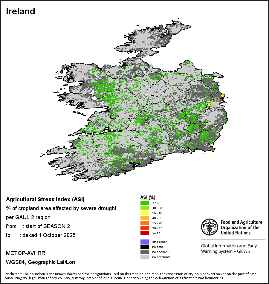 L'indice de stress hydrique (ASI – Agricultural Stress Index) est un indicateur qui facilite l'identification précoce des terres cultivées souffrant probablement de stress hydrique (sécheresse). L’indice se base sur l'Indice de santé de la végétation (VHI – Vegetation Health Index) auquel sont intégrées les dimensions espace-temps, essentielles pour évaluer un épisode de sécheresse dans le contexte agricole. La première étape du calcul de l’ASI consiste à établir une moyenne temporelle du VHI, en évaluant l'intensité et la durée des périodes de sécheresse se produisant pendant le cycle de culture au niveau du pixel; ce calcul comprend l'utilisation de coefficients de culture, qui permettent de tenir compte de la sensibilité d’une culture au stress hydrique pendant chaque phase phénologique. La deuxième étape consiste à déterminer l'étendue spatiale des épisodes de sécheresse en calculant le pourcentage de pixels dans les zones arables pour lequel la valeur du VHI est inférieure à 35 pour cent (cette valeur a été identifiée comme seuil critique dans l'évaluation de l'étendue de la sécheresse lors de précédentes recherches, Kogan, 1995). Enfin, chaque zone administrative est classée selon son pourcentage de superficie touchée afin de faciliter une interprétation rapide des résultats.