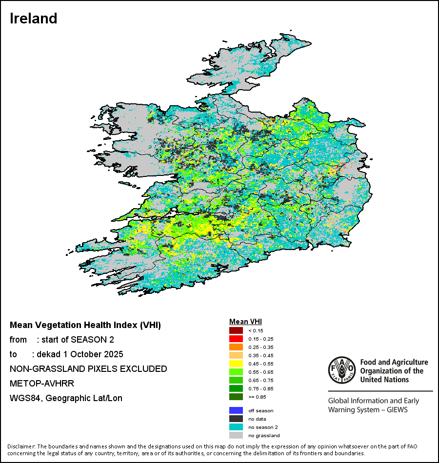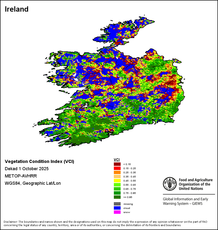 L'indicateur de santé de la végétation (VHI – Vegetation Health Index) illustre la gravité des sécheresses en se fondant sur l'état de la végétation et l'influence des températures sur les conditions des plantes. Le VHI est un indice composite et l'indicateur primaire utilisé pour calculer l’ASI. Les composantes du VHI (VCI et TCI) reçoivent la même pondération dans le calcul de l'indice. Il combine à la fois le VCI et l'Indice des conditions de température (TCI – Temperature Condition Index). Le TCI est calculé à l’aide d’une équation similaire au VCI, mais rapporte les températures actuelles à leur maximum et minimum à long terme, en supposant qu’une élévation des températures tend à provoquer une détérioration des conditions de la végétation. Une diminution du VHI indique, par exemple, un état de la végétation relativement mauvais et une augmentation des températures, ce qui signifie que les conditions de végétation sont soumises à un stress, voire une sécheresse sur une période longue. Les données du VHI sont calculées pour les deux principales campagnes et sous trois formes: décadaires, mensuelles et annuelles.
