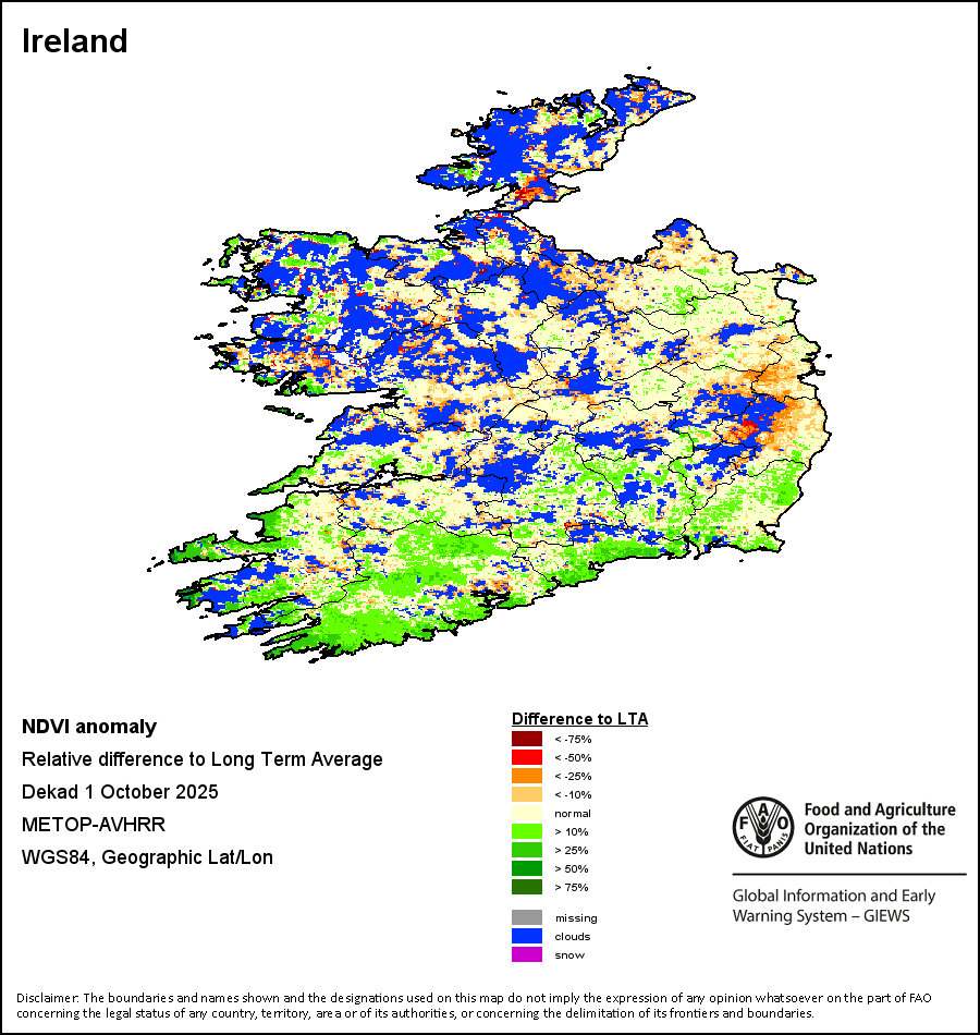 L'indice de végétation par différence normalisé (NDVI – Normalized Difference Vegetation Index) mesure la "verdeur" de la couverture du sol, et est utilisé comme indicateur de la densité et de l’état de la végétation. Les valeurs du NDVI varient de +1 à -1, plus les valeurs positives sont élevées plus la végétation est dense et en bonne santé, tandis que des valeurs faibles et/ou négatives du NDVI indiquent une végétation en mauvaises conditions ou une couverture végétale clairsemée. L’écart NDVI indique la variation de la décade actuelle par rapport à la moyenne à long terme. Une valeur positive (par exemple 20 pour cent) indique une amélioration des conditions de végétation par rapport à la moyenne, tandis qu'une valeur négative (par exemple -40 pour cent) signale des conditions de végétation relativement mauvaises.