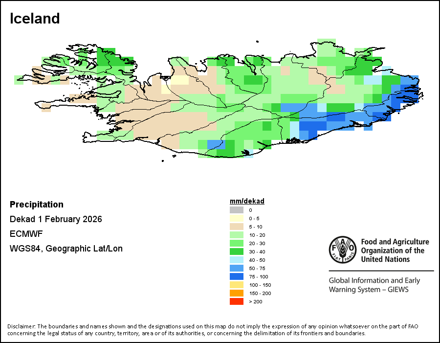 La carte illustre les volumes cumulés de précipitations au cours d’une décade (une période de 10 jours). Les estimations concernant les précipitations pour tous les pays africains (à l'exception du Cap Vert et de Maurice) proviennent du NOAA/FEWSNet, tandis que les données concernant les autres pays sont obtenues à partir du CEPMMT.